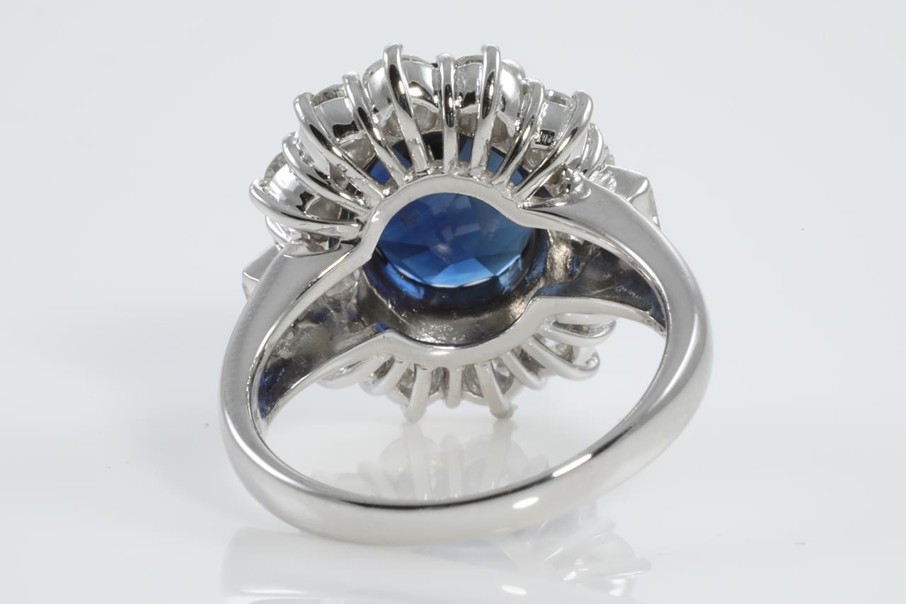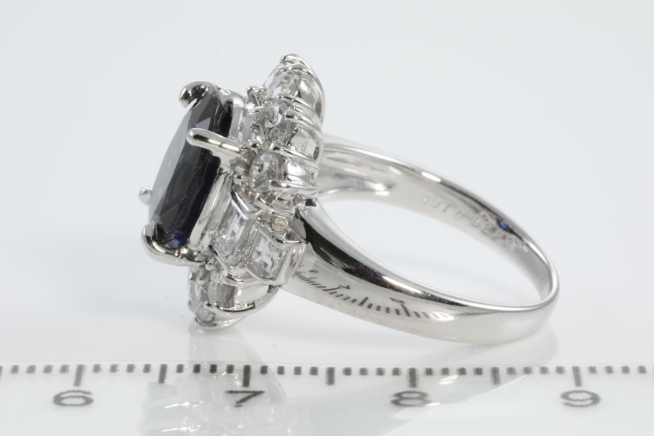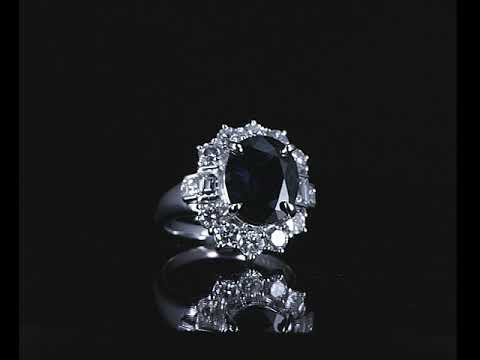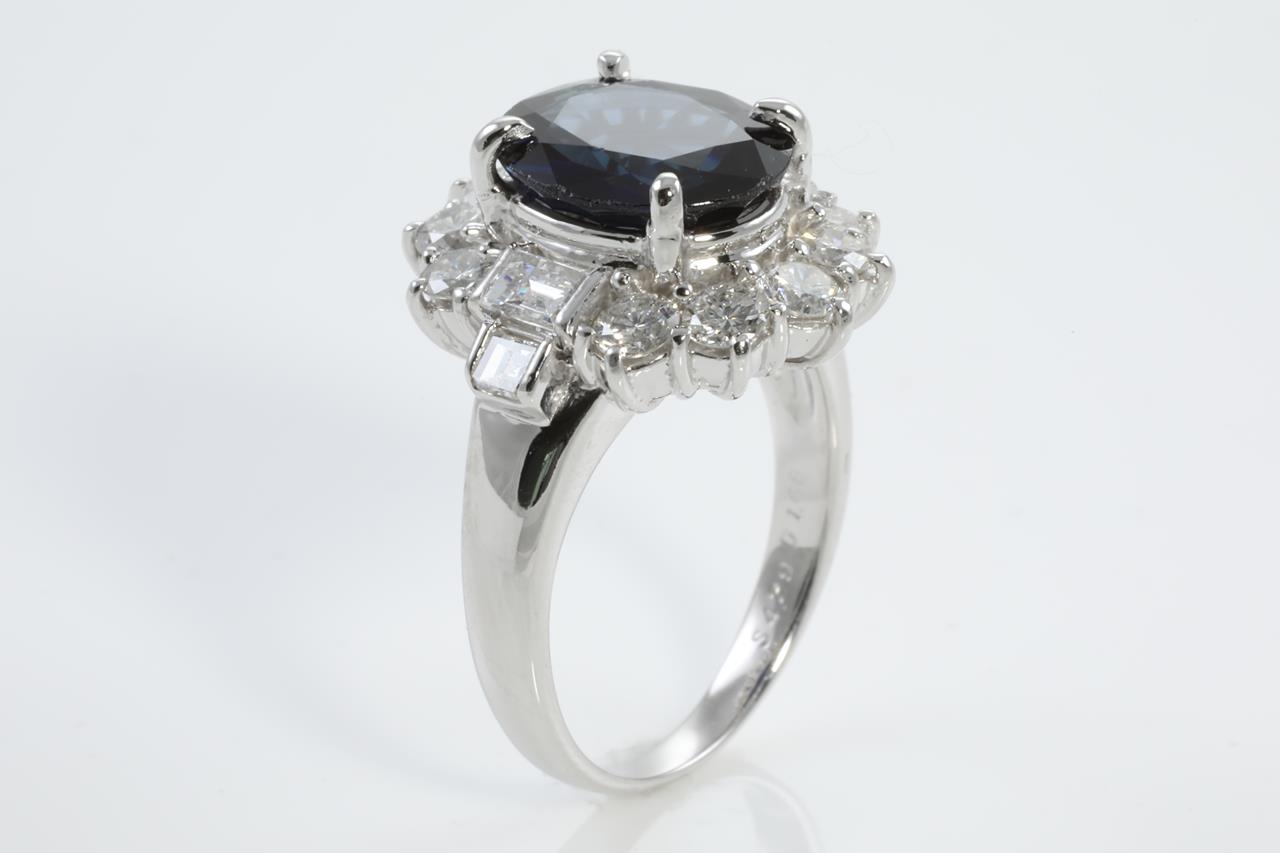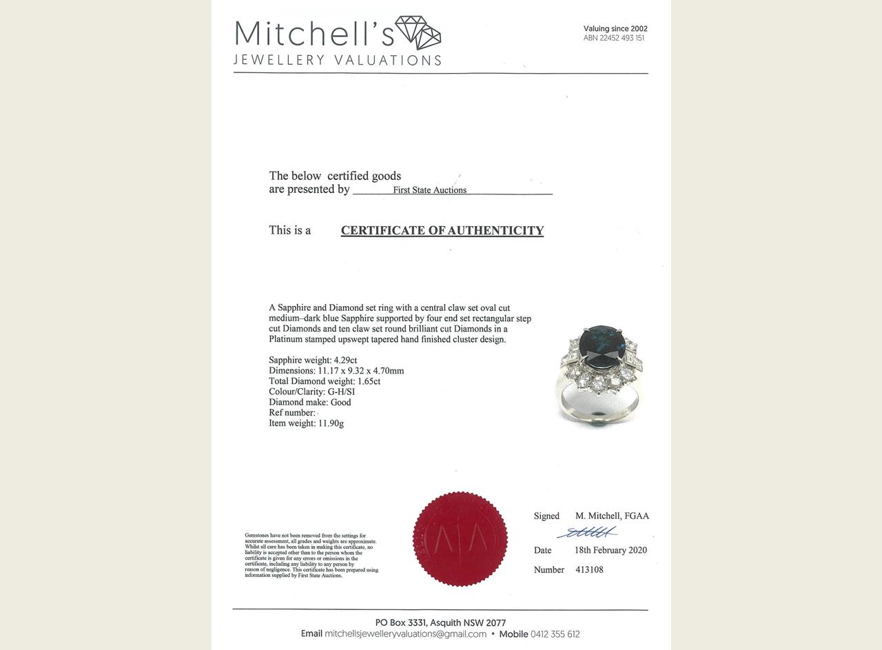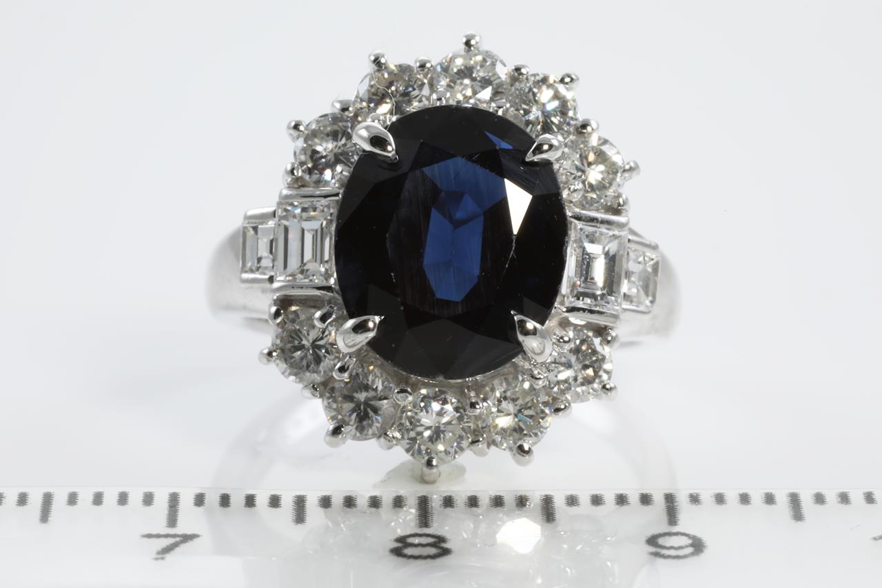 Sapphire and Diamond ring with oval shape Sapphire of 4.29ct and round & emerald cut Diamonds totalling 1.65cts (Estimated grading: G-H SI). Platinum. Ring size L1/2. With certificate. Weight: 11.9gm (Pre-owned)