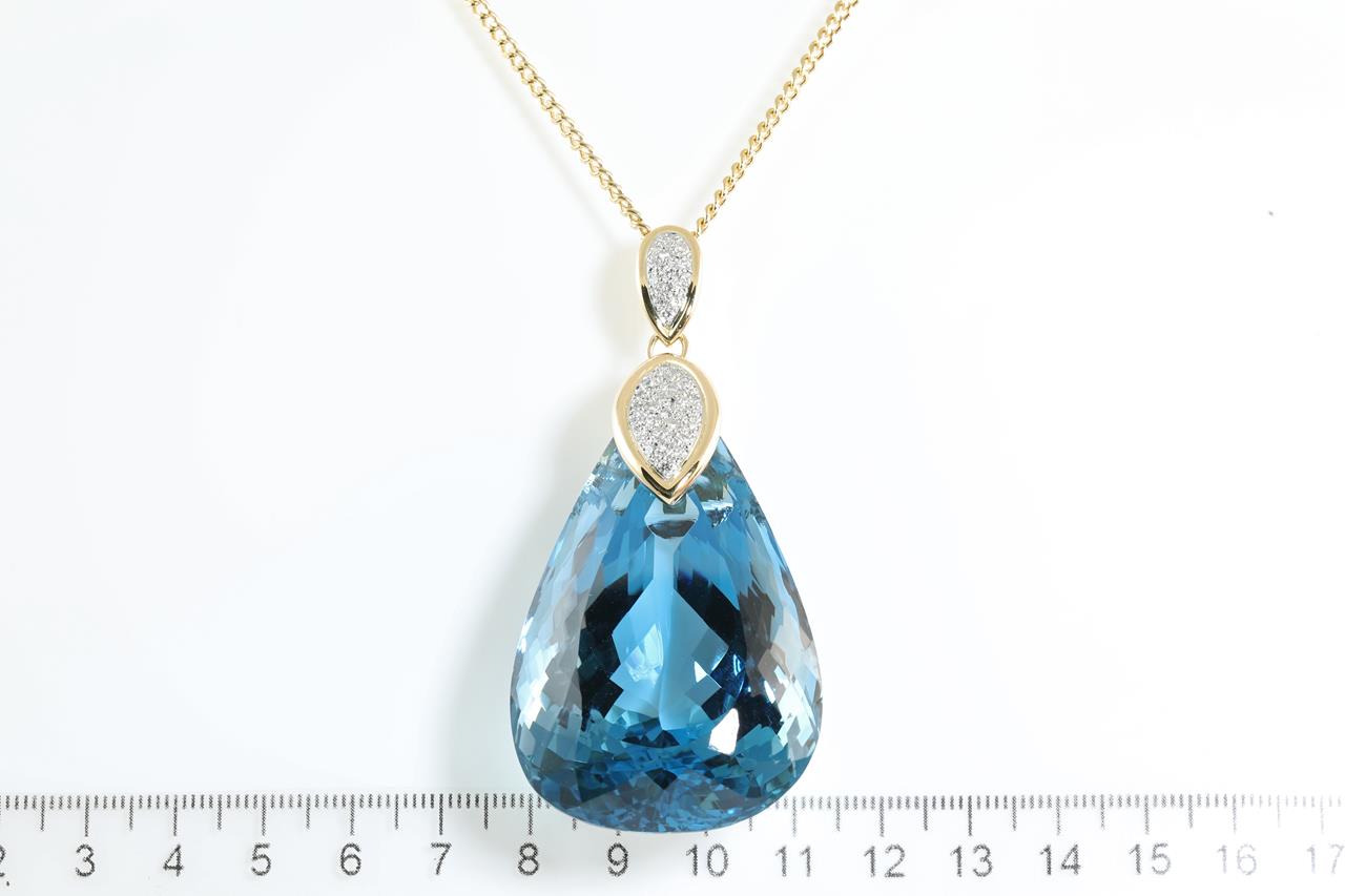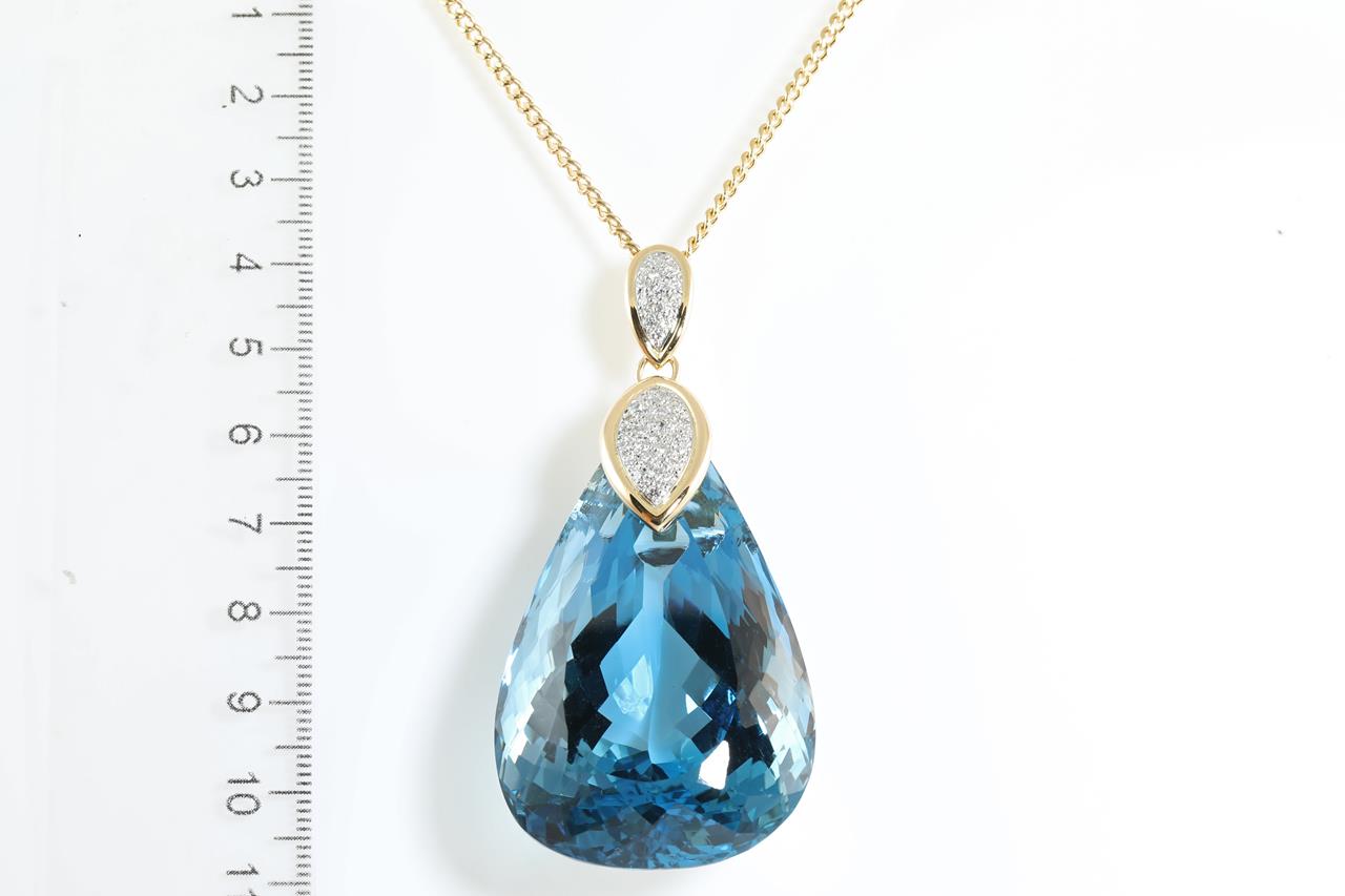 Topaz and Diamond pendant with a pear shape London Blue Topaz of 430.45ct and Diamonds totalling 0.53cts (Estimated grading: G SI). 18ct yellow gold and platinum with 51cm chain. Weight: 77.6g. With certificate #414185. (Pre-owned)