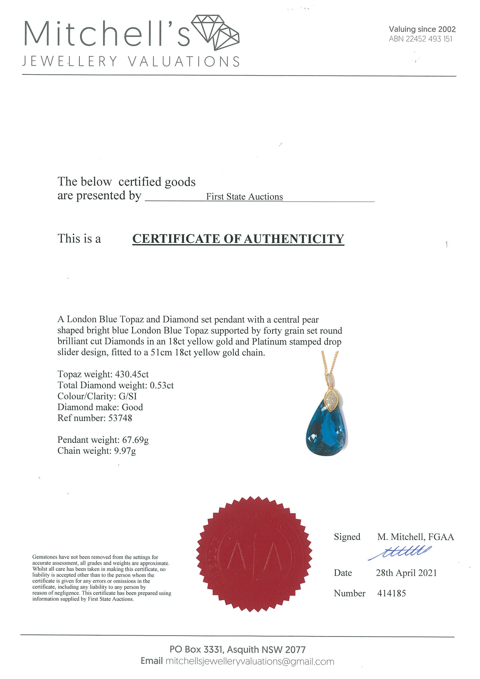 430.45ct Topaz and Diamond Pendant | First State Auctions