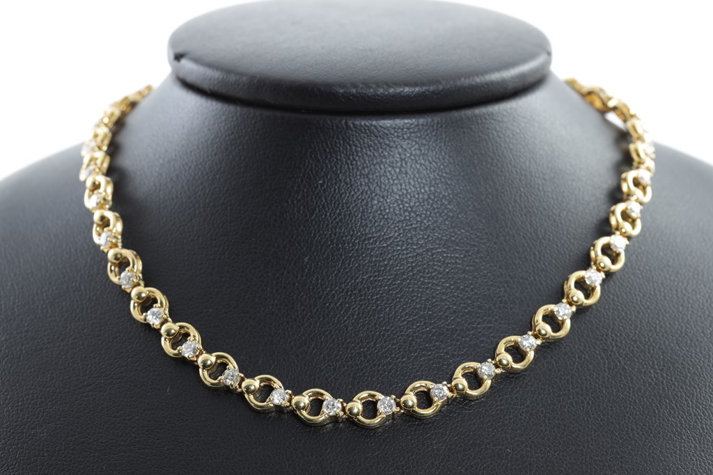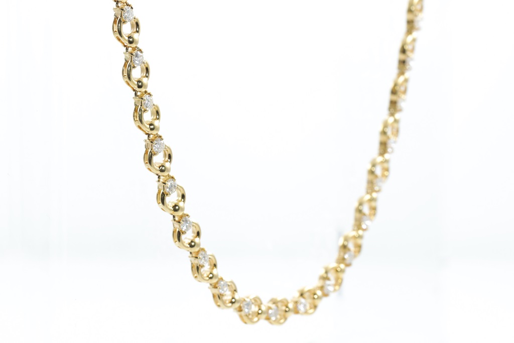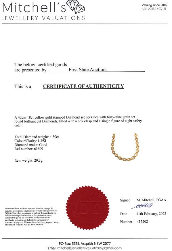 Diamond Necklace with round Diamonds totalling 4.30cts (Estimated grading: I-J SI). 18ct yellow gold. Length: 42cm. Weight: 29.3g. With certificate #415202. (Pre-owned)