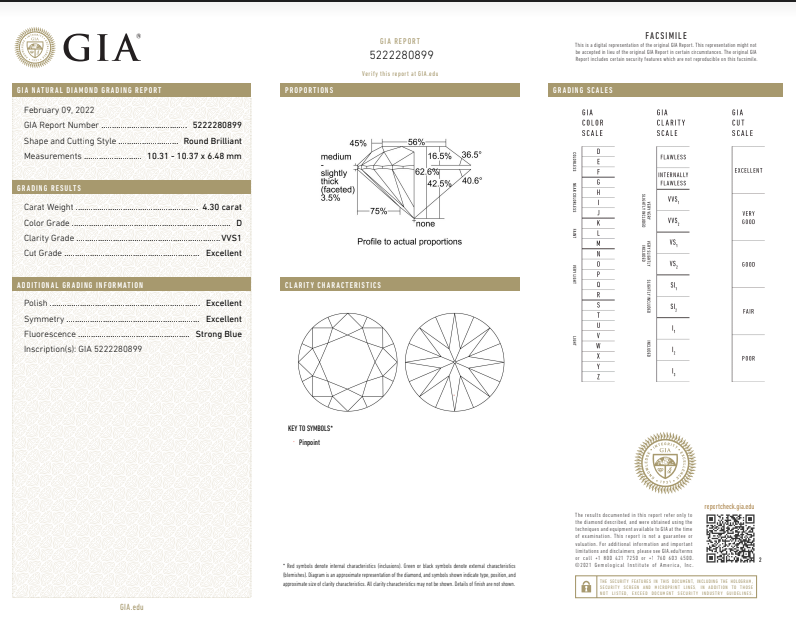 A loose round brilliant cut Diamond of 4.30ct (with GIA report graded as D VVS1 #5222280899