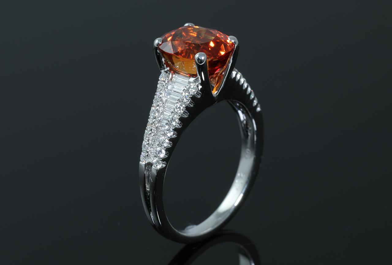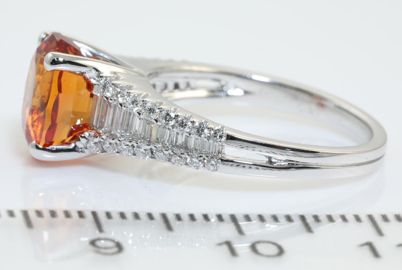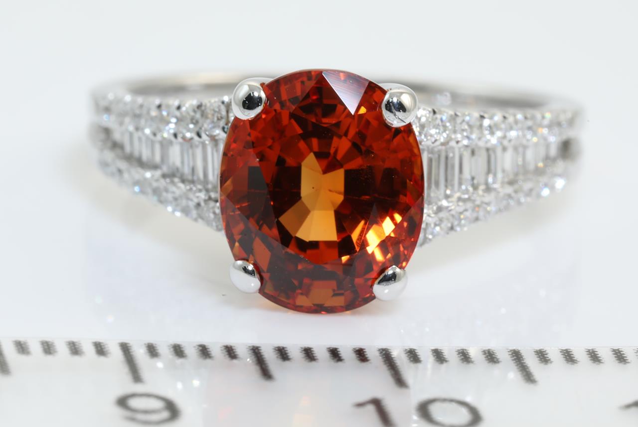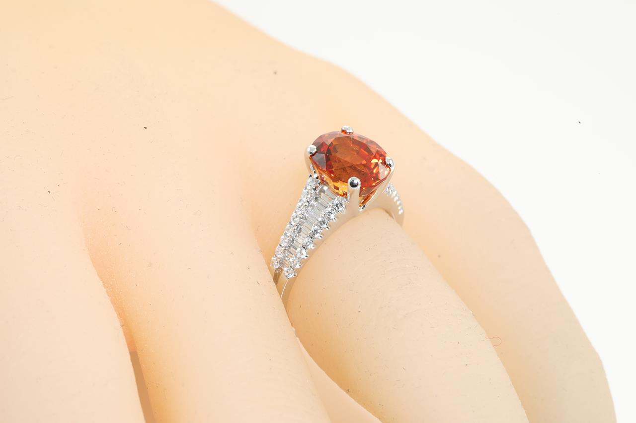 Sapphire and Diamond ring with oval shape orange Sapphire of 4.32ct with round & baguette cut Diamonds totalling 0.60cts. (Estimated grading: G VS-SI). 18ct white gold. Ring size M1/2. Weight: 5.7g (Pre-owned)
