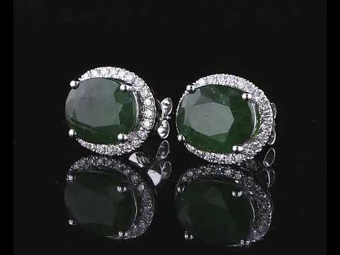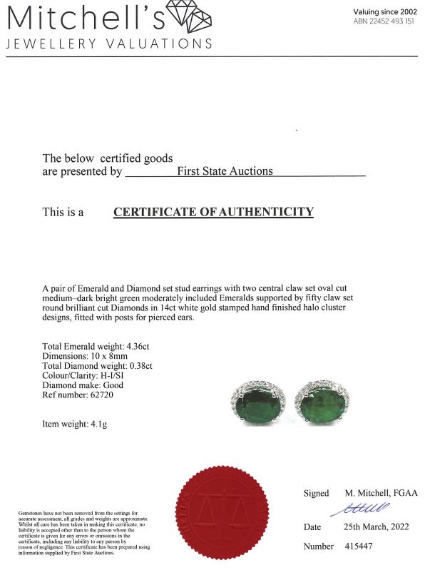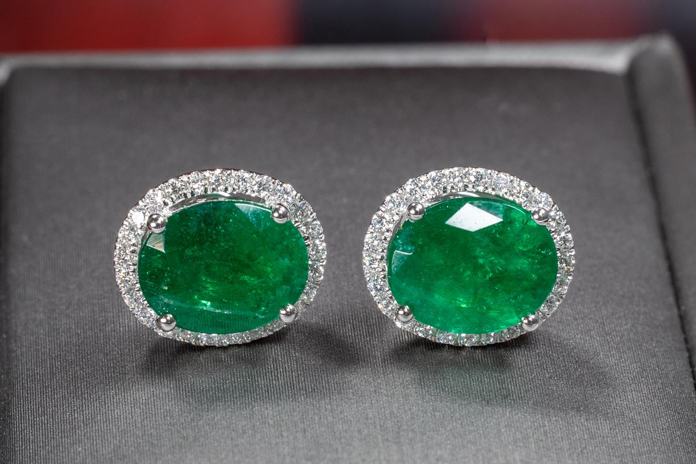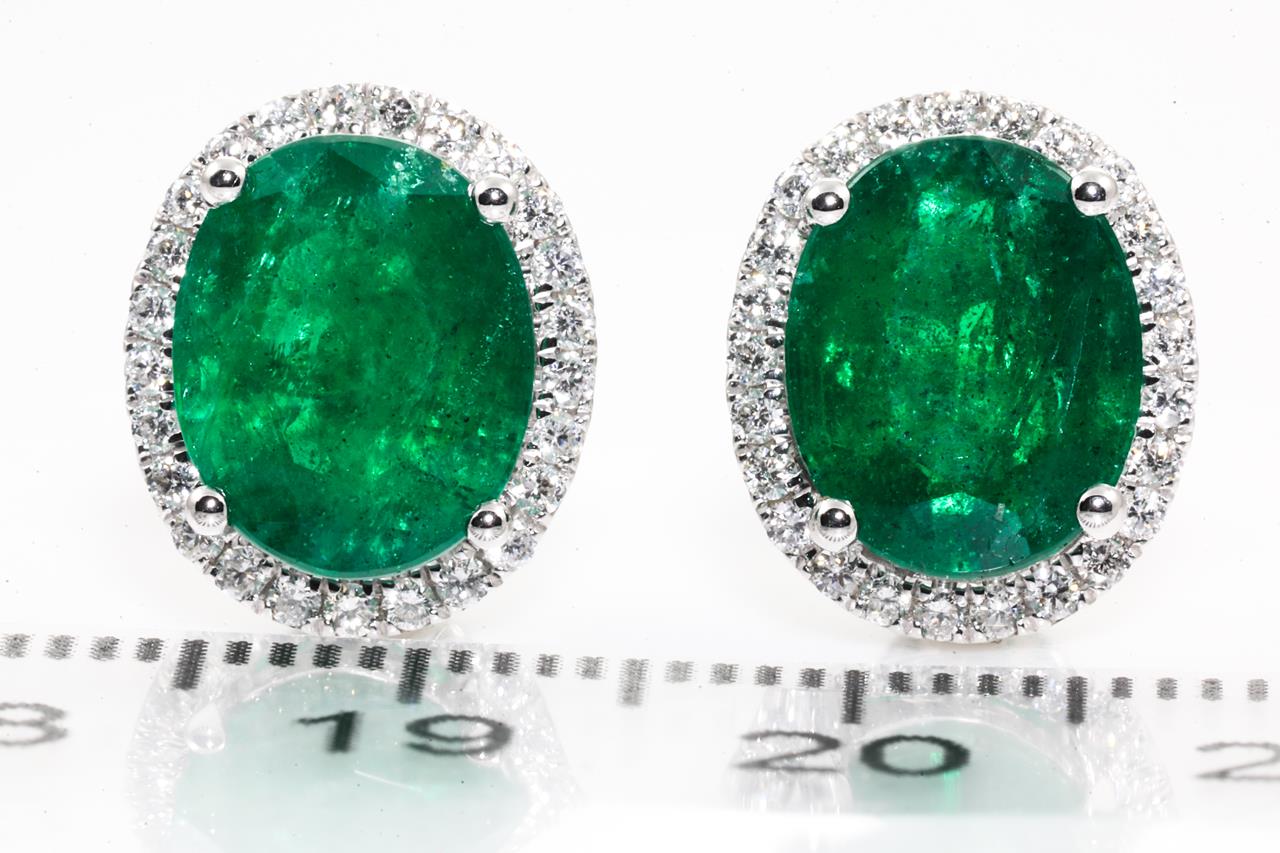 Emerald and Diamond earrings with oval Emeralds totalling 4.36cts and round Diamonds totalling 0.38cts (Estimated grading: H-I SI). 14ct white gold. Weight: 4.1g. With Certificate #415447. (As New)