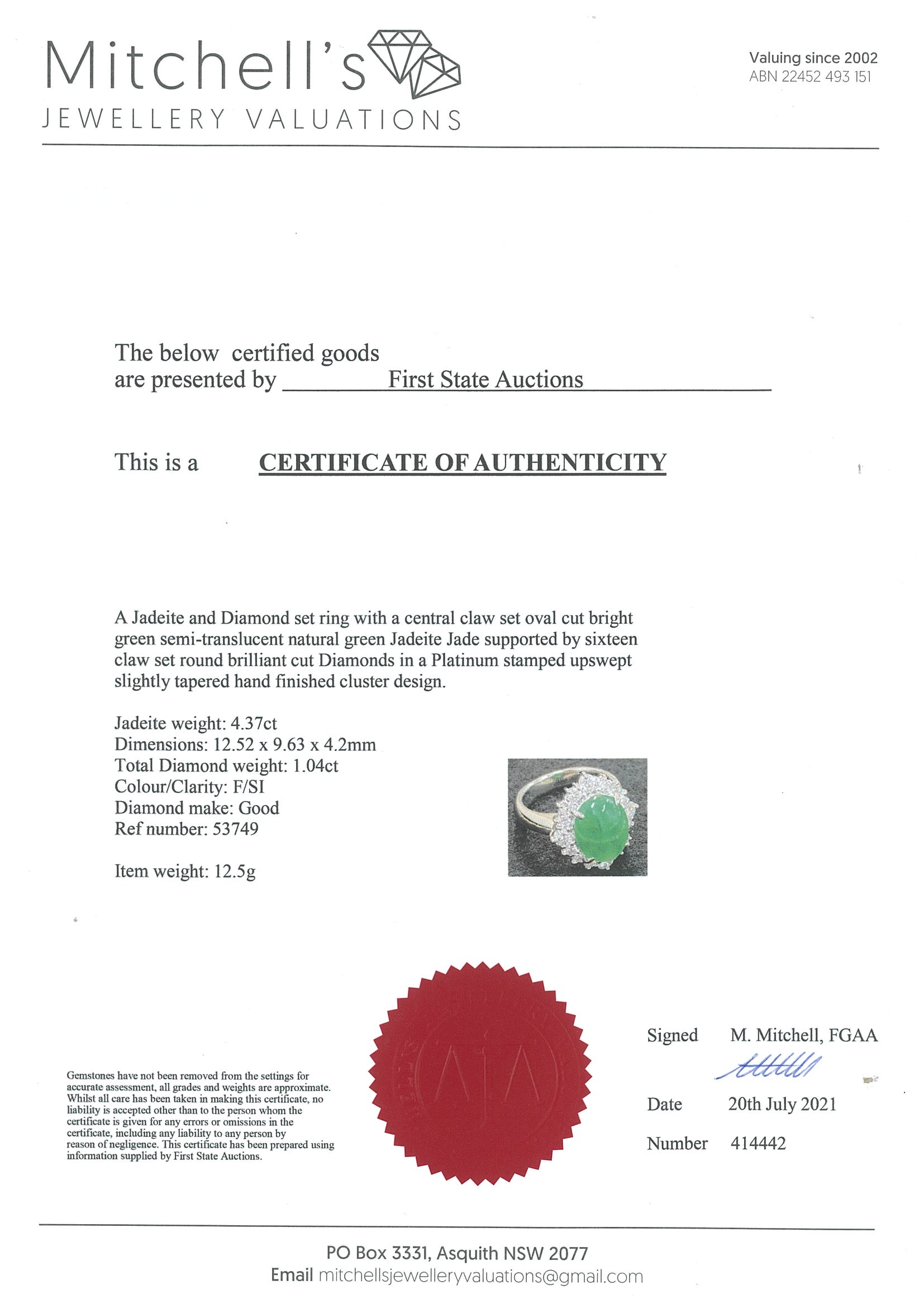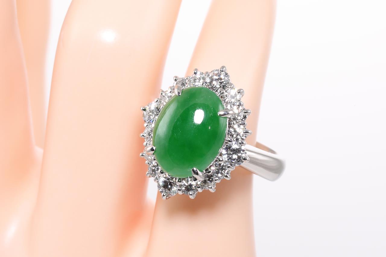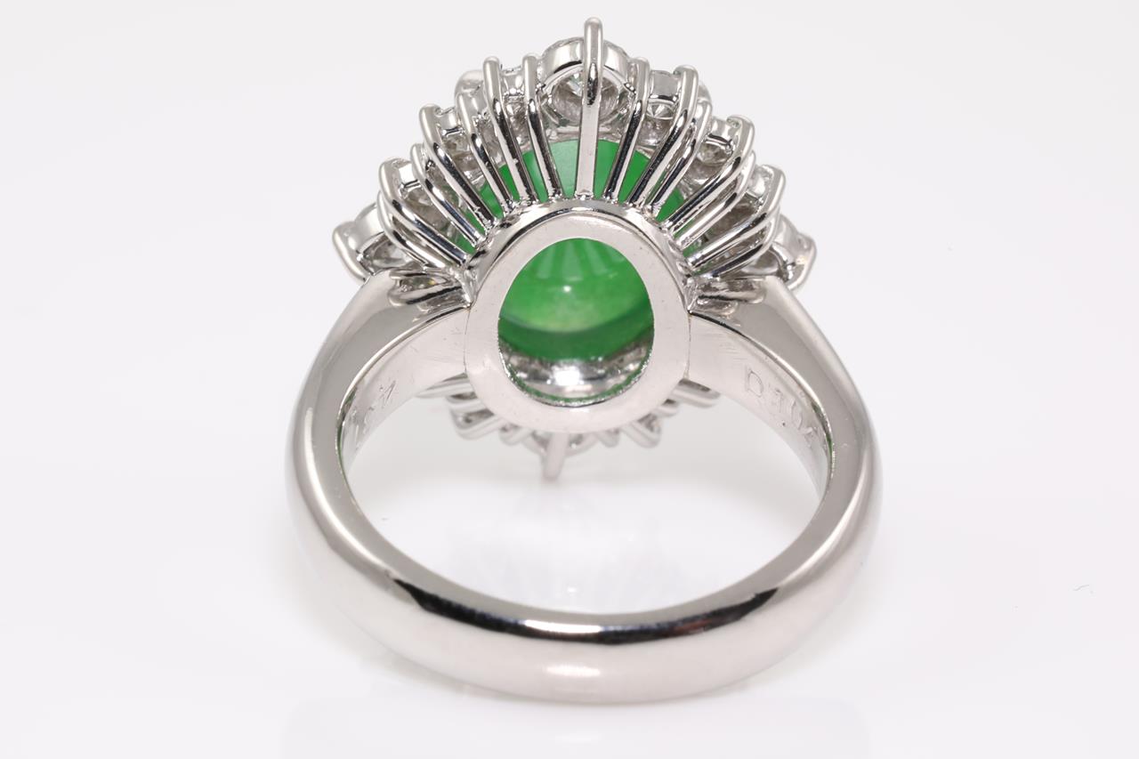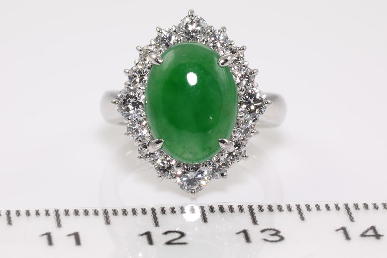 Jade and Diamond ring with a natural green Jadeite Jade of 4.37ct and Diamonds totalling 1.04cts (Estimated grading: F SI). Platinum. Ring size J1/2. Weight: 12.5g. With certificate #414442. (Pre-owned)
