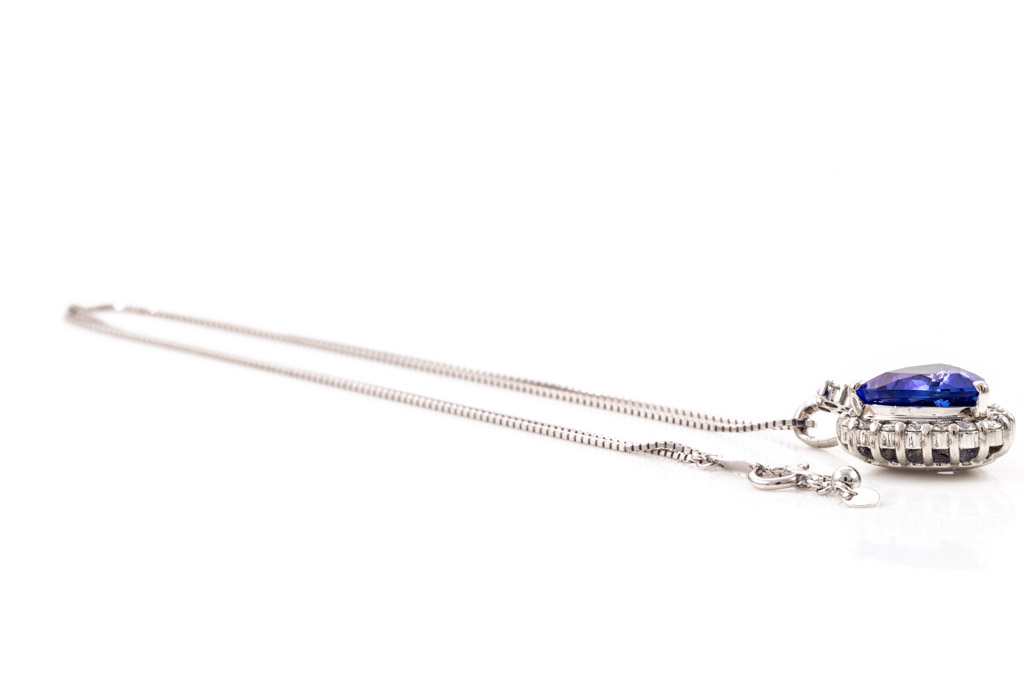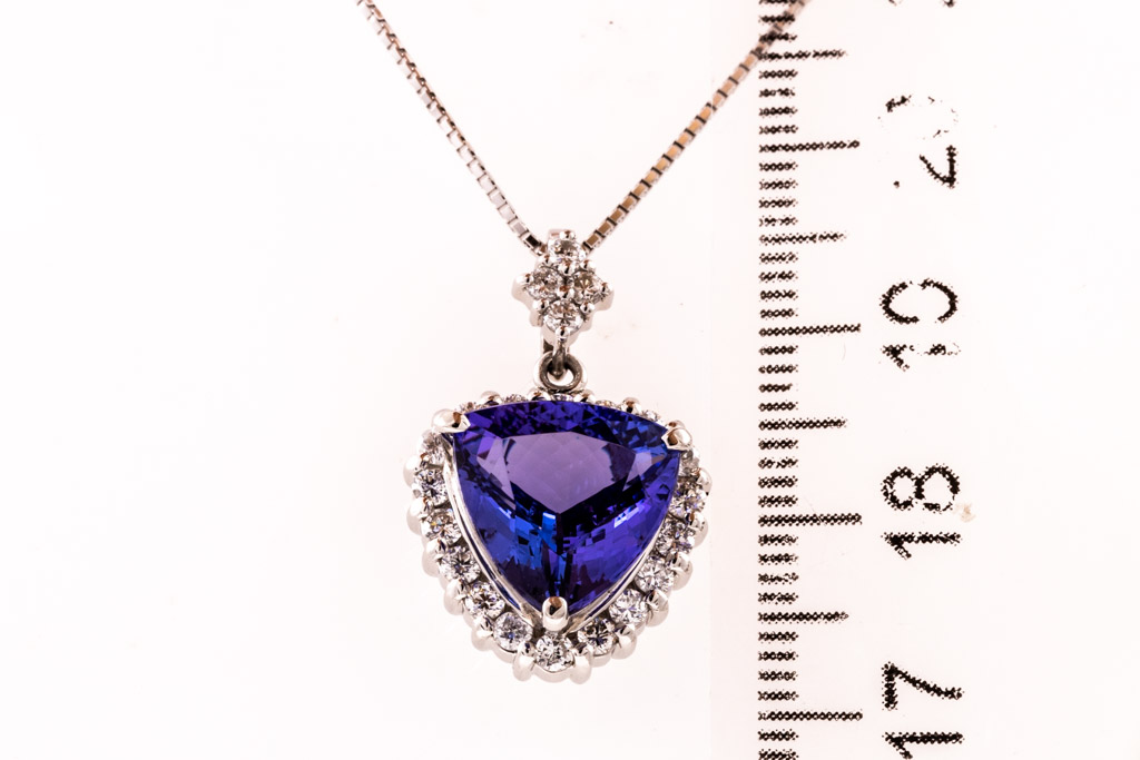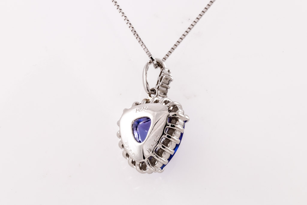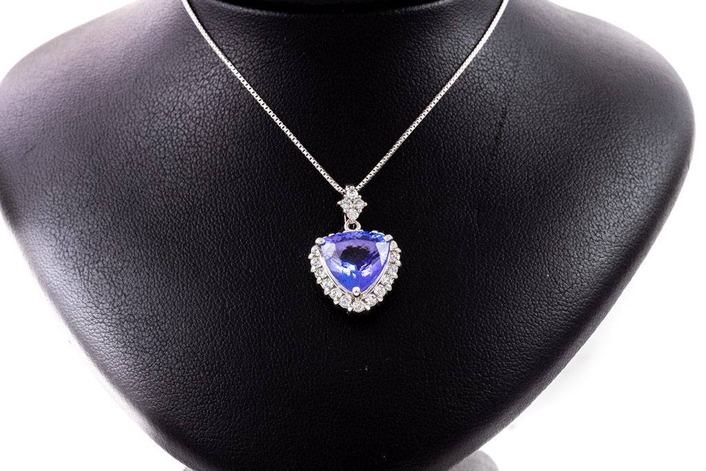 Tanzanite and Diamond pendant with triliant cut Tanzanite of 4.39ct and Diamonds totalling 0.64cts (Estimated grading: H-I SI). Platinum with 44cm adjustable 18ct white gold chain. Weight: 6.7g. (Pre-owned)