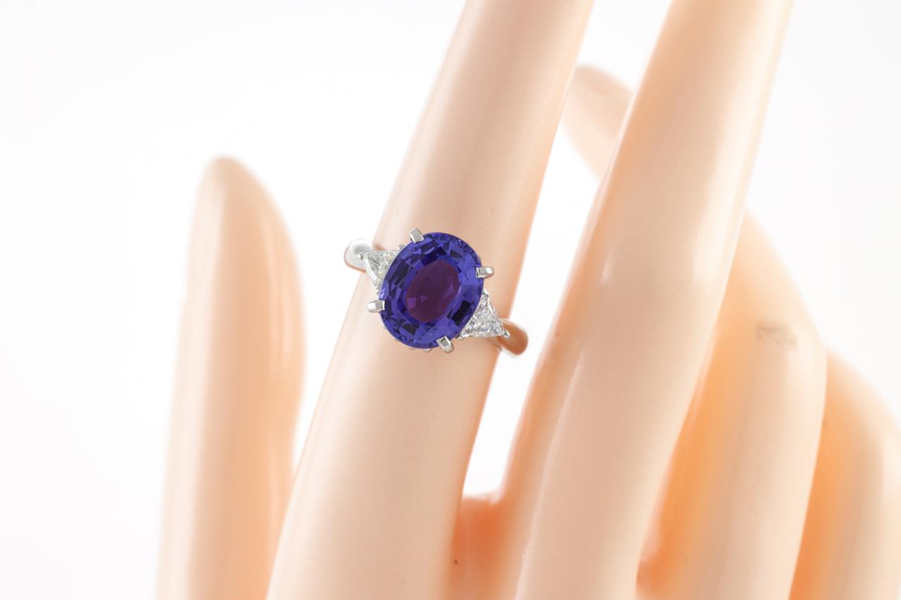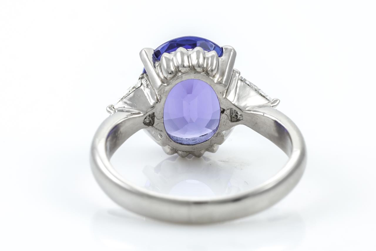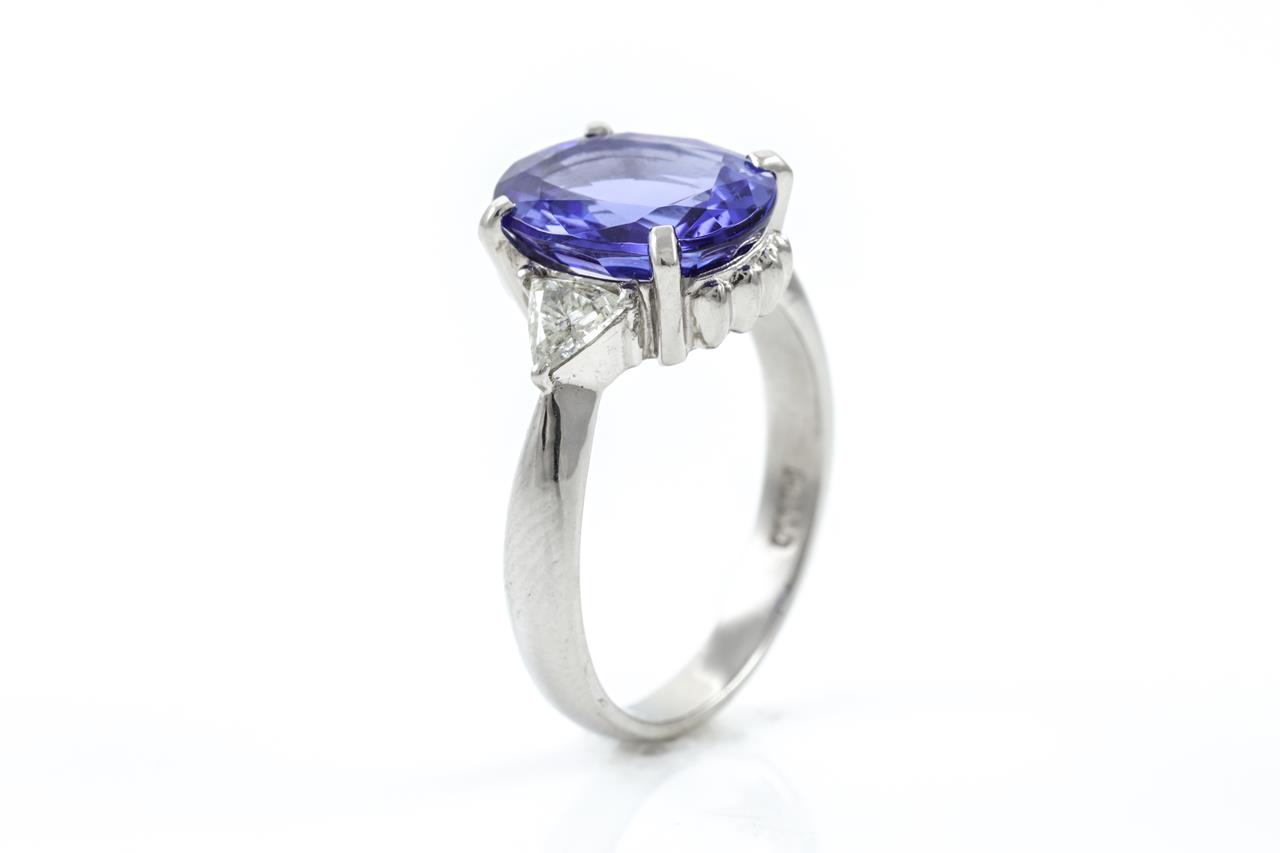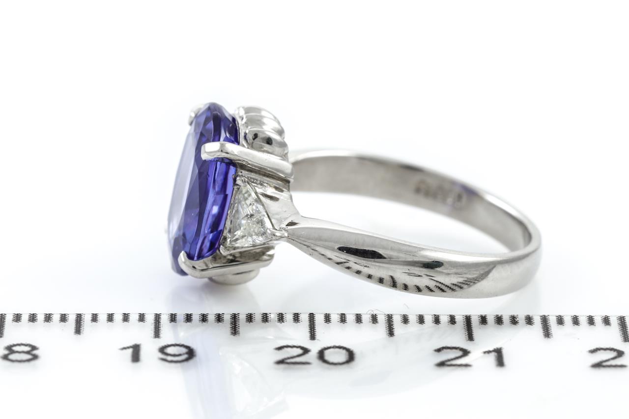 Tanzanite and Diamond ring with centre oval shape Tanzanite of 4.40ct and 2 trilliant cut Diamonds totalling 0.41cts (Estimated grading: G SI). Platinum. Ring size: N1/2. Weight: 7.6g. With certificate #415206. (Pre-owned)