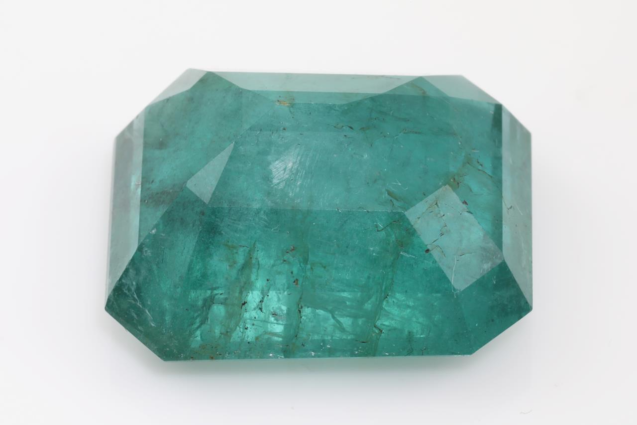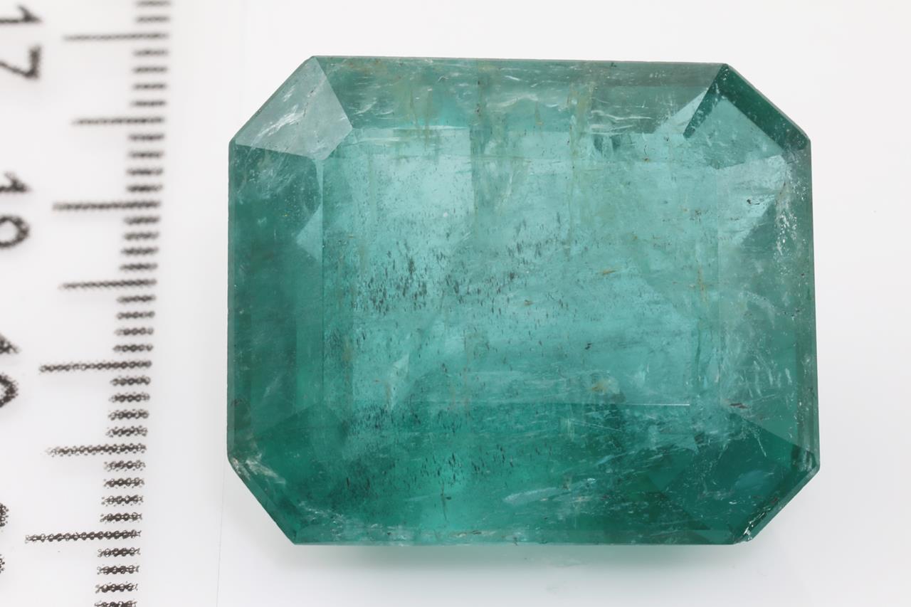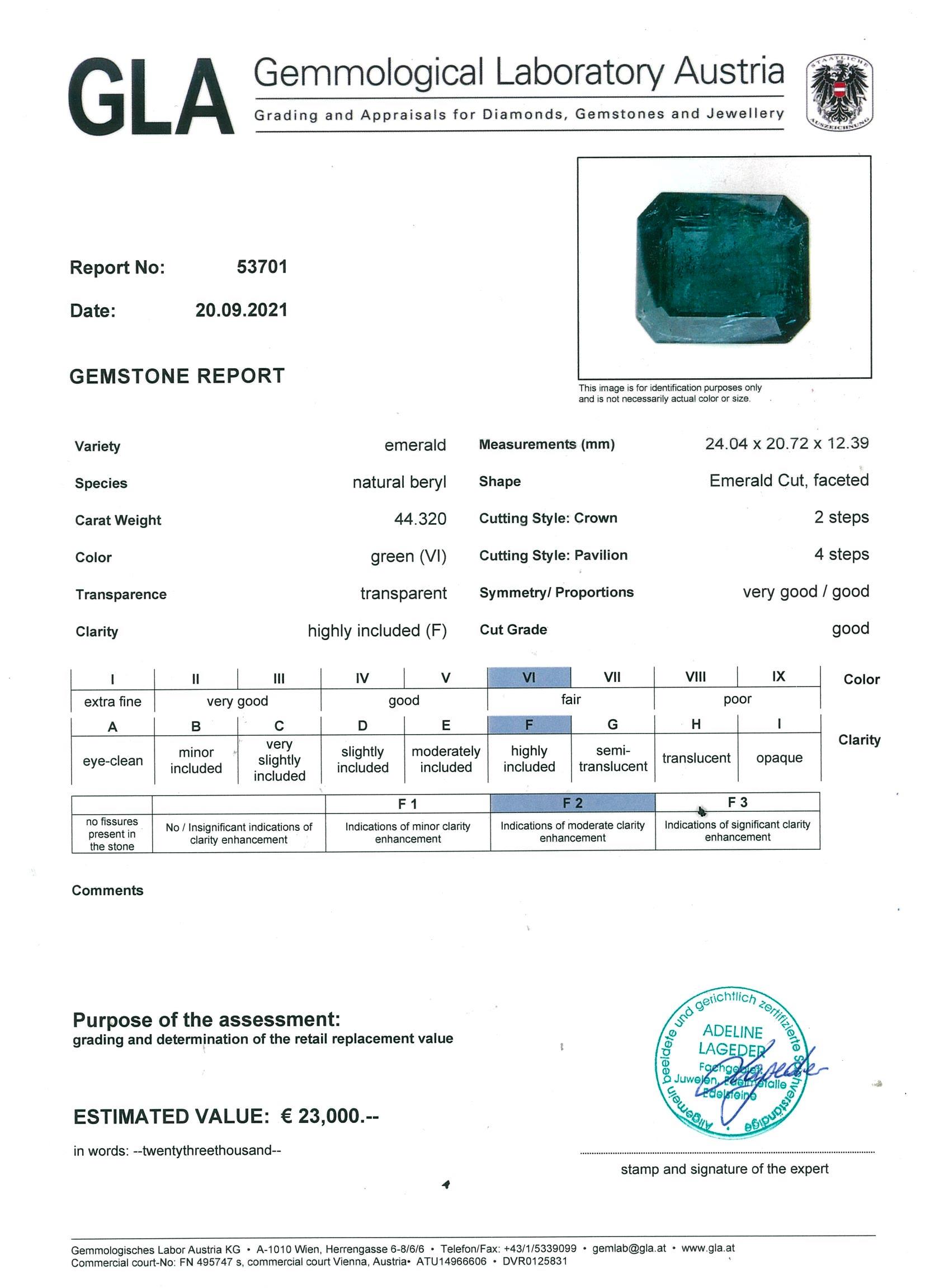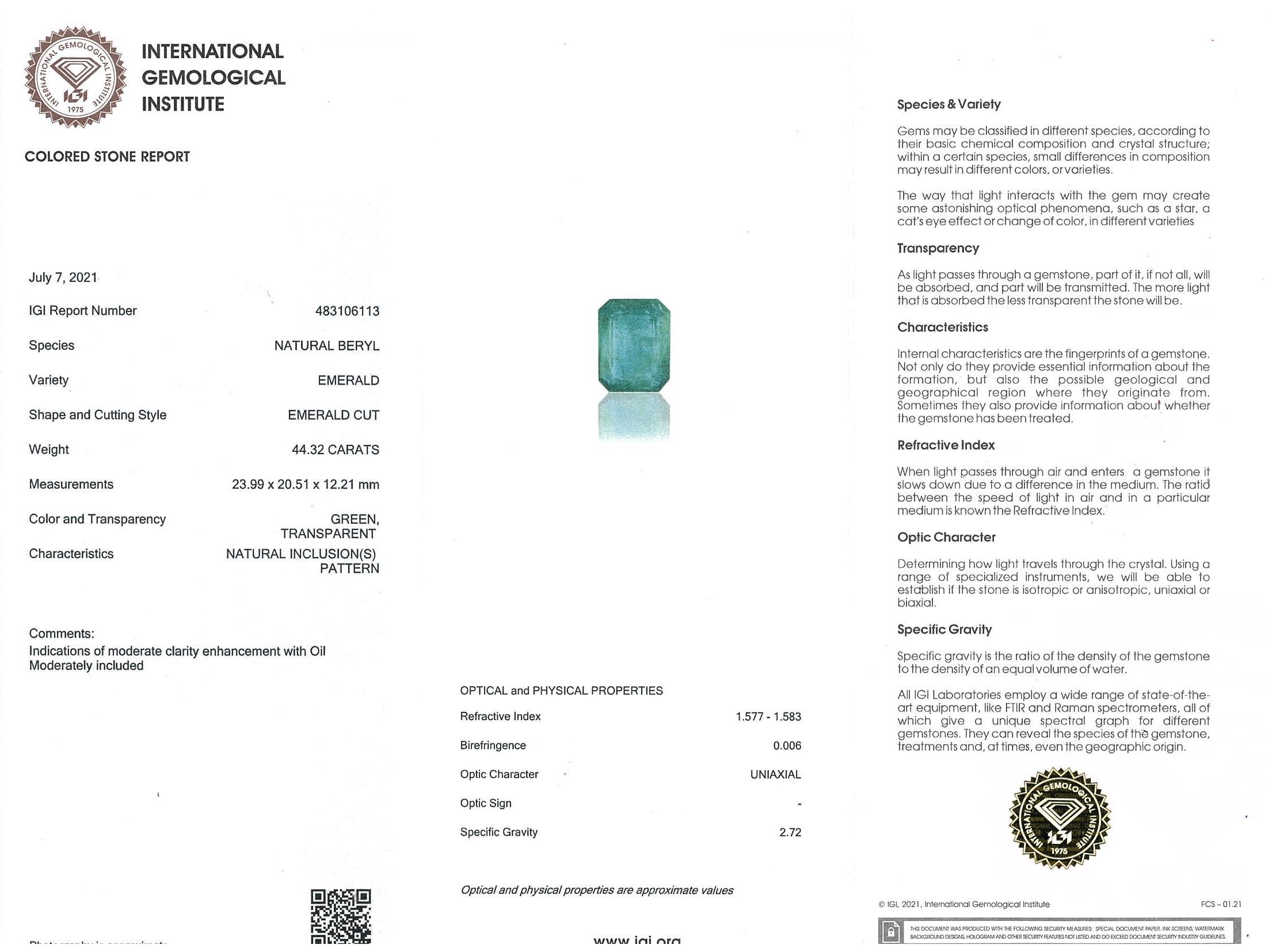A loose emerald cut Emerald of 44.32ct. Dimensions: 23.99 x 20.51 x 12.21mm. With IGI #483106113 and GLA #53701 certificates. (As New)
