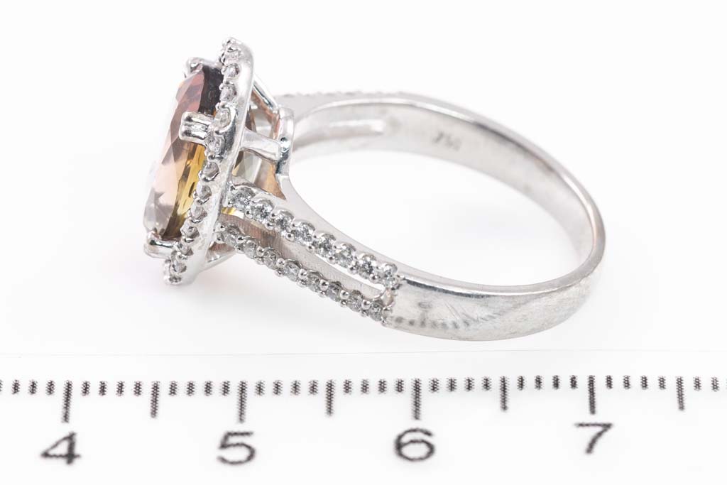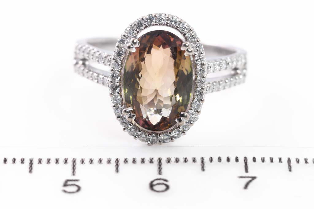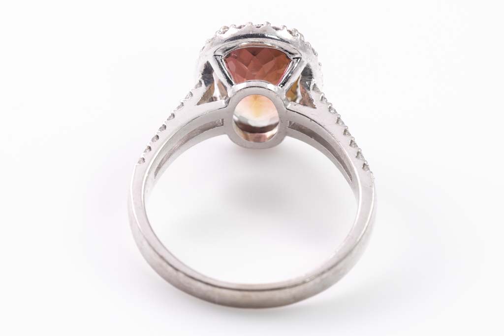 Tourmaline and Diamond dress ring with oval shape tri-colour Tourmaline of 4.43ct and round Diamonds totalling approximately 1.00cts (Estimated grading: H SI). 18ct white gold. Ring size P 1/2. Weight: 6.9g. With copy of purchase receipt dated 05/12/22 (Pre-owned)