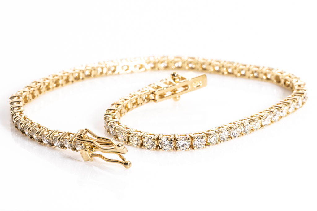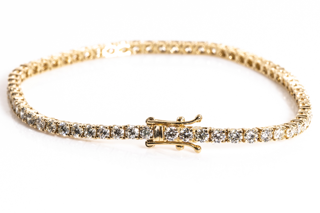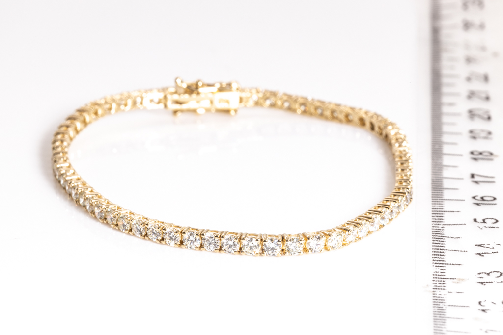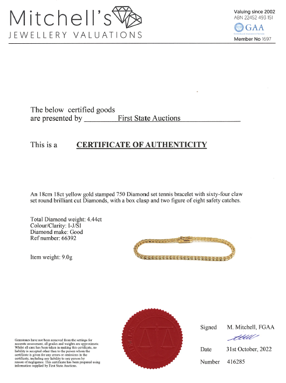 Diamond tennis bracelet with 64 round Diamonds totalling 4.44cts (Estimated grading: I-J SI). 18ct yellow gold. Length: 18cm. Weight: 9.0g. With Certificate #416285. (New)