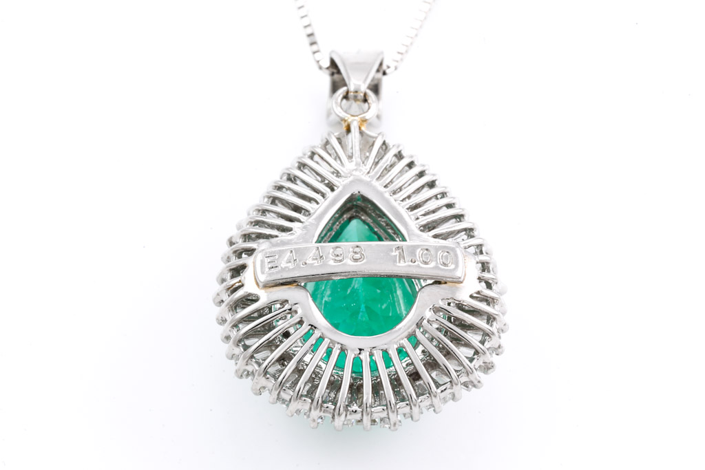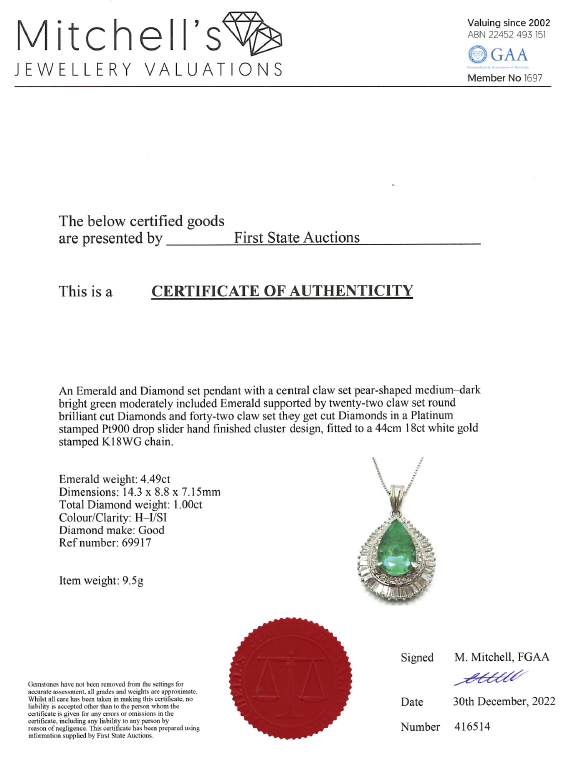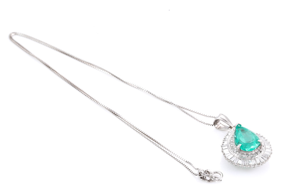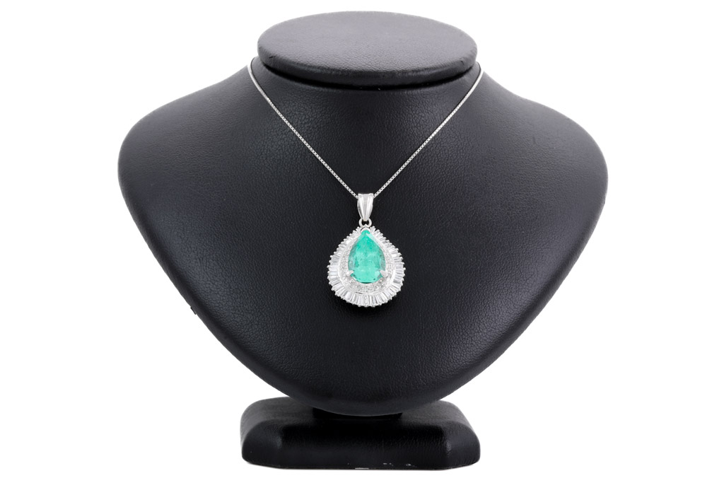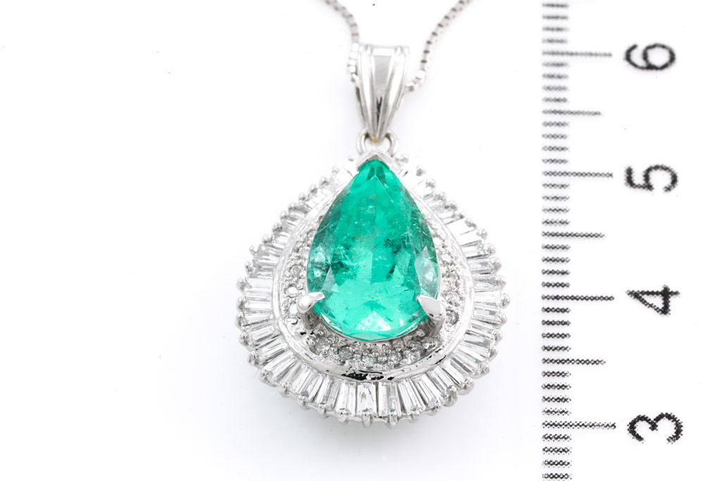 Emerald and Diamond pendant with a pear shape Emerald of 4.49ct and round & baguette cut Diamonds totalling 1.00cts (Estimated grading: H-I SI). Platinum with 44cm 18ct white gold chain. Weight: 9.5g. With Certificate #416514. (Pre-owned)