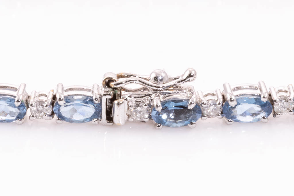 Aquamarine and Diamond bracelet with oval Aquamarines totalling 4.50cts and round Diamonds totalling 0.80cts (Estimated grading: H-I SI-P1). 18ct white gold. Length: 17.5cm. Weight: 10.8g. (Pre-owned)