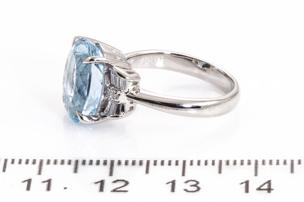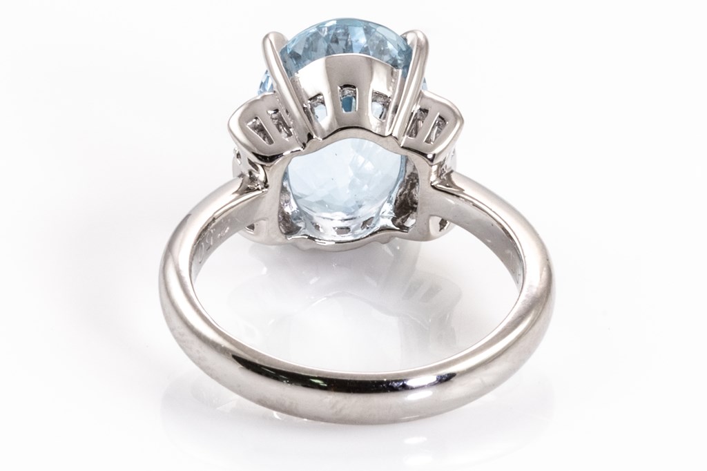 Aquamarine and Diamond ring with Aquamarine of 4.50ct and round & baguette cut Diamonds totalling 0.18cts. Platinum. Ring size K1/2. Weight: 7.6g. (Pre-owned)