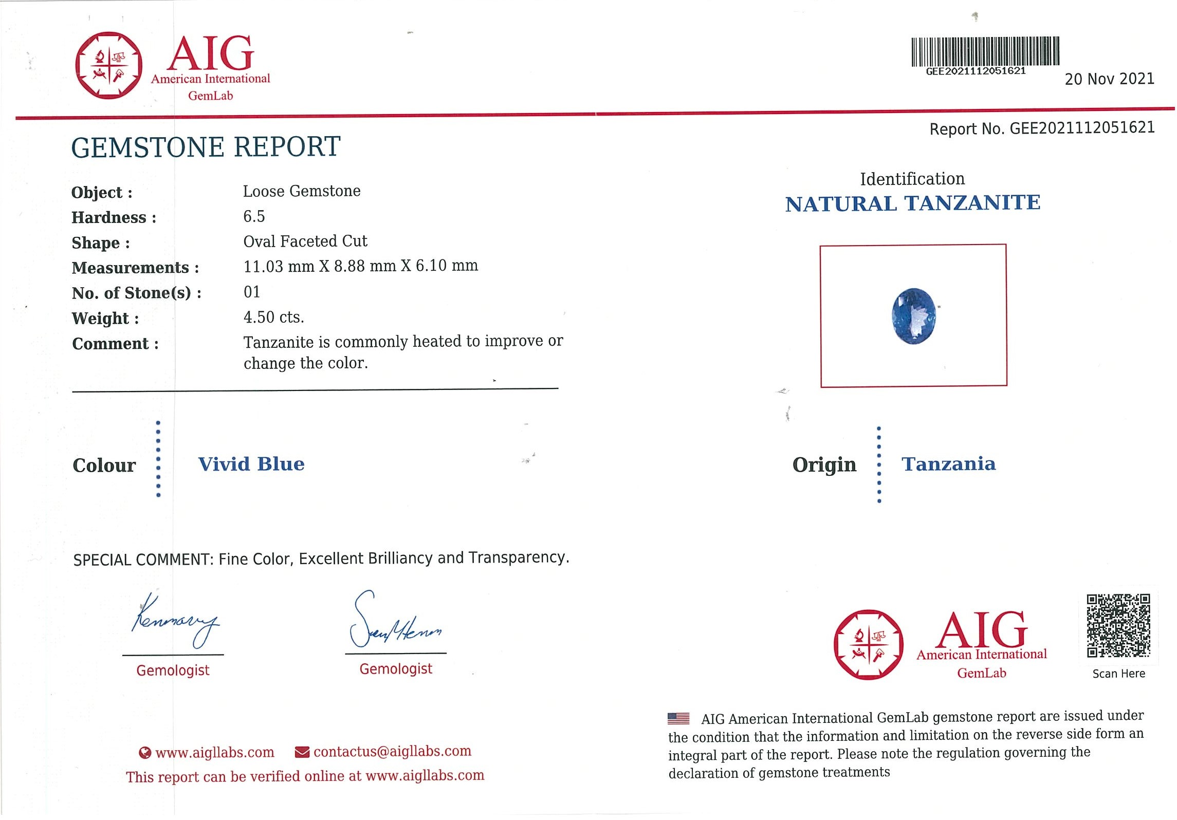 A loose oval cut Tanzanite of 4.50cts. 11.03 x 8.88 x 6.10mm. With gEm report #GEE2021112051621. (As New)