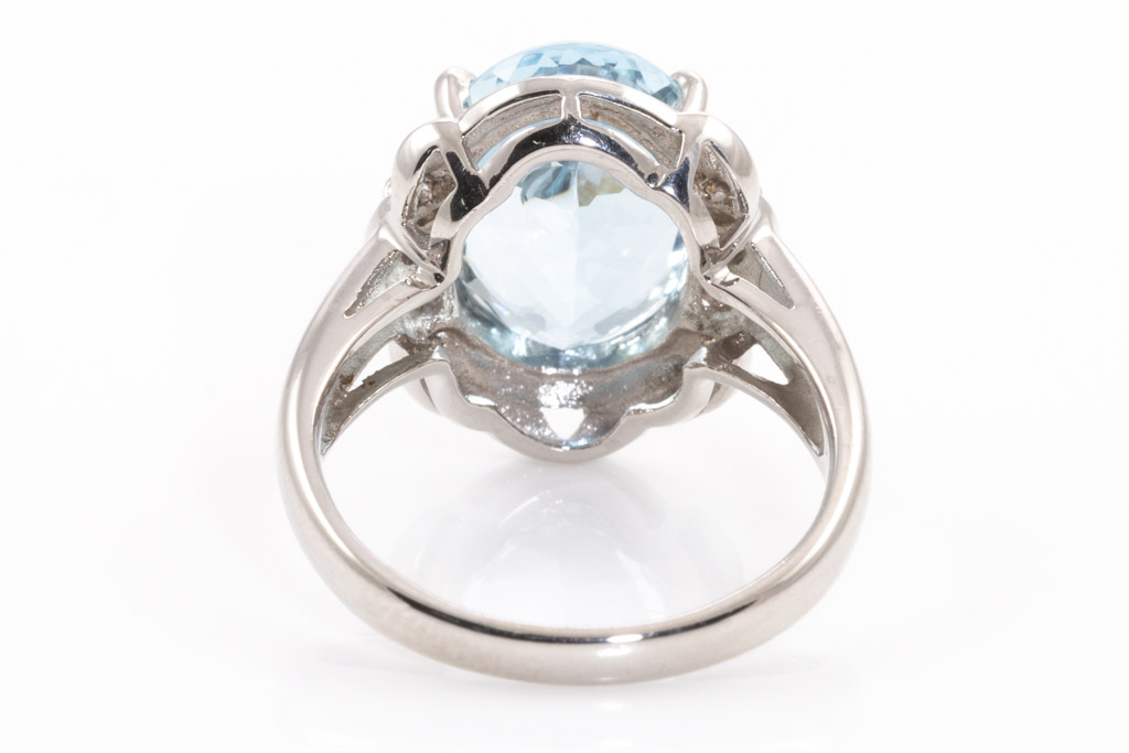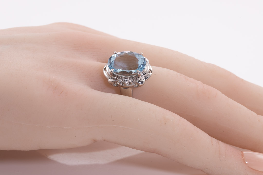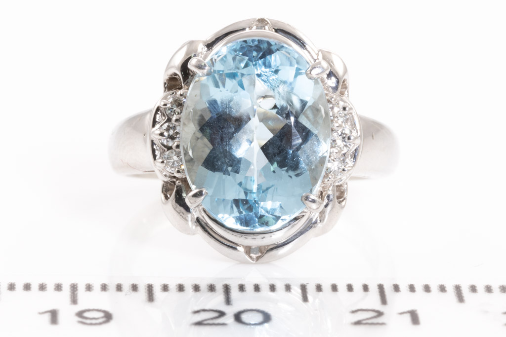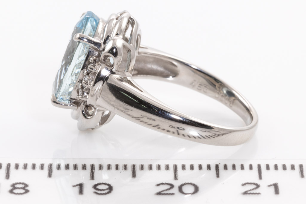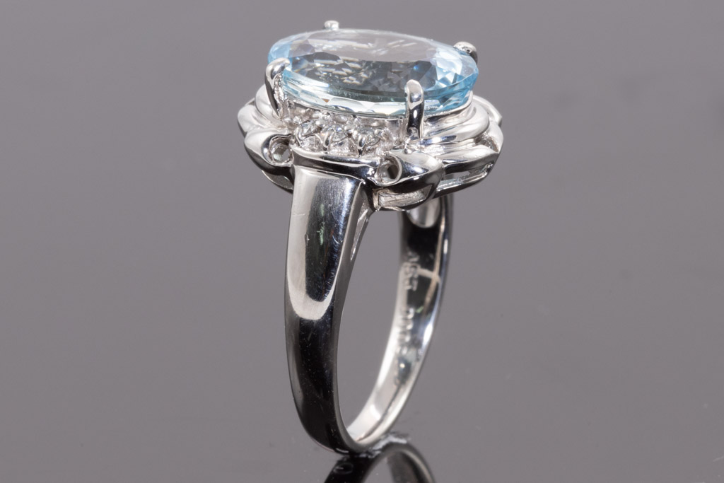 Aquamarine and Diamond ring with oval shape Aquamarine of 4.53ct and round Diamonds totalling 0.09cts. Platinum-900. Ring size L1/2. Weight: 7.6g. (Pre-owned)