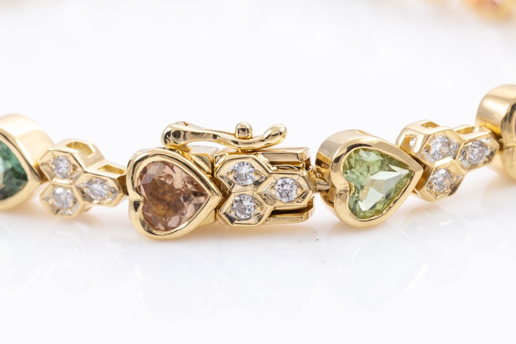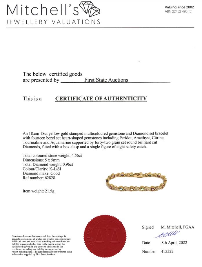Mixed gemstone bracelet with heart shape Peridot, Amethyst, Citrine, pink Tourmaline & Aquamarine totalling 4.56cts and round Diamonds totalling 0.96cts (Estimated grading: K-L SI). 18ct yellow gold. Length: 18cm. Weight: 21.5g. With Certificate #415522. (Pre-owned)