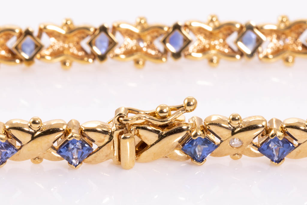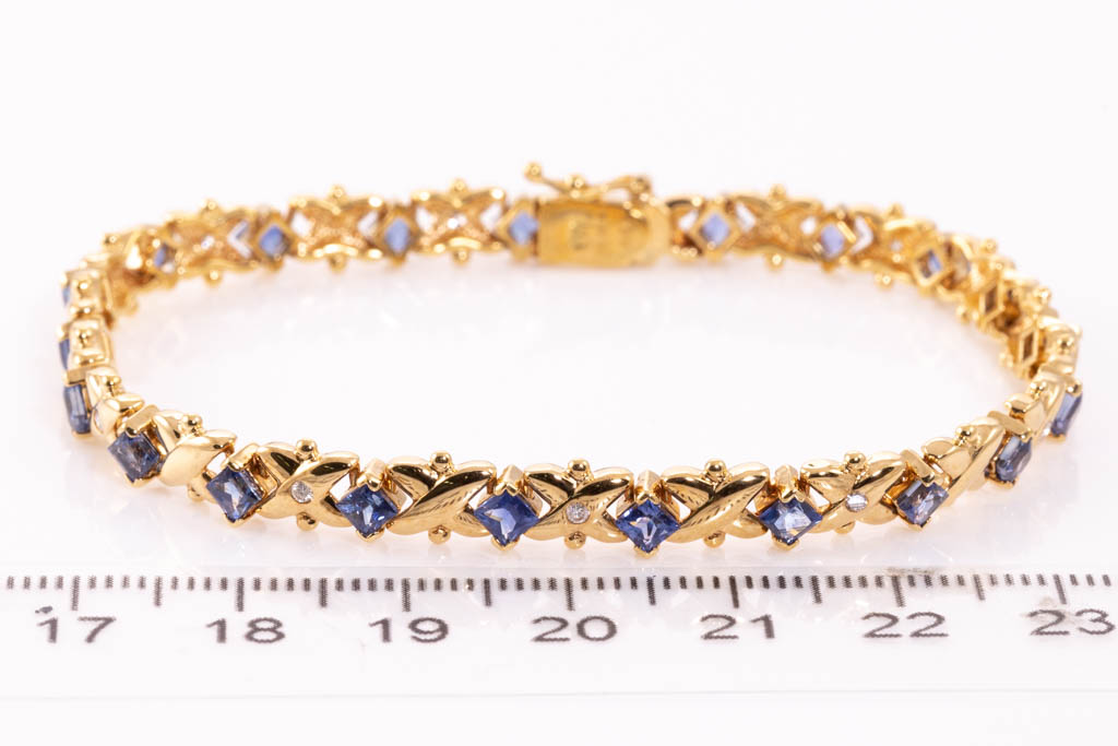 Sapphire and Diamond bracelet with carre cut Sapphires totalling 4.56cts and round Diamonds totalling 0.13cts. 18ct yellow gold. Length: 18cm. Weight: 16.7g. (Pre-owned)