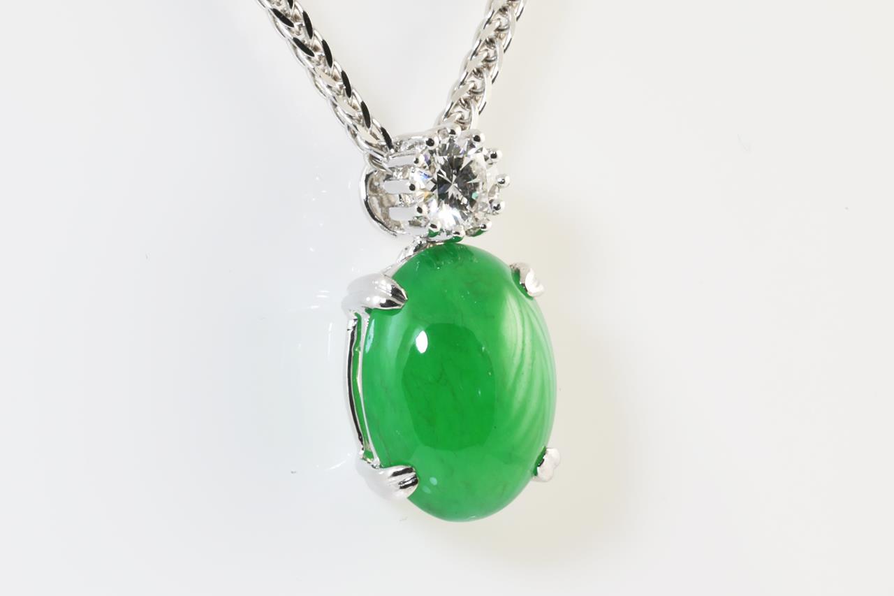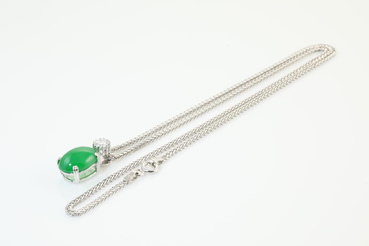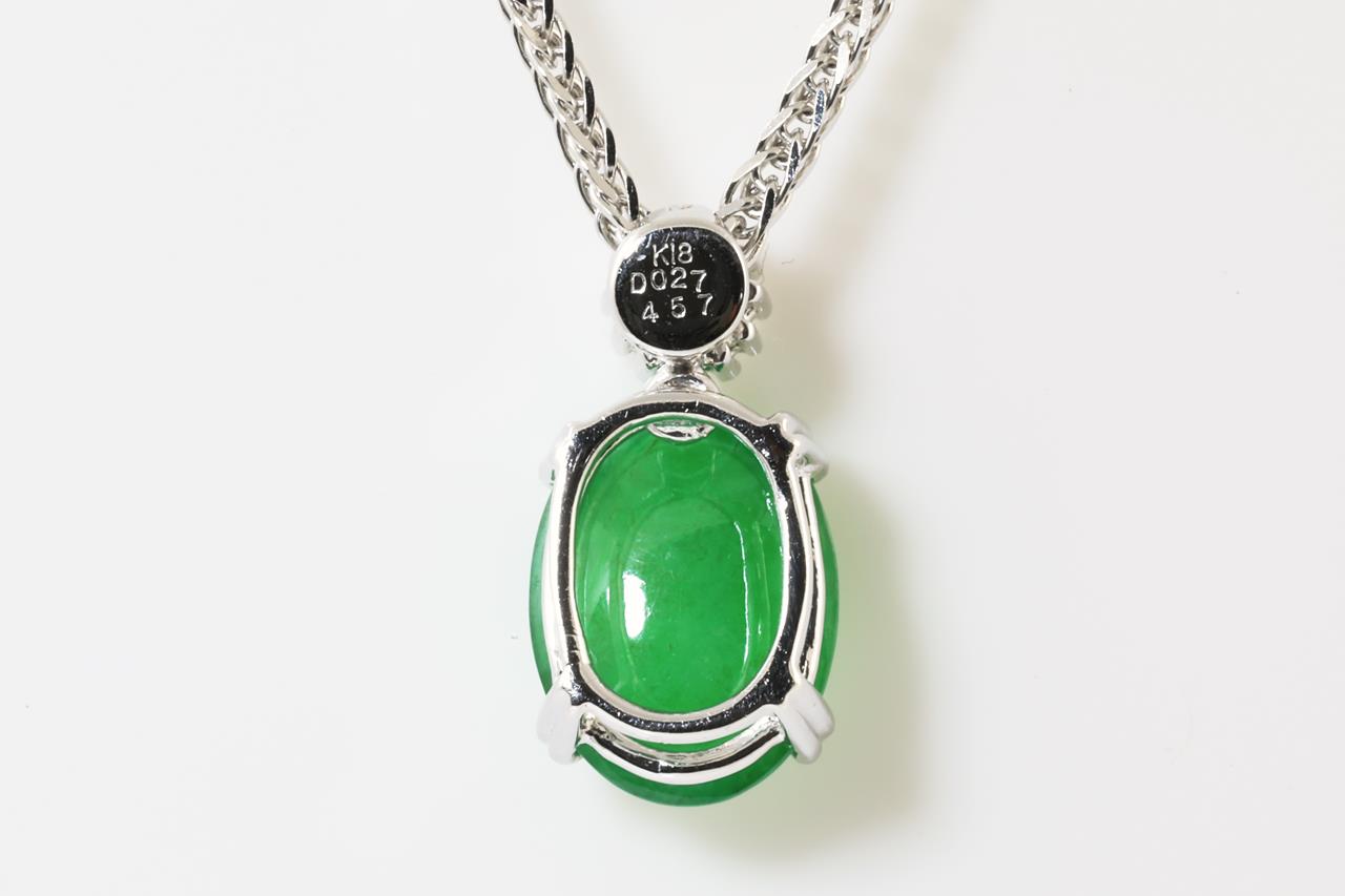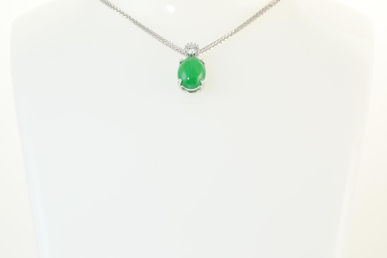 Jade and Diamond pendant with oval green Jade of 4.57ct (with Gem Identification Report #CZ8718) and Diamonds totalling 0.27cts. 18ct white gold with 18ct white gold 45cm chain. Weight: 7.8g (Pre-owned)