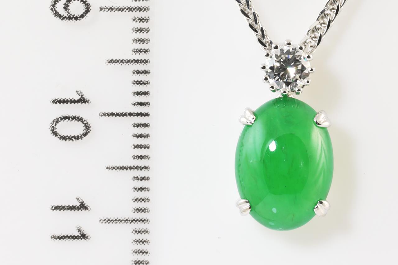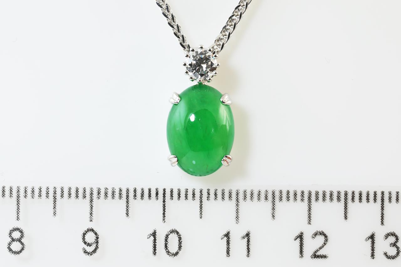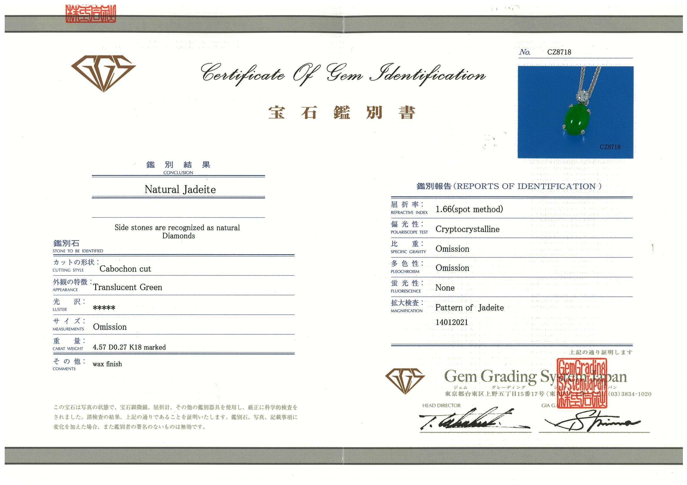 Jade and Diamond pendant with oval green Jade of 4.57ct (with Gem Identification Report #CZ8718) and Diamonds totalling 0.27cts. 18ct white gold with 18ct white gold 45cm chain. Weight: 7.8g (Pre-owned)