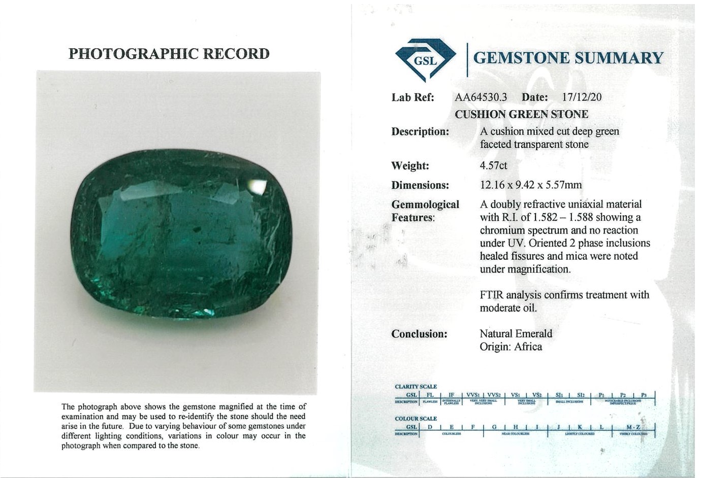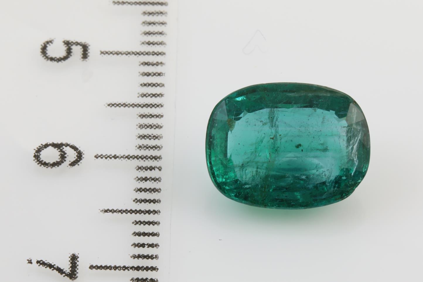 A loose cushion cut Emerald of 4.57ct (with GSL Gemstone summary report #AA64530.3). Dimensions: 12.16 x 9.42 x 5.57mm. (New)