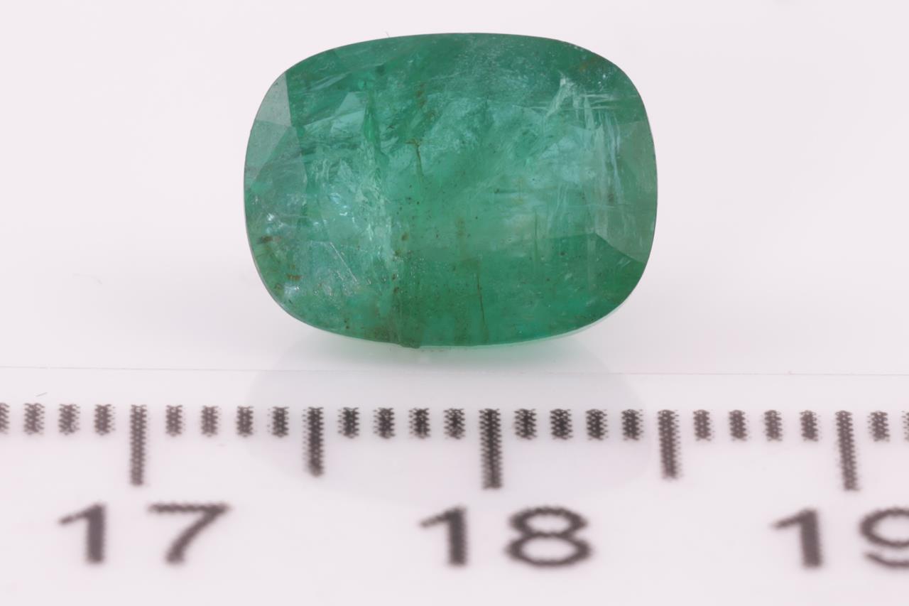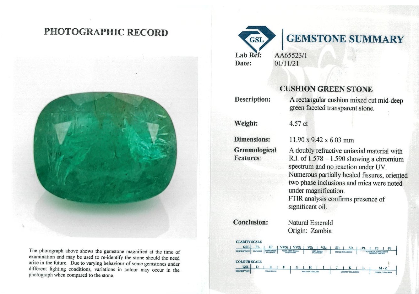 A loose Zambian cushion cut Emerald of 4.57ct (with GSL Gemstone summary report #AA65523/1). Dimensions: 11.90 x 9.42 x 6.03mm. (New)