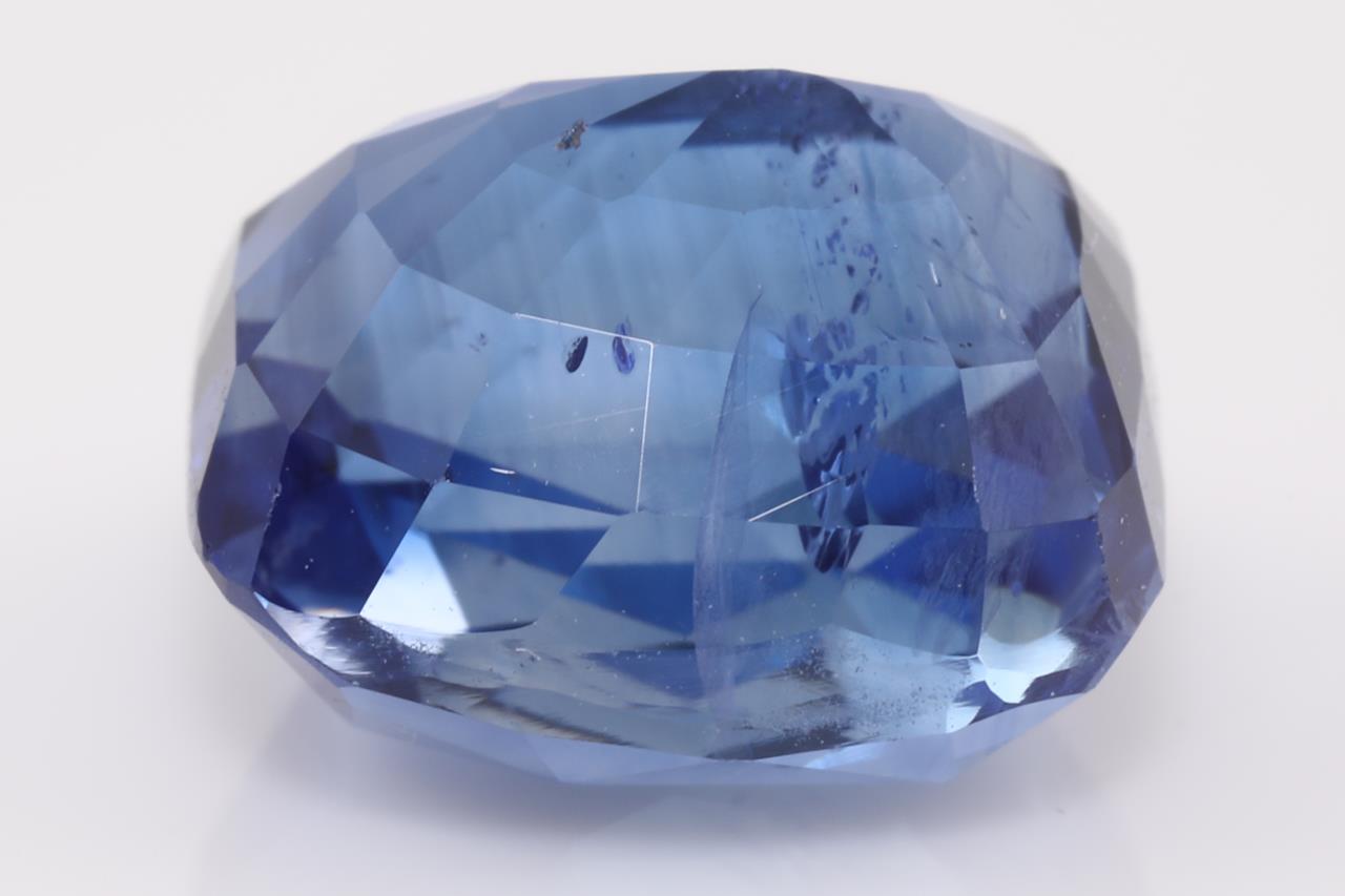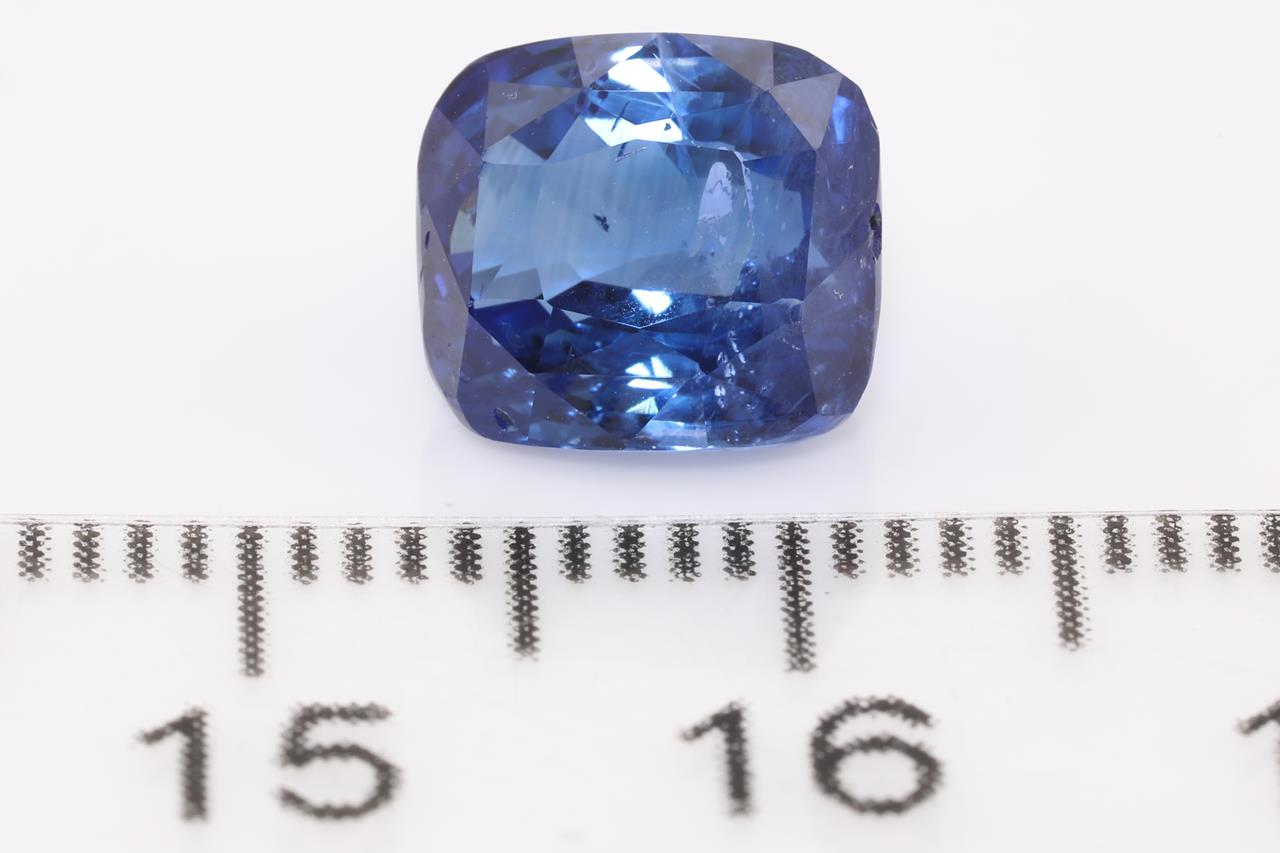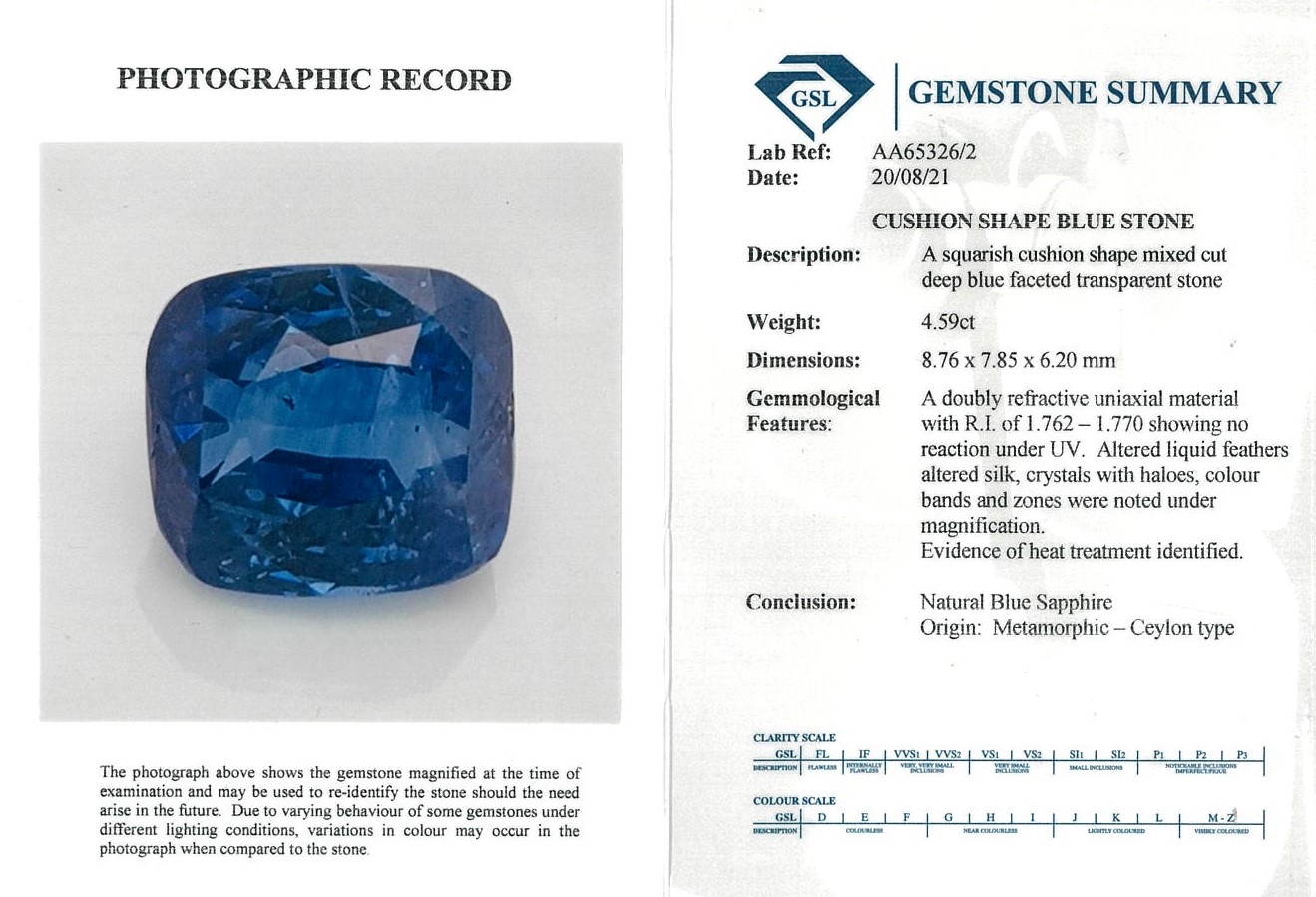 A loose cushion cut Ceylon blue Sapphire of 4.59ct. With GSL report AA65326/2. Origin: Ceylon. (As new)