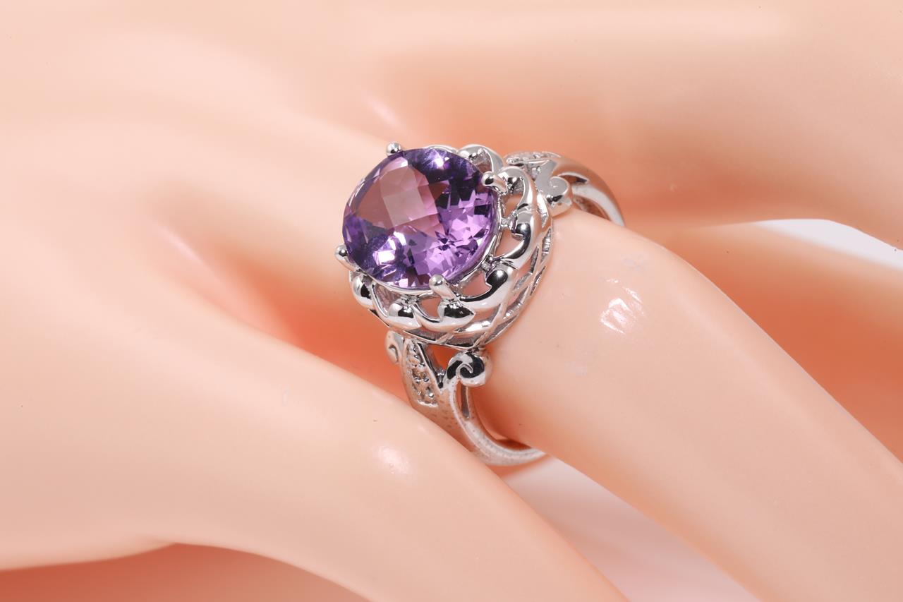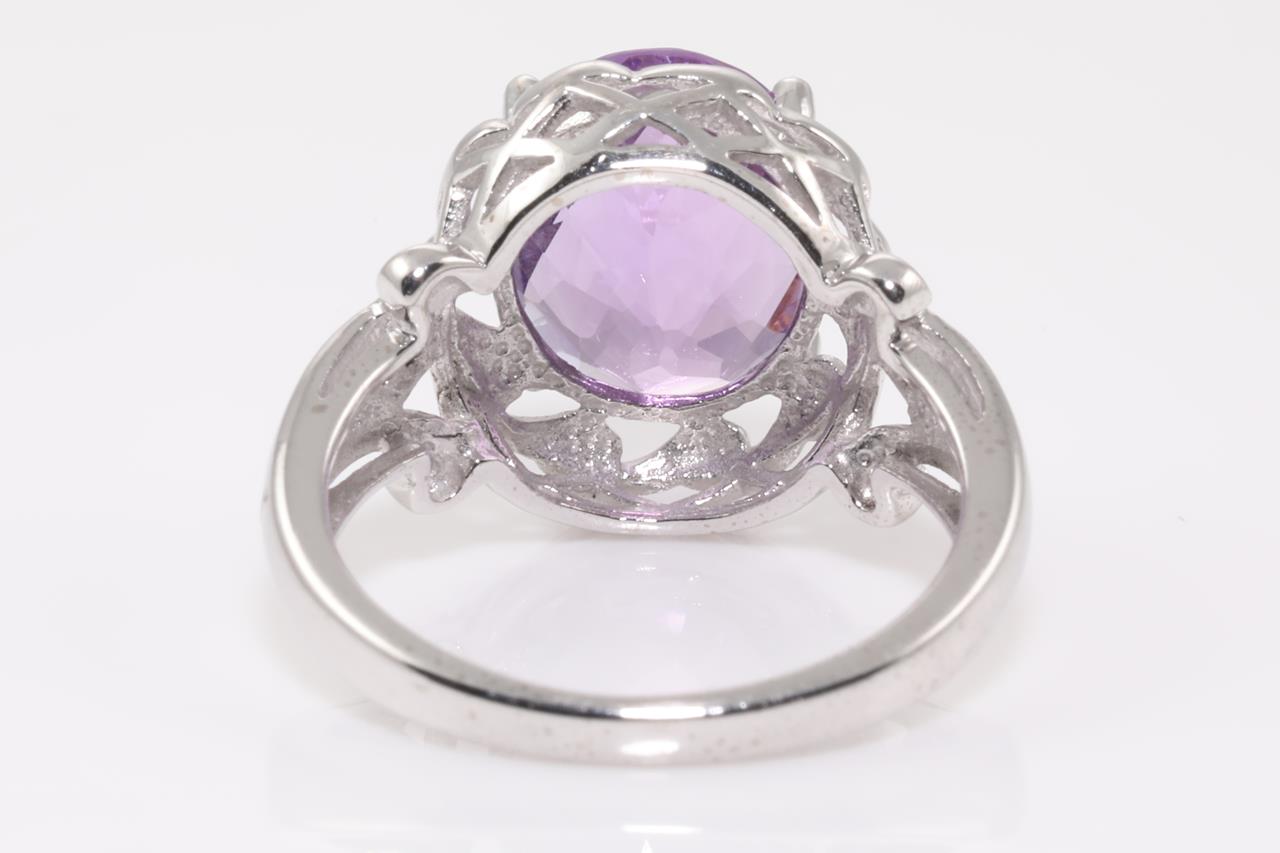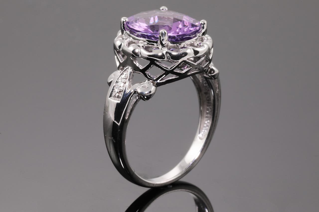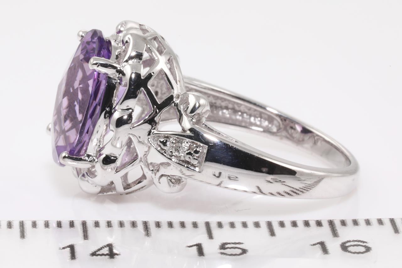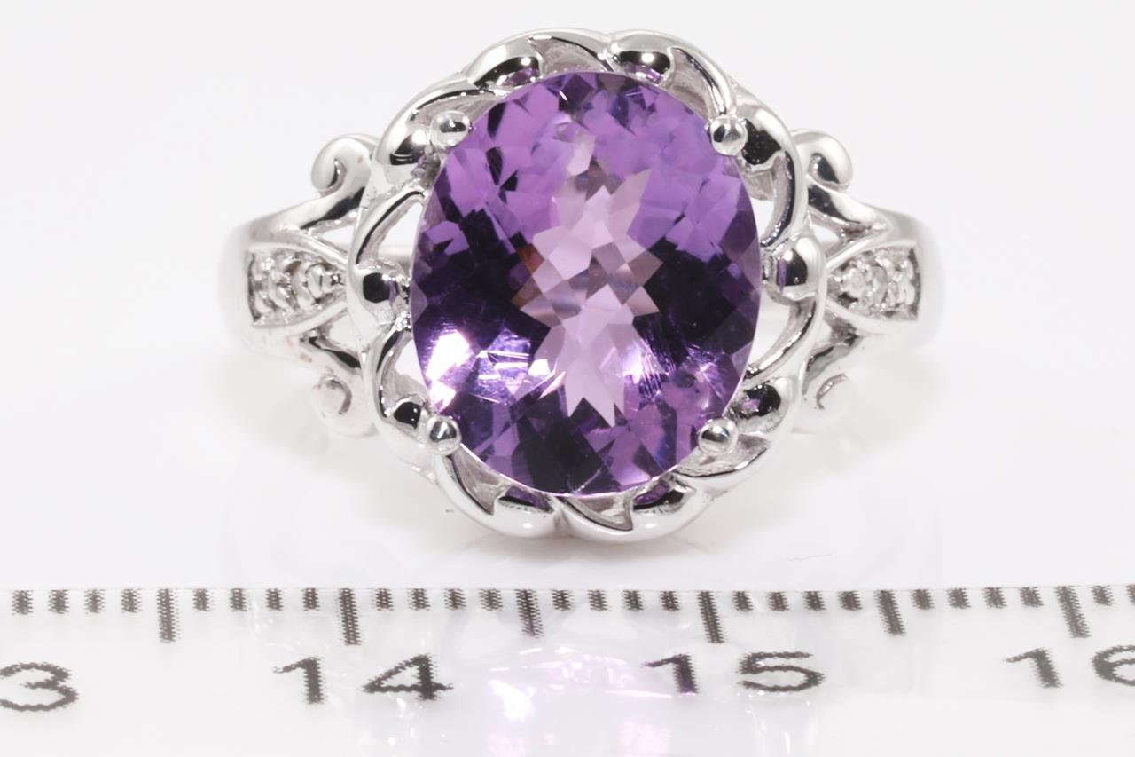 Amethyst and Diamond ring with centre oval cut Amethyst of approximately 4.60ct and round Diamonds totalling approximately 0.02ct. 10ct white gold. Ring size N. Weight 4.3g. (Pre-owned)