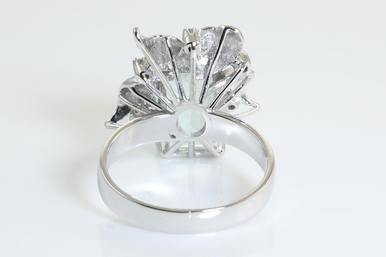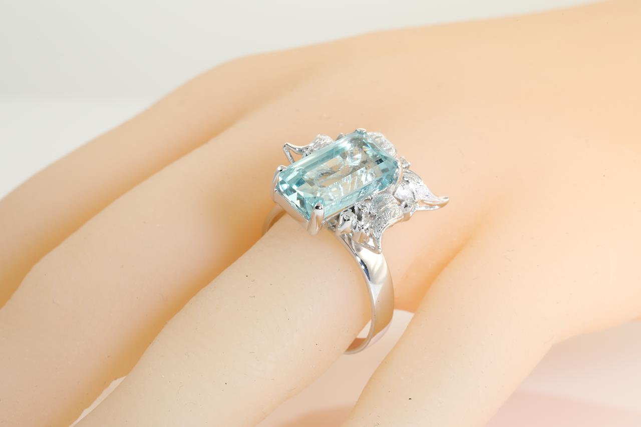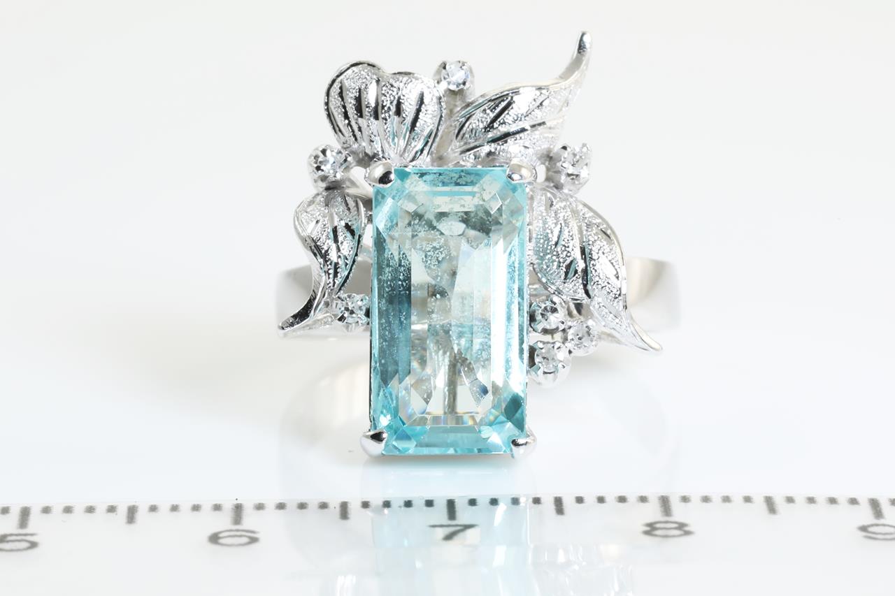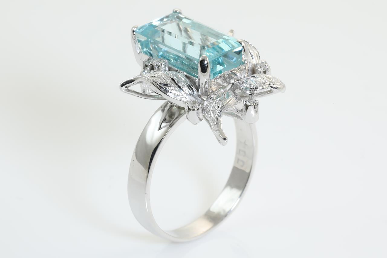 Aquamarine and Diamond ring with emerald cut Aquamarine of approximately 4.60ct and Diamonds totalling 0.03cts. 14ct white gold. Ring size O. With a copy valuation certificate dated 1 June 2019. Weight: 7.0g (Pre-owned)