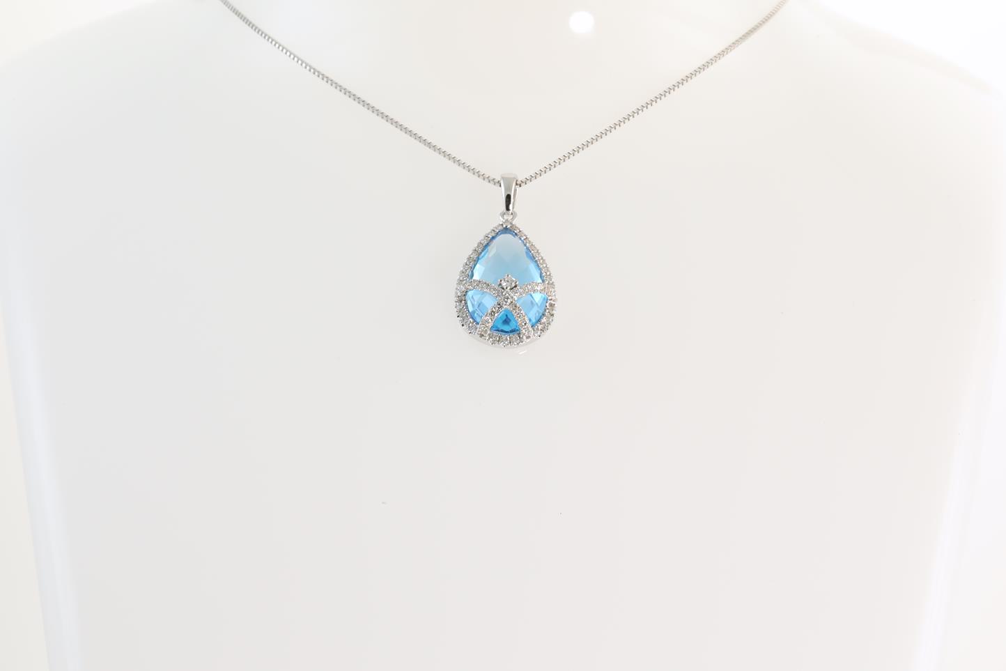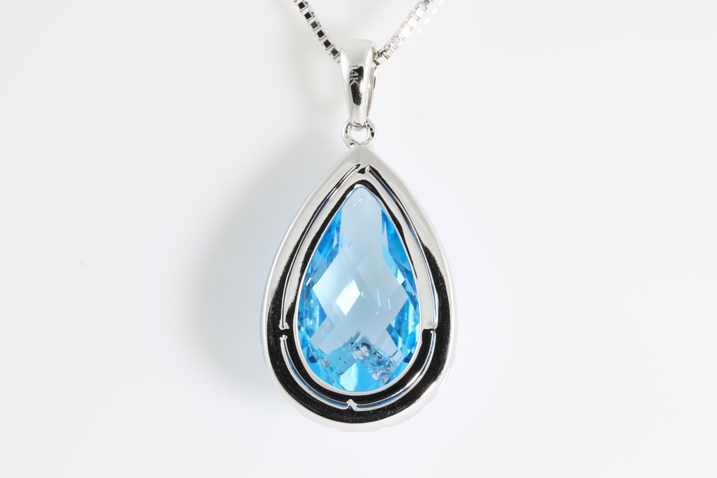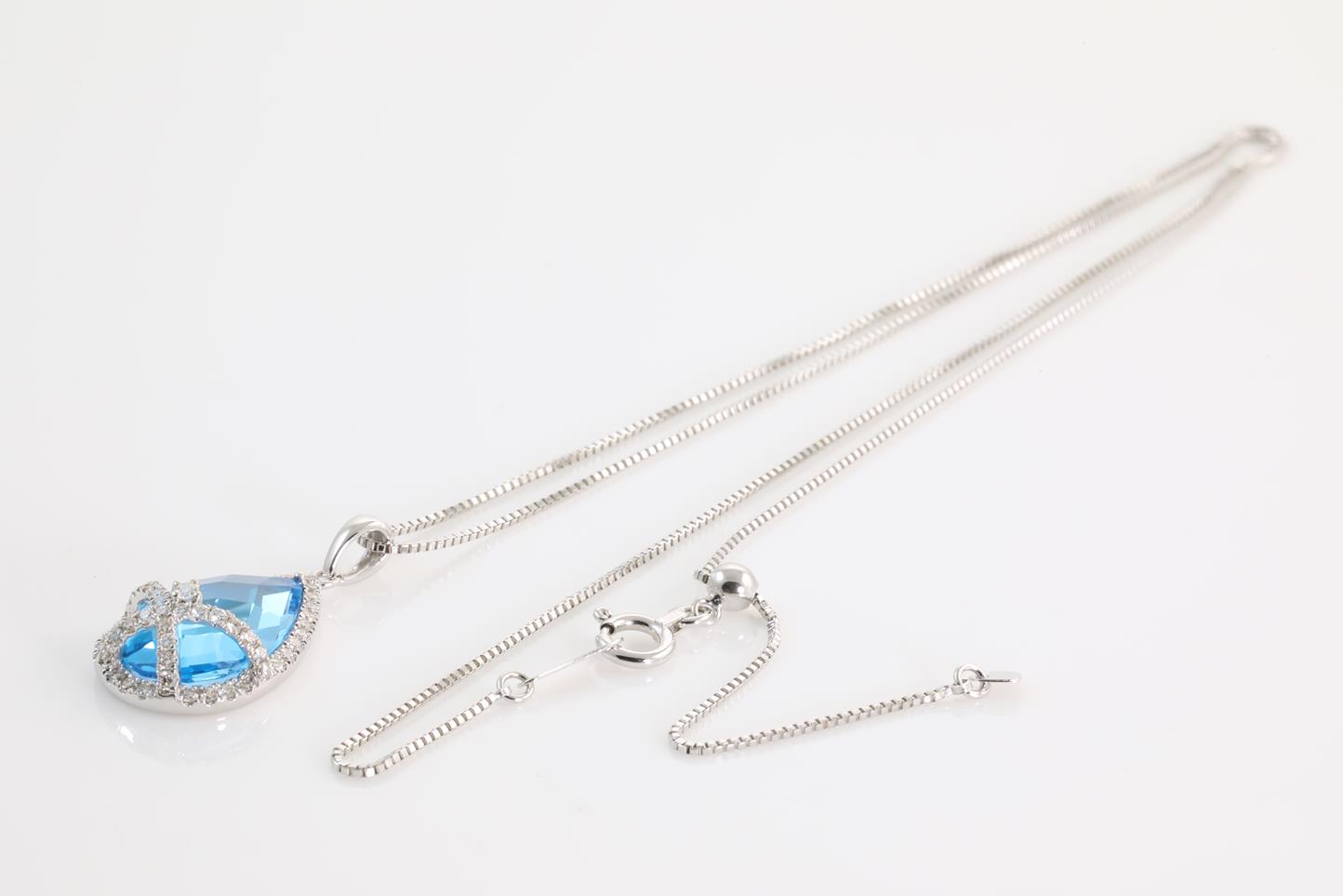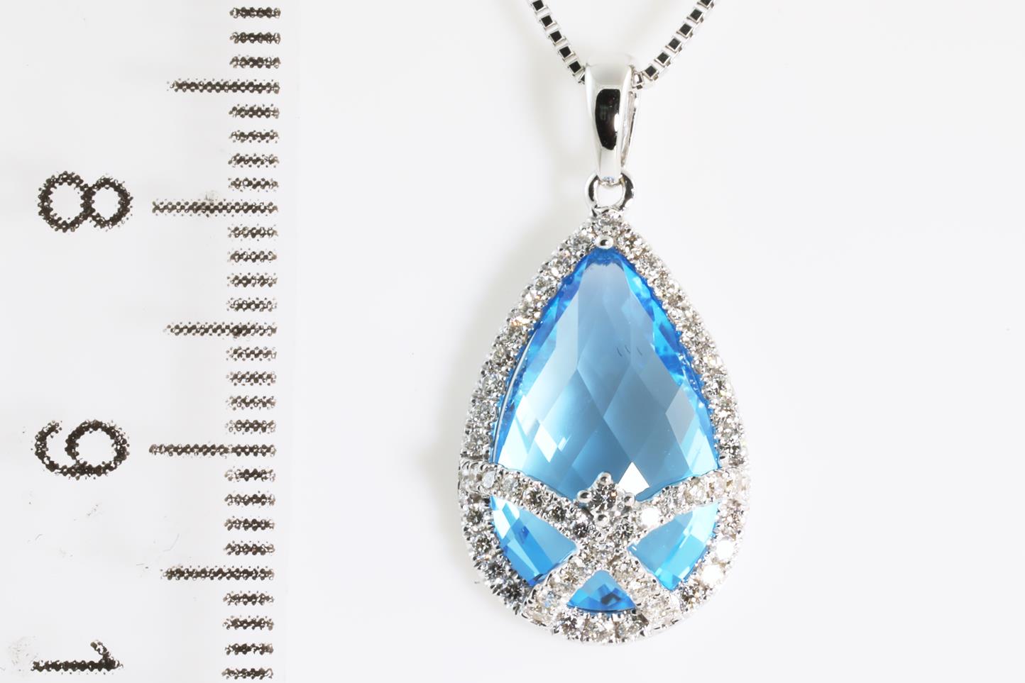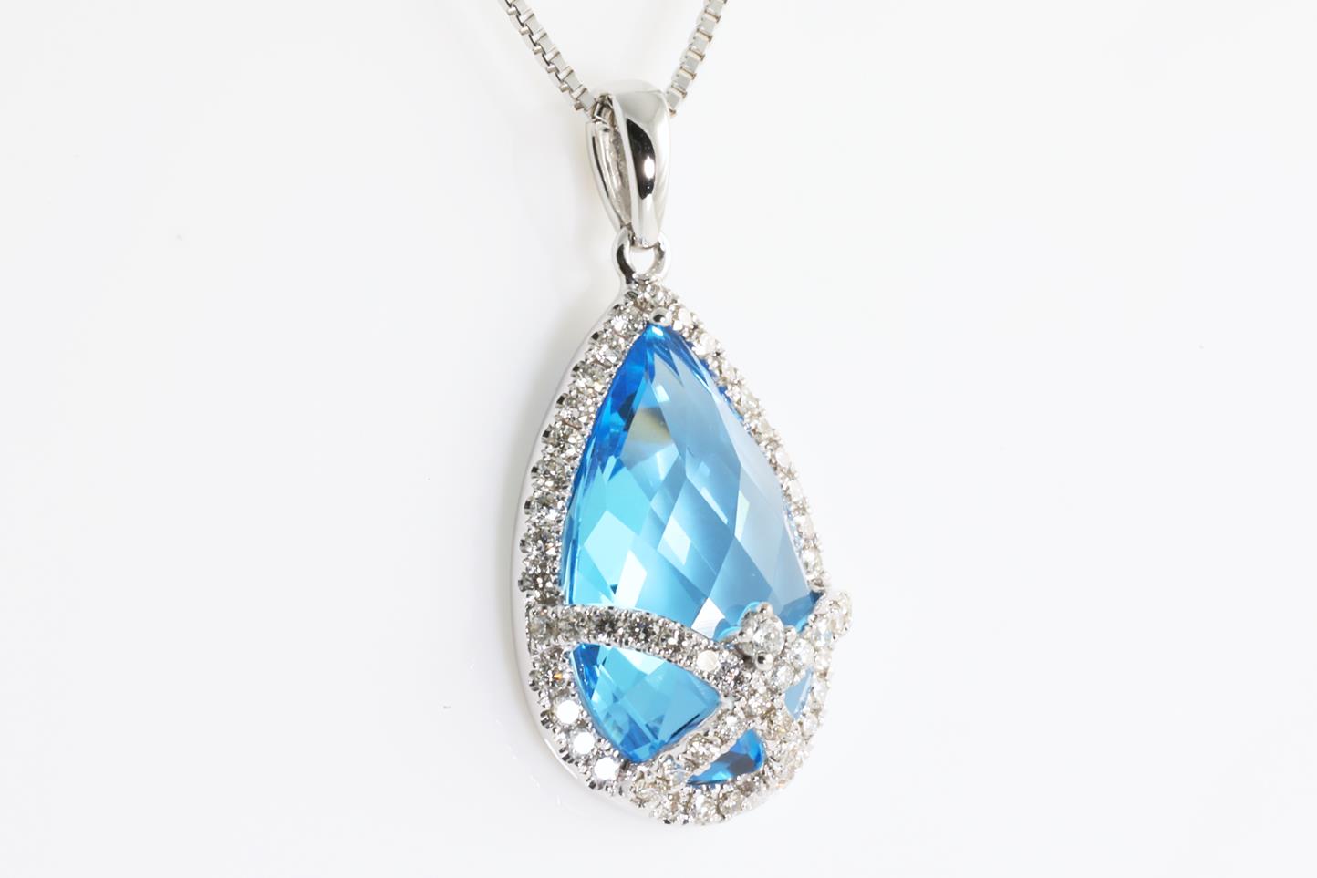 Topaz and Diamond pendant with pear shape Blue Topaz of 4.60ct and Diamonds totalling 0.33cts (Estimated grading: H SI). 14ct White gold with 18ct gold adjustable 45cm chain. Weight 4.2g (New)