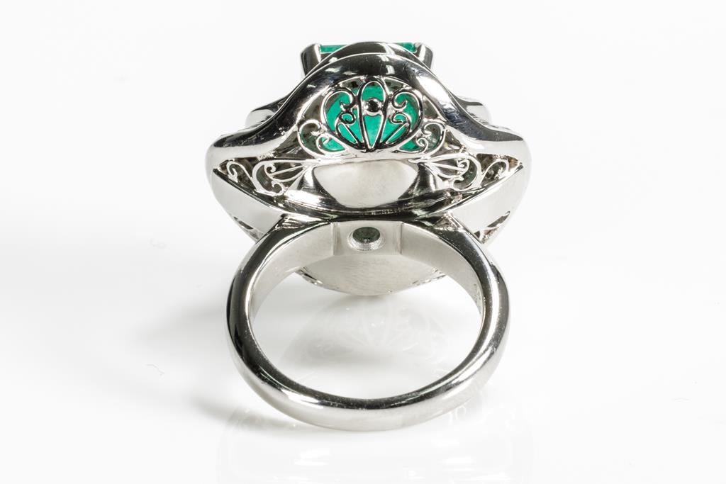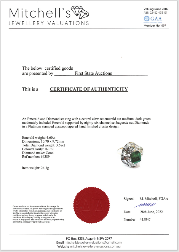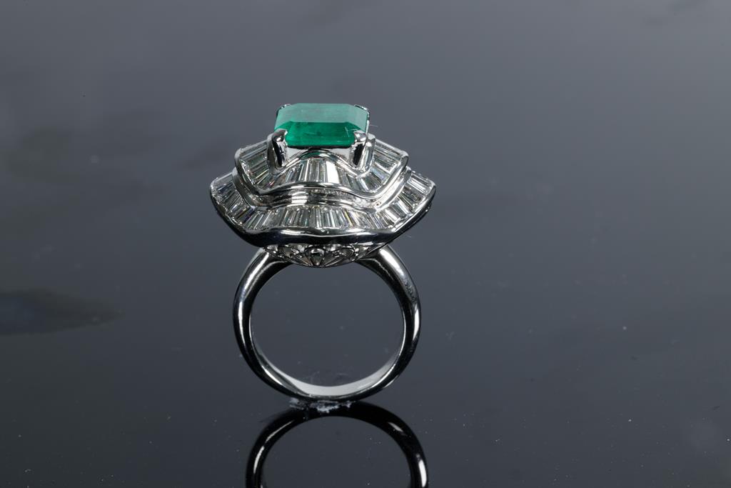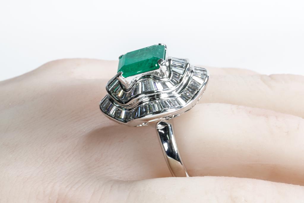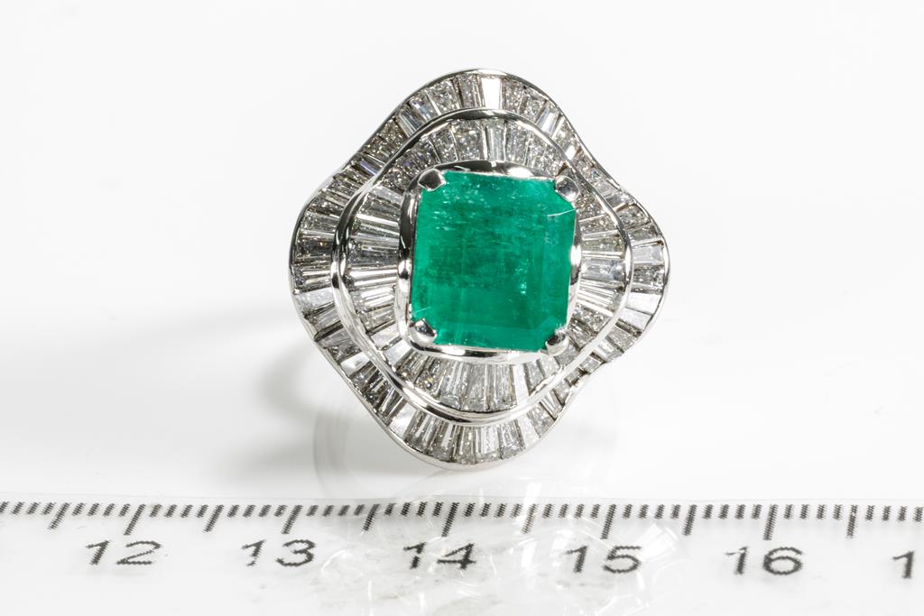 Emerald and Diamond ring with an emerald cut Emerald of 4.60ct and baguette cut Diamonds totalling 3.68cts (Estimated grading: H-I SI). Platinum-900. Ring size: L. Weight: 24.3g. With Certificate #415847. (Pre-owned)