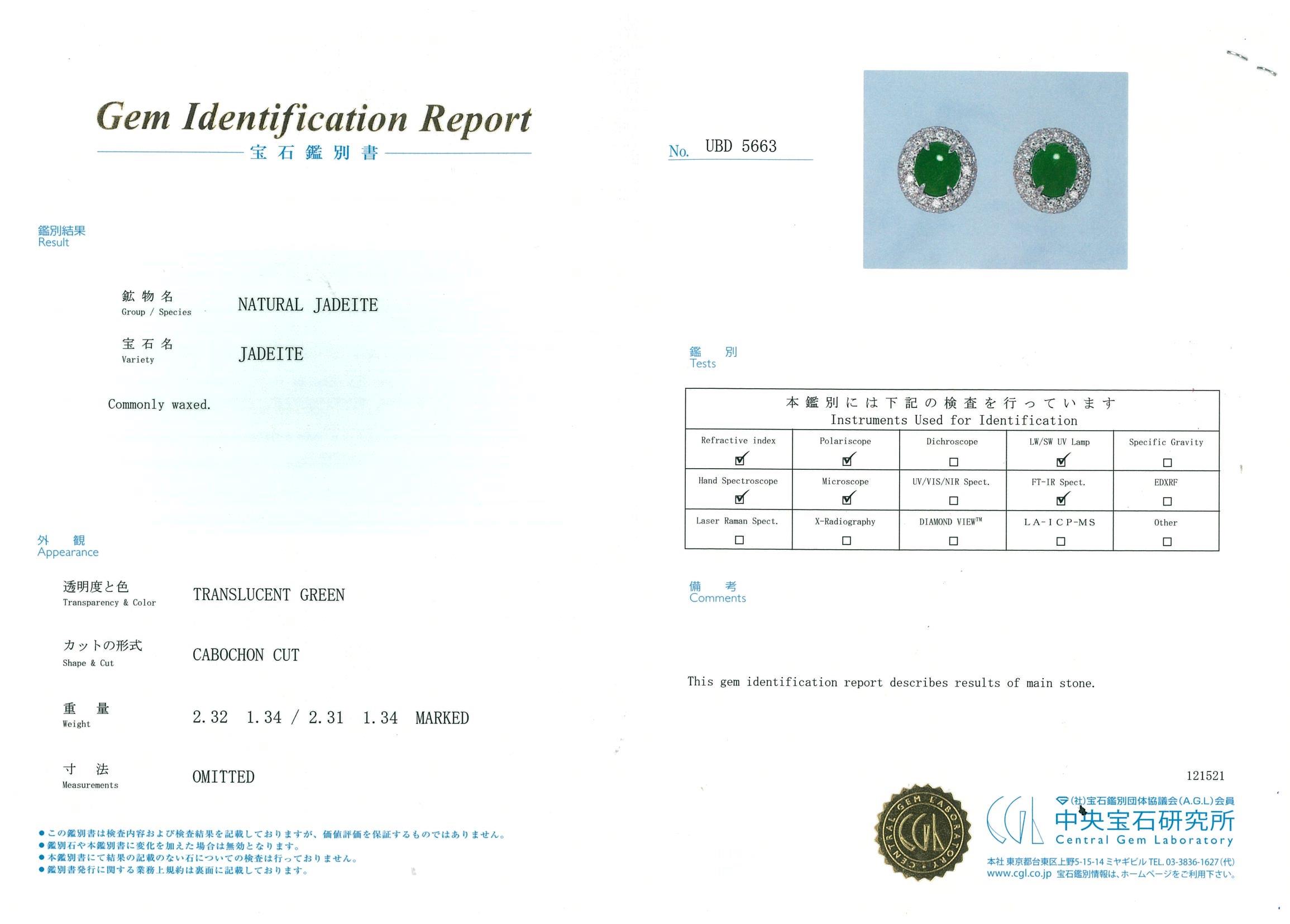 Jade and Diamond Earrings with oval cabochon cut translucent green Natural Type A Jadeite Jade totalling 4.63cts and Diamonds totalling 2.68cts (Estimated grading: G SI). 18ct white gold. Weight: 7.3g. With Gem Identification Report #ubd5663. (Pre-owned)