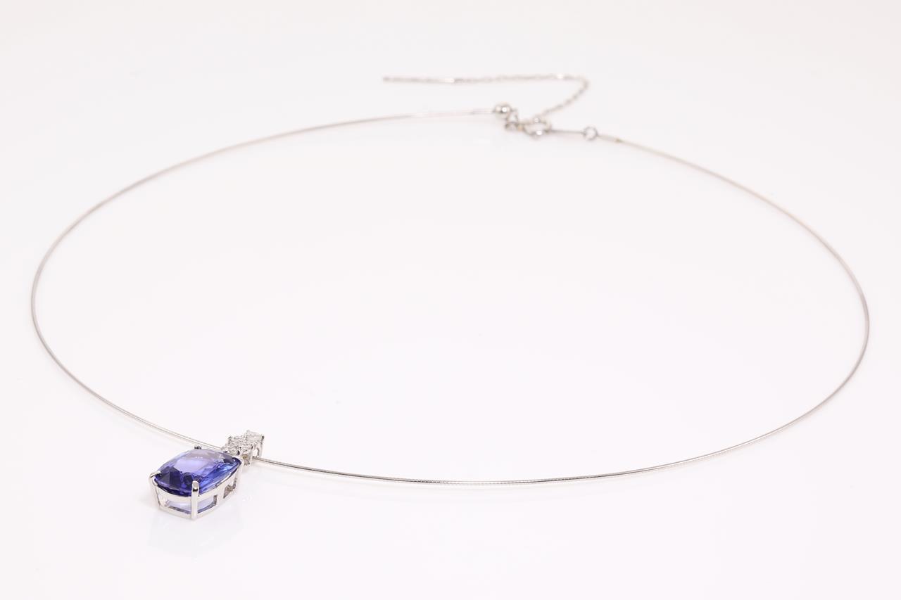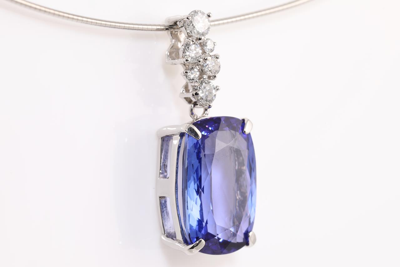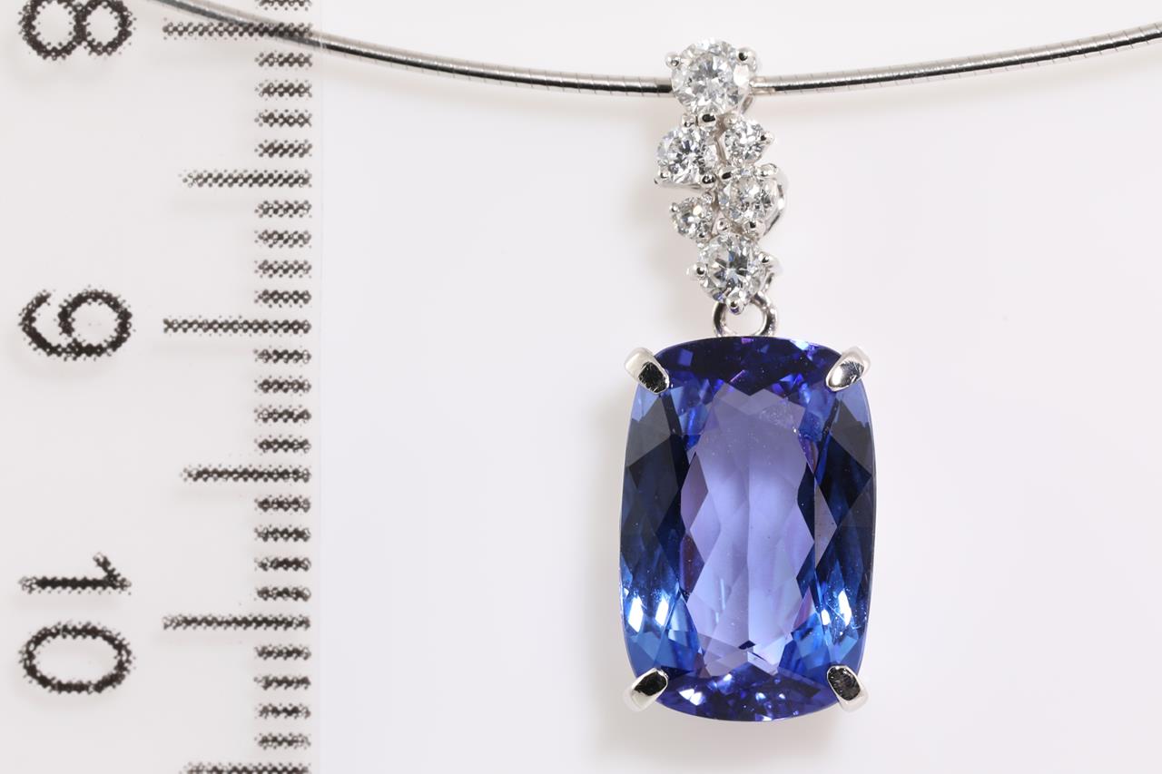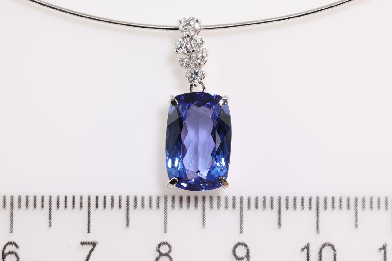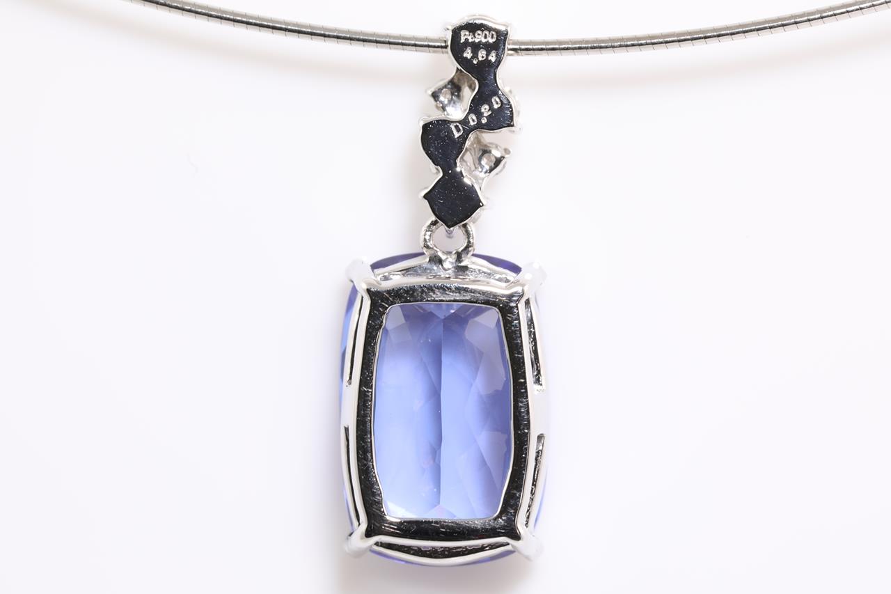 Tanzanite and Diamond pendant with a cushion cut Tanzanite of 4.64ct and Diamonds totalling 0.20cts. Platinum with 45cm adjustable necklet. Weight: 5.4g. (Pre-owned)