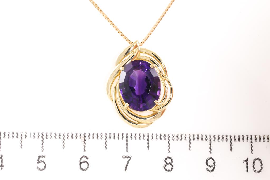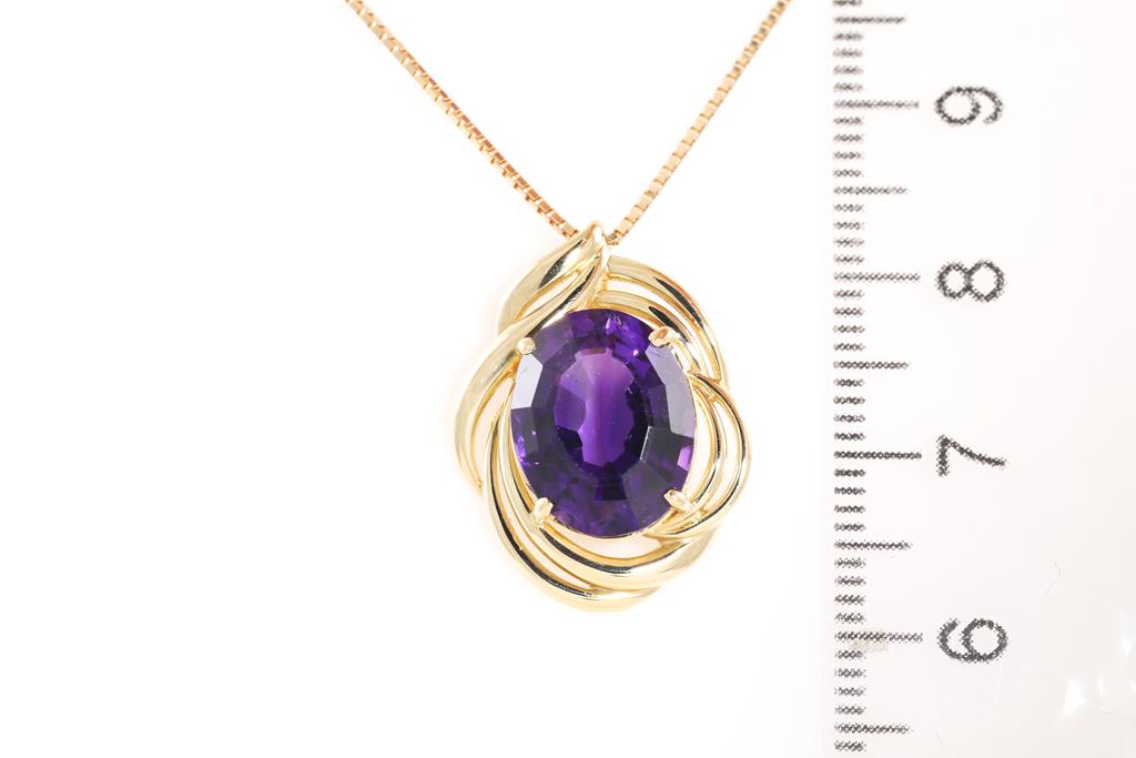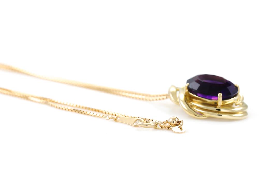 Amethyst pendant with oval Amethyst of 4.35ct. 18ct yellow gold with 44cm adjustable chain. Weight: 6.2g. (Pre-owned)