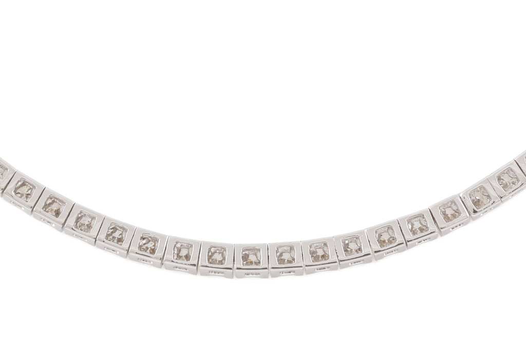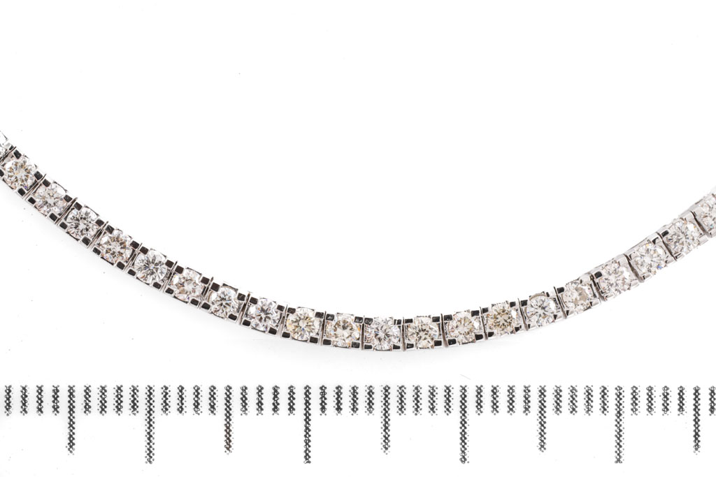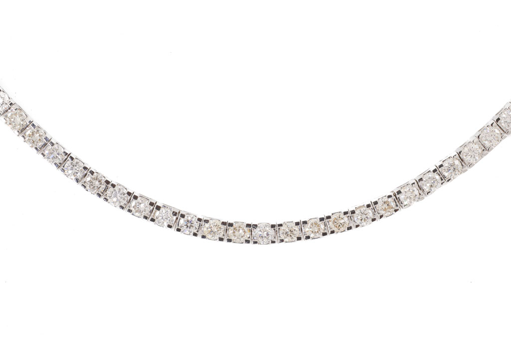 Diamond tennis necklace with 166 round Diamonds totalling 4.69cts (Estimated grading: I-J SI). 14ct white gold. Length 42cm. Weight: 17.7g. With certificate #417218. (New)