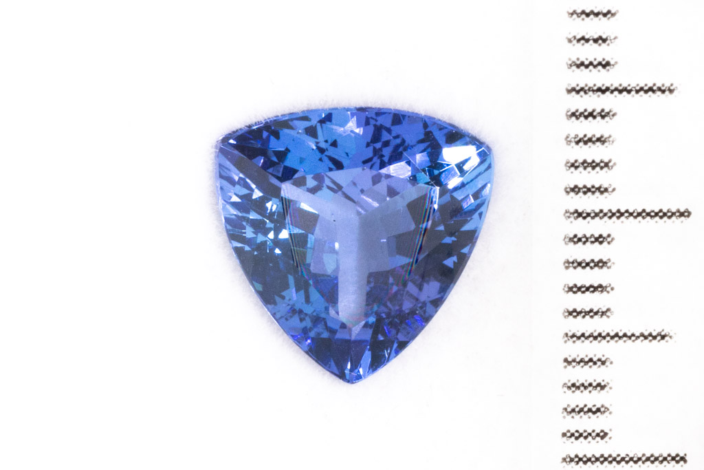 A loose trilliant cut Tanzanite of 4.69ct. Dimensions: 11.33mm x 11.19mm x 5.85mm. (As New)