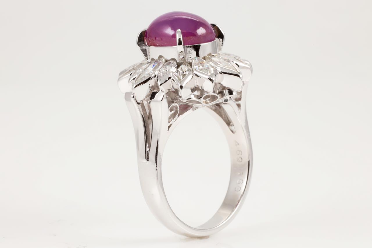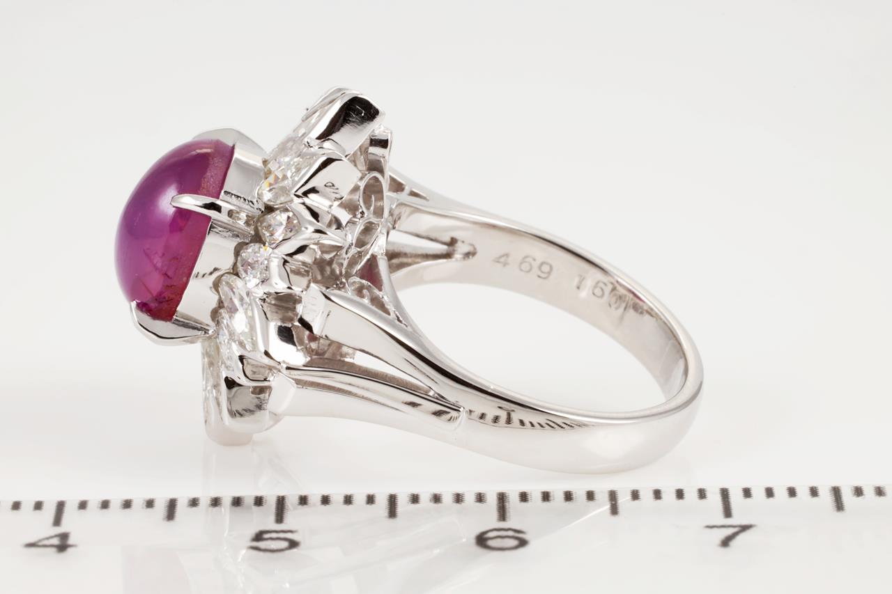 Ruby and Diamond ring with oval star Ruby of 4.69ct with marquise cut Diamonds totalling 1.60cts (Estimated grading: G VS). Platinum. Ring size I1/2 - Note this ring can only be resized up by a maximum of 3 sizes, down by ring clip. Weight: 10.1g. With certificate #414051. (Pre-owned)
