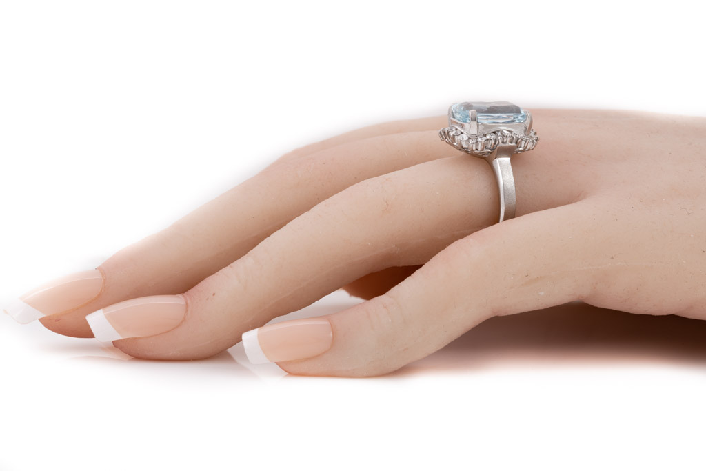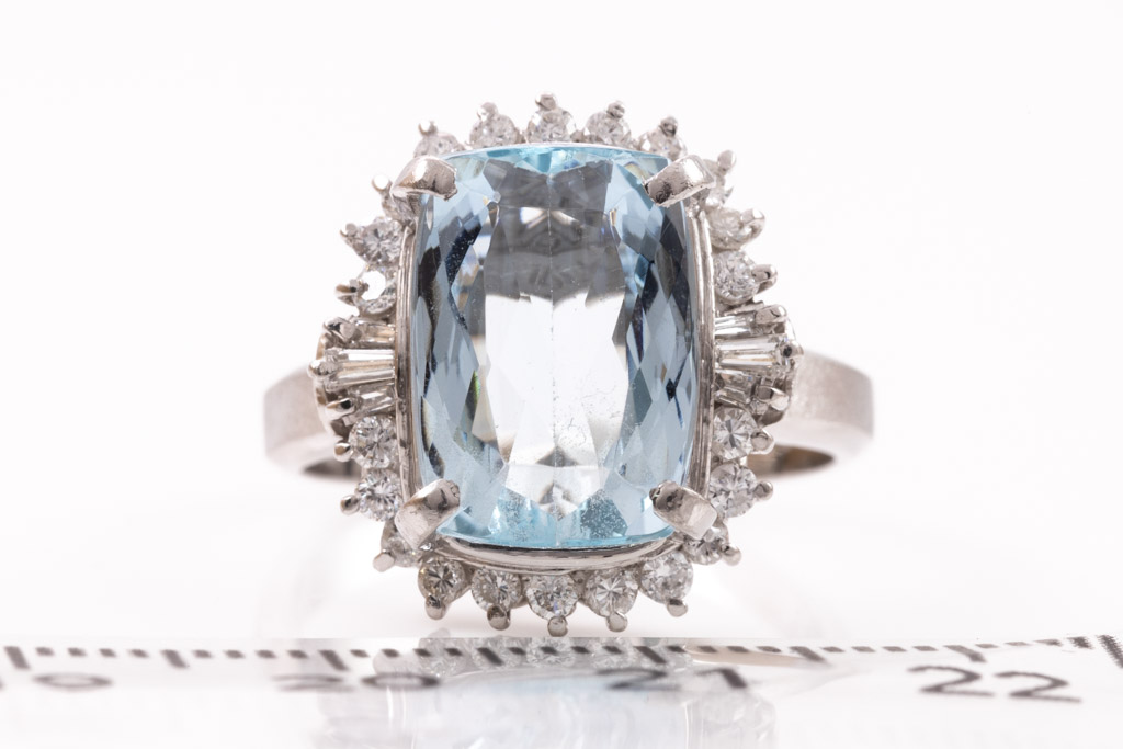 Aquamarine and Diamond ring with cushion rectangular cut Aquamarine of 4.71ct and round & baguette cut Diamonds totalling 0.53cts (Estimated grading: G SI). Platinum. Ring size O. Weight: 9.9g. (Pre-owned)
