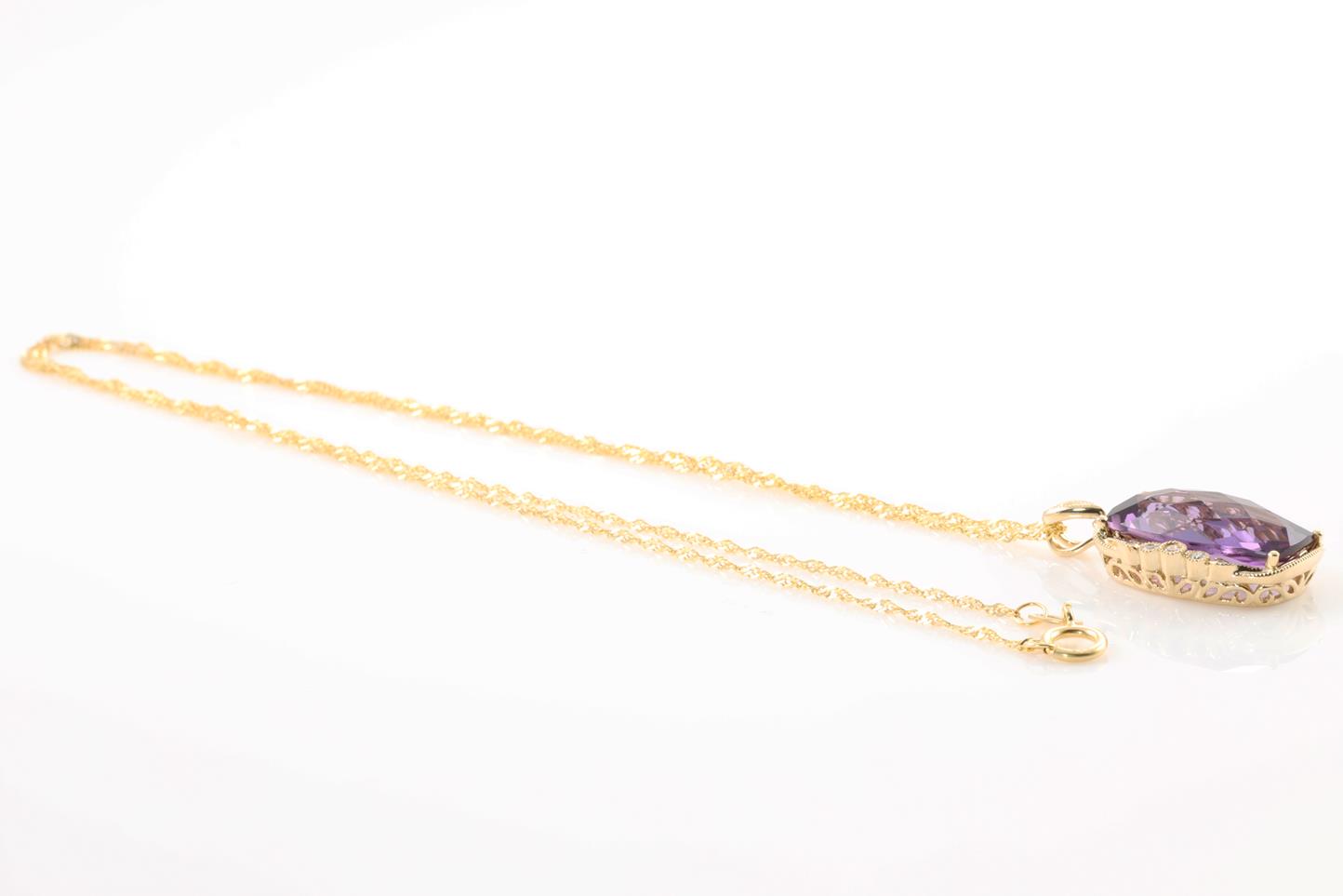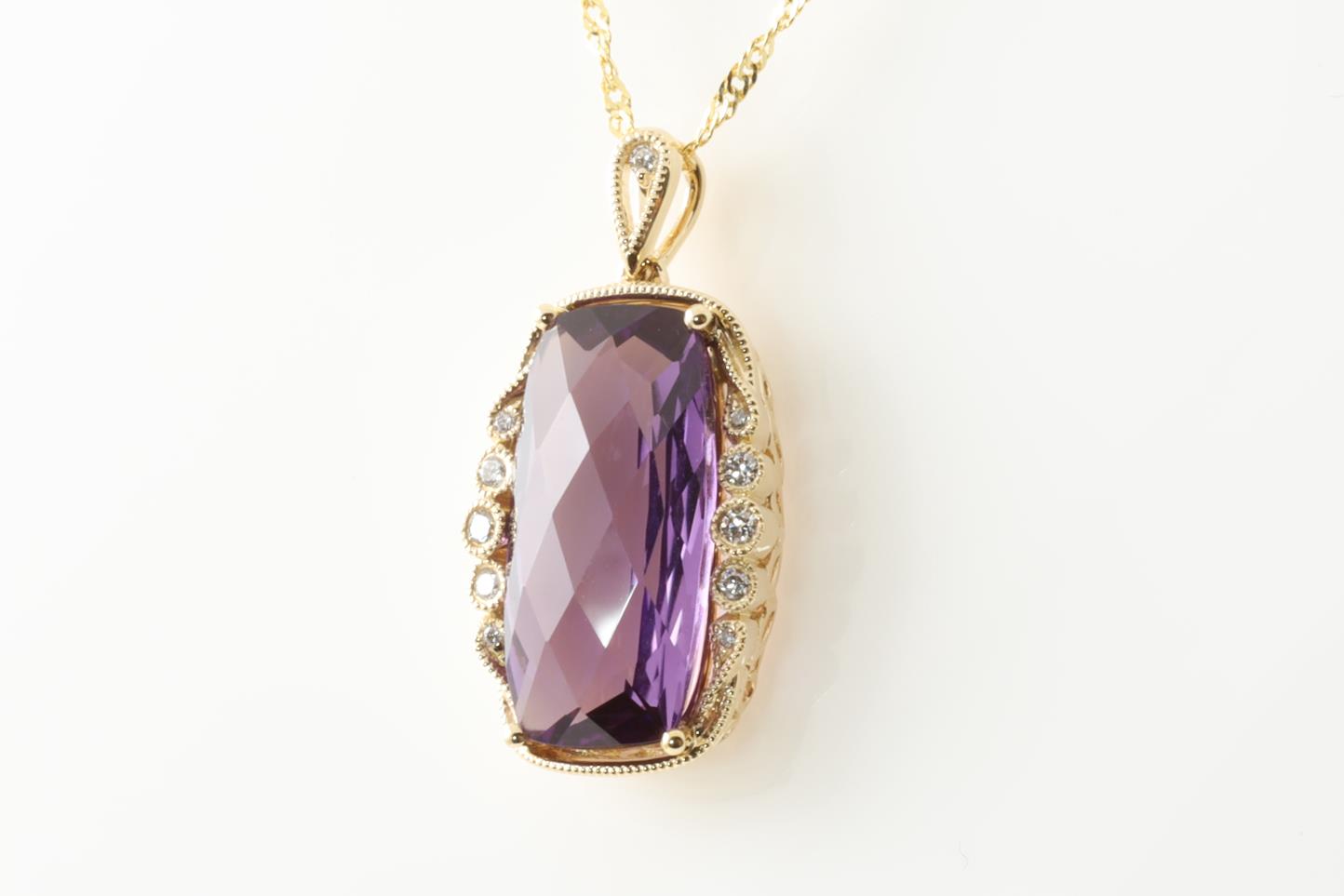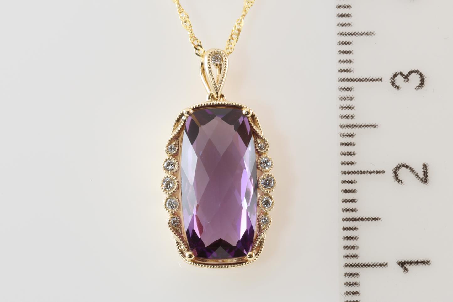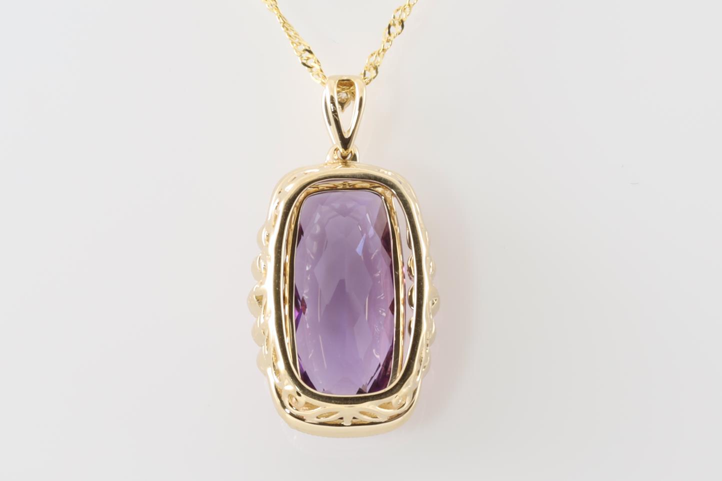 Amethyst and Diamond pendant with cushion cut Amethyst of 4.74ct and Diamonds totalling 0.09cts. 14ct Yellow gold with yellow gold 45cm chain. Weight: 4.4g (New)