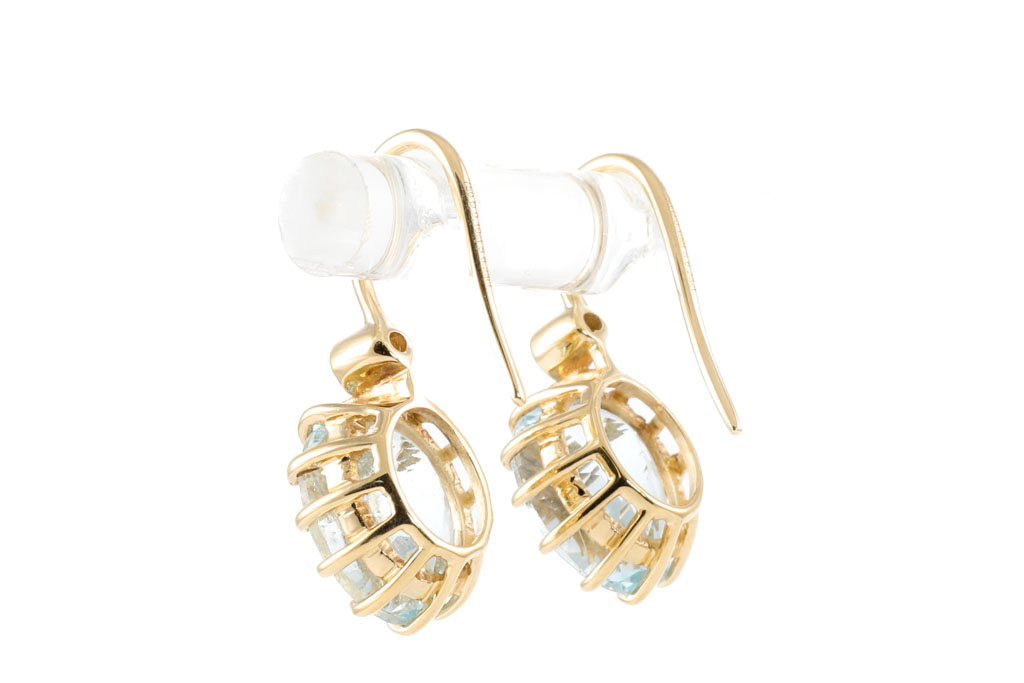 Aquamarine and Diamond shepherd hook earrings with two oval shape Aquamarines totalling approximately 4.75cts and two round Diamonds totalling 0.10cts. 18ct yellow gold. Weight: 4.0g. (Pre-owned)