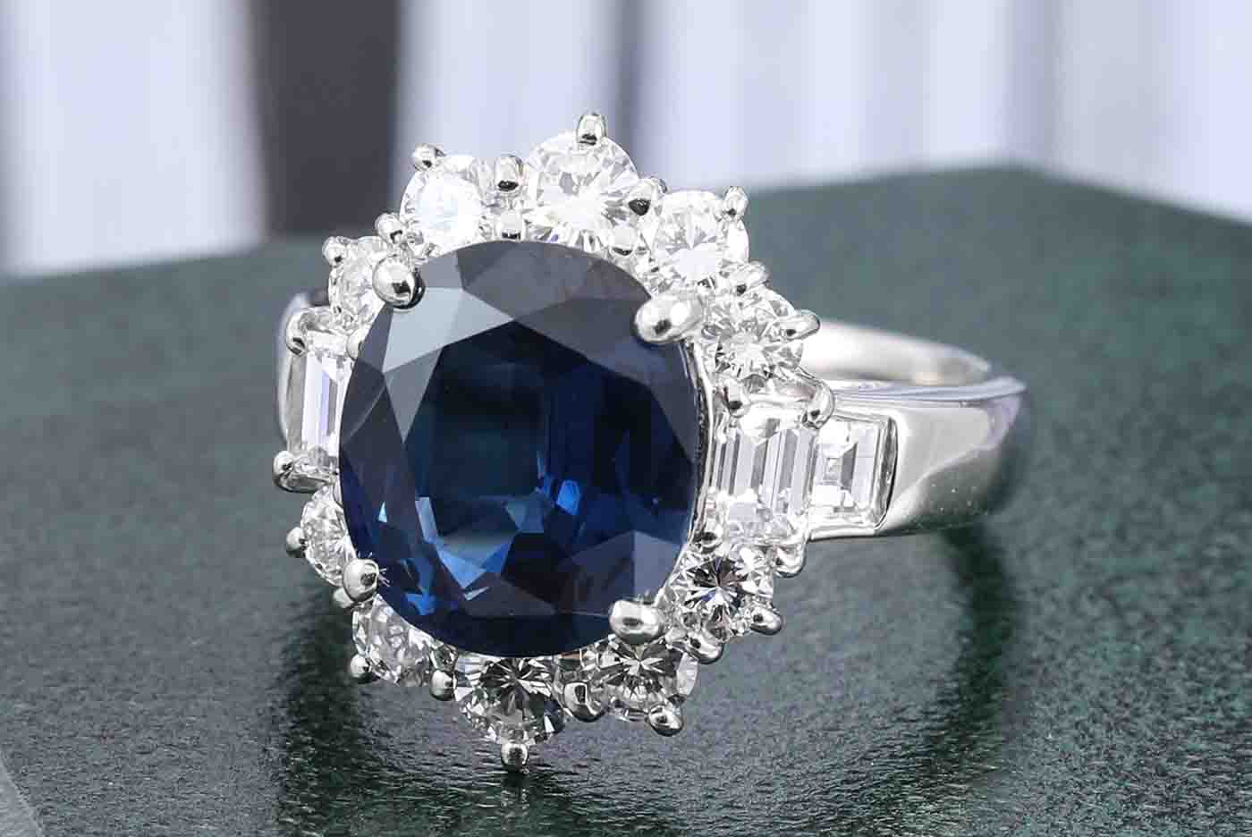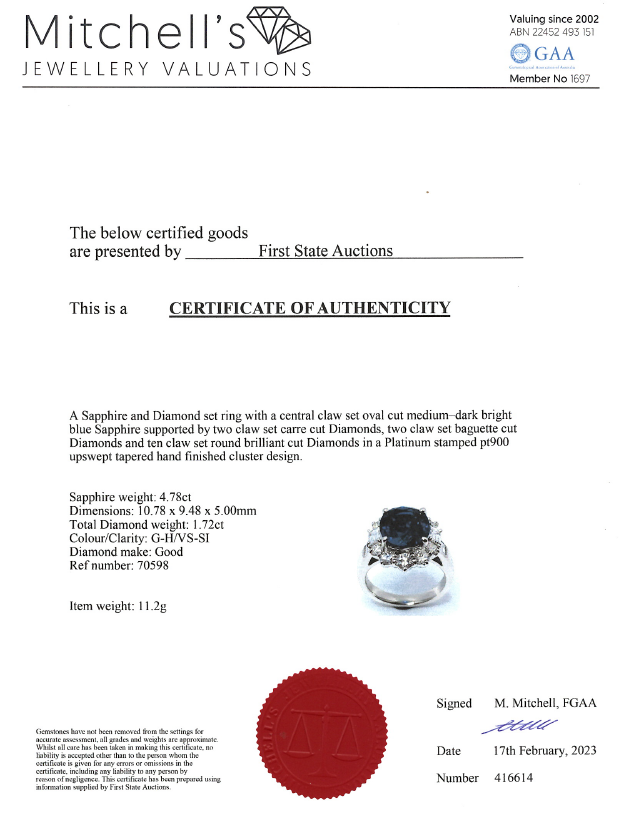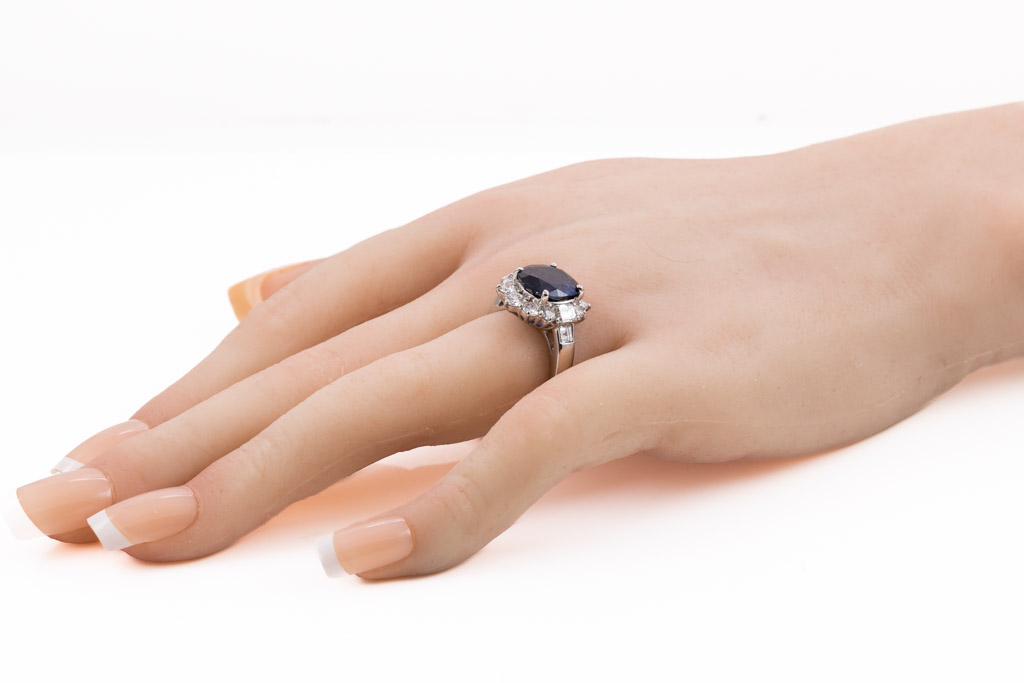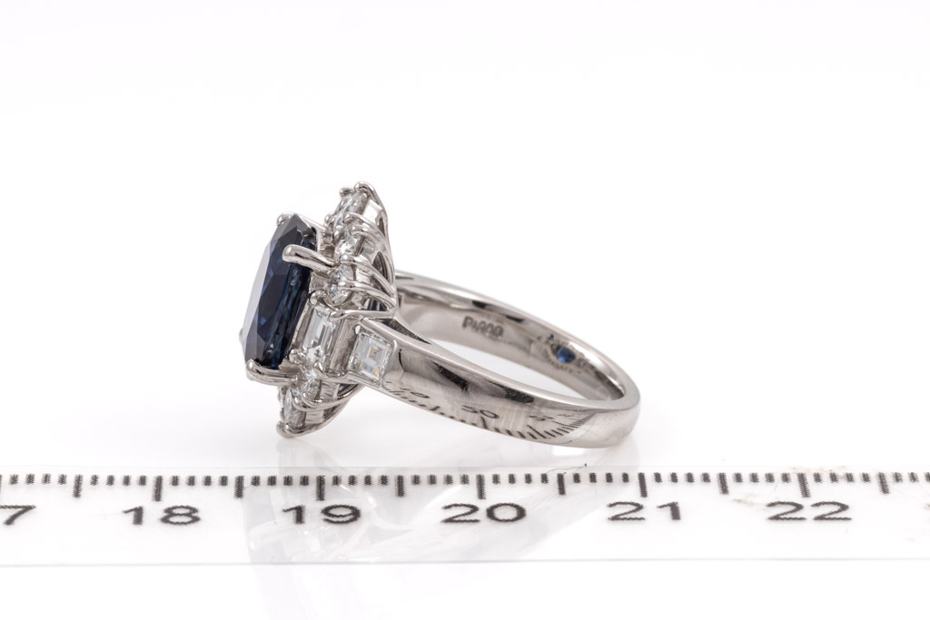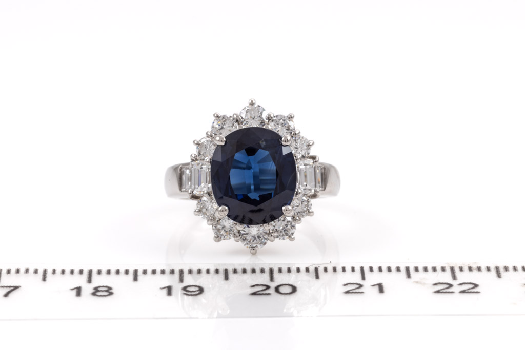 Sapphire and Diamond ring with oval blue Sapphire of 4.78ct and round, carre & baguette cut Diamonds totalling 1.72cts (Estimated grading: G-H VS-SI). Platinum. Ring size K - ring resize is not recommended. Weight: 11.2g. With Certificate #416614. (Pre-owned)