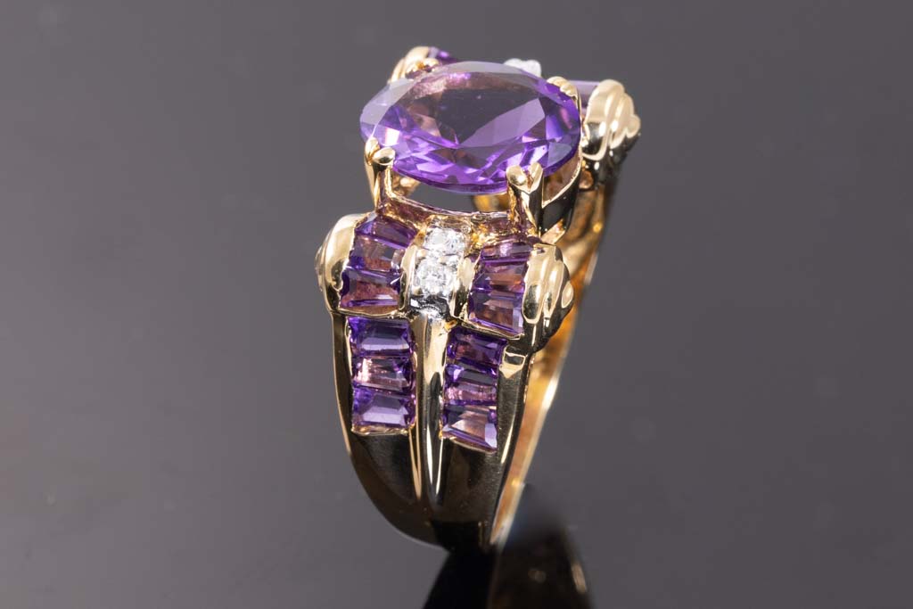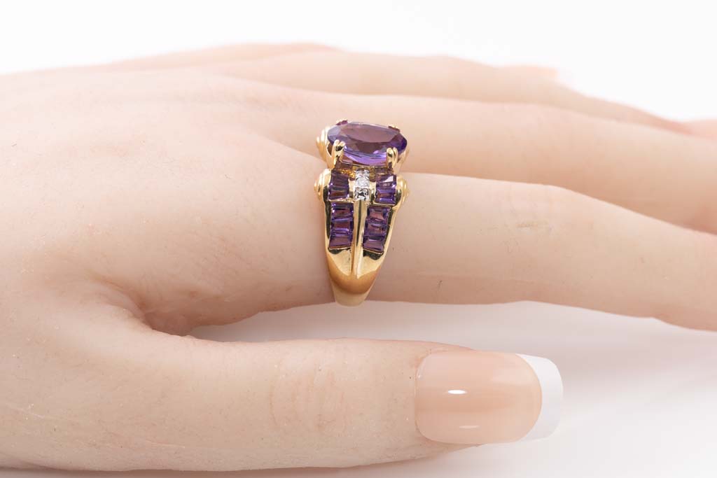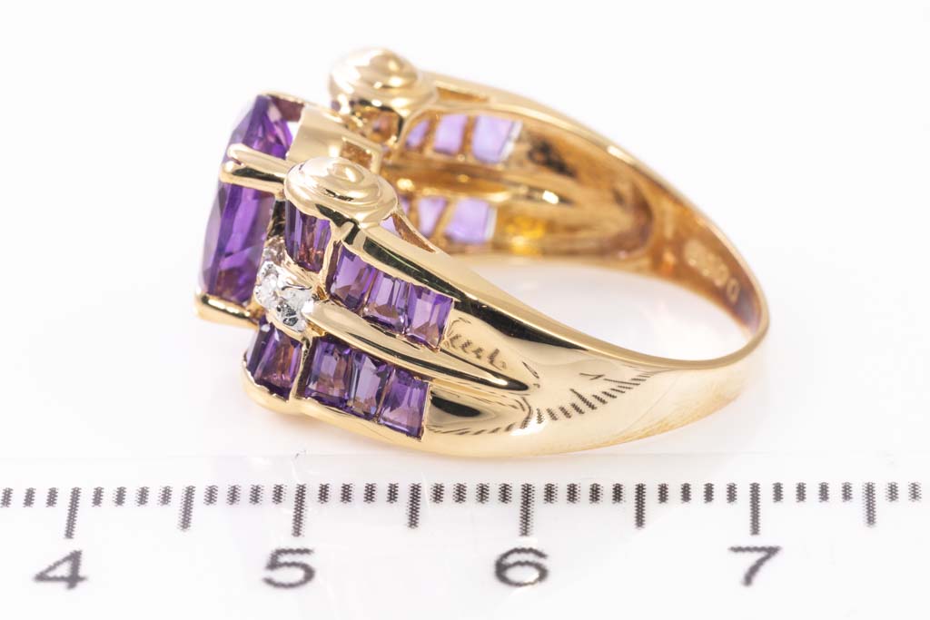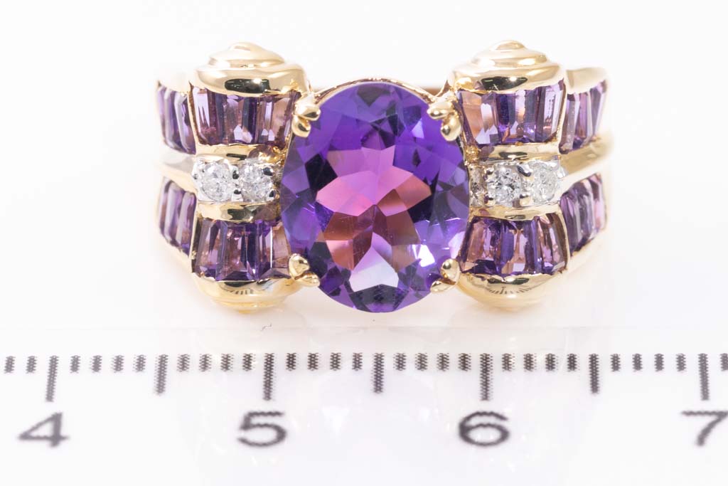 Amethyst and Diamond ring with centre oval Amethyst and 24 baguette cut amethysts totalling 4.80ct & round Diamonds totalling 0.08cts. 18ct yellow gold. Ring size P - ring resize is not recommended. Weight: 7.2g. (Pre-owned)