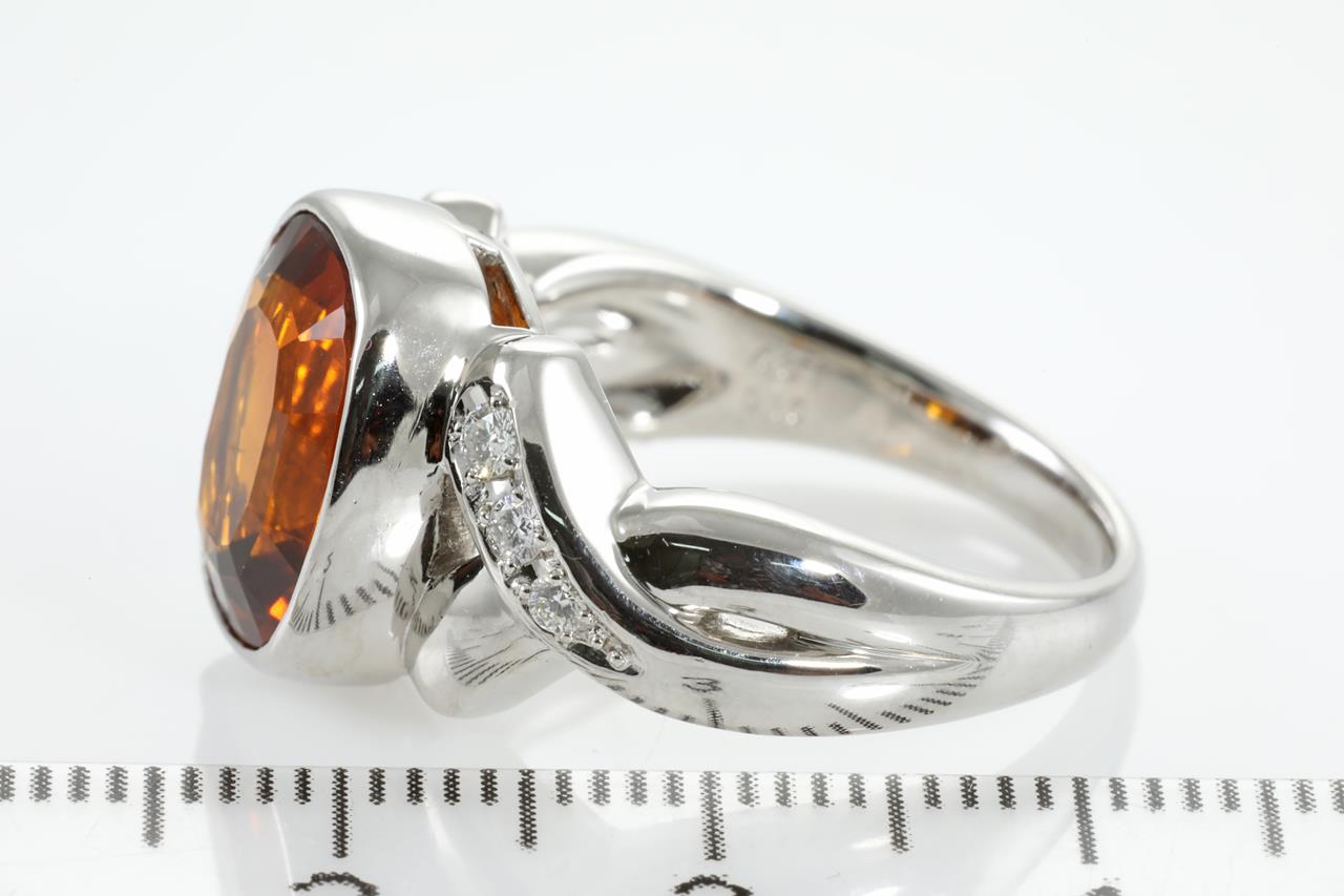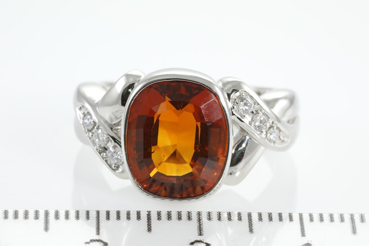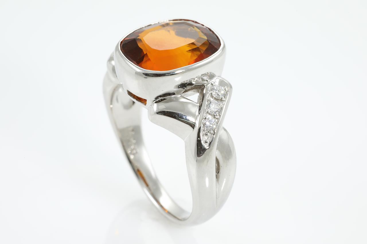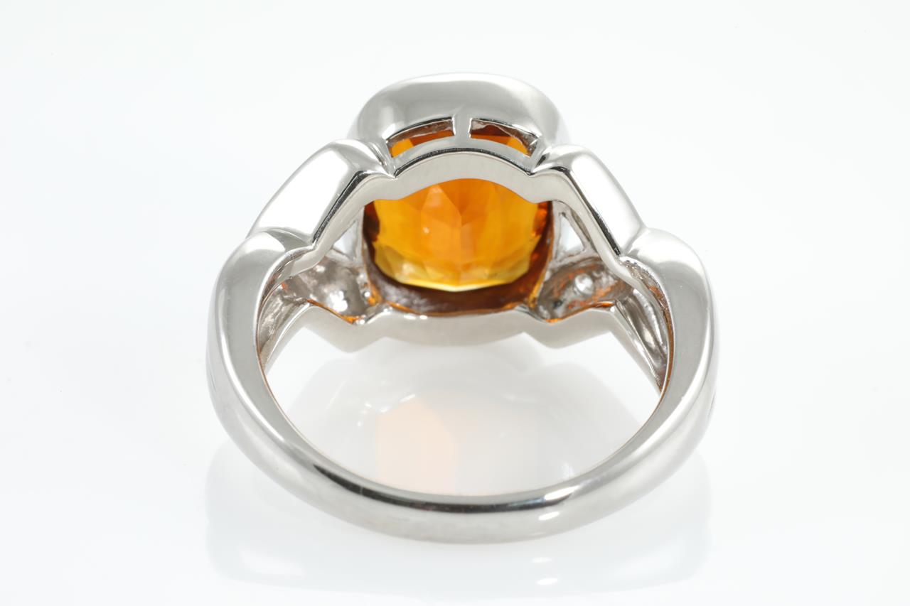 Citrine and Diamond ring with cushion cut Citrine of 4.81ct and Diamonds totalling 0.16cts. Platinum. Weight: 13.3g. Ring size Q. (Pre-owned)