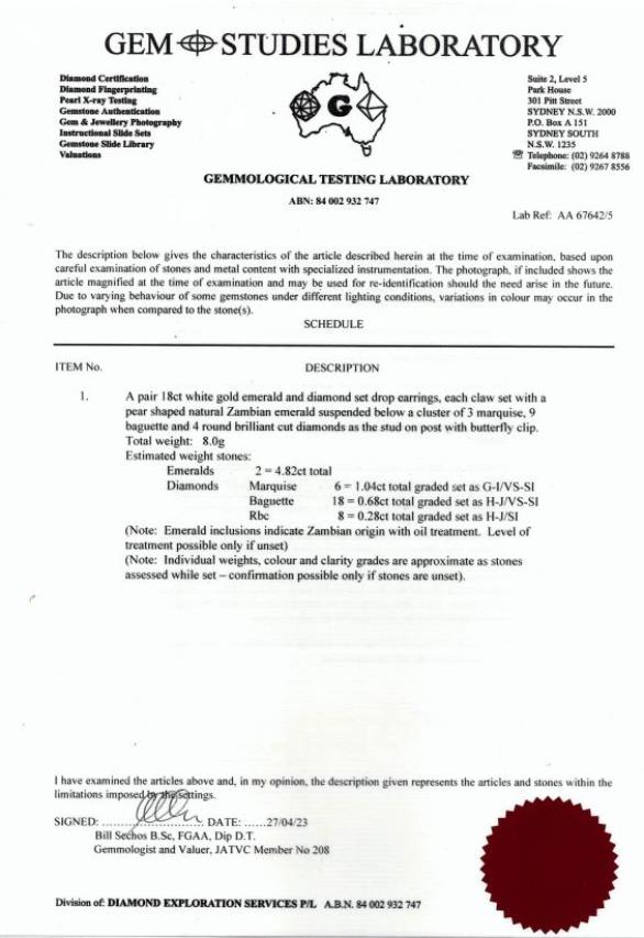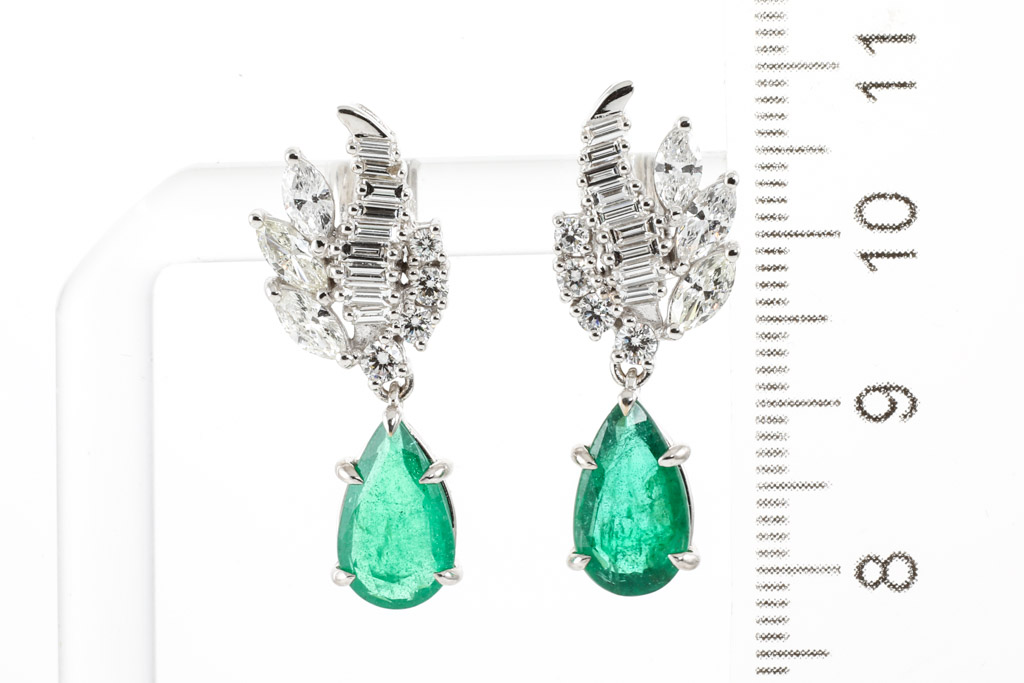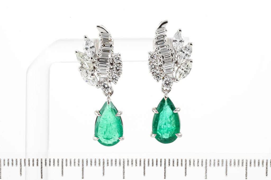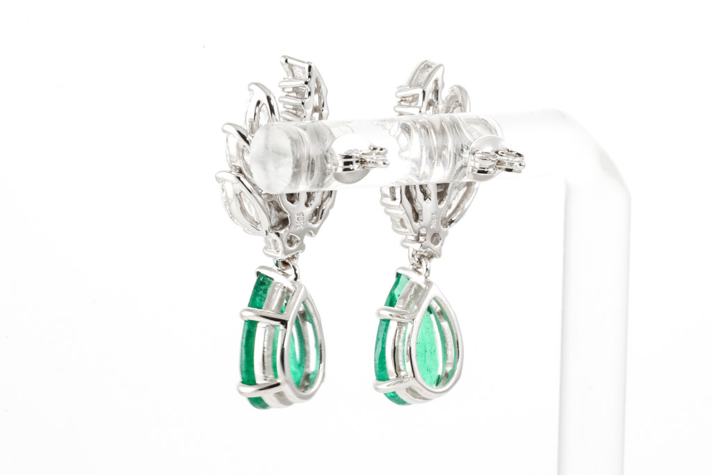 Emerald and Diamond earrings with 2 pear shape Zambian Emeralds totalling 4.82cts (with GSL Description report #AA67642/5) and round, baguette & marquise cut Diamonds totalling 2.00cts (Estimated grading: round H-J SI, baguette H-J VS-SI, marquise G-I VS-SI). 18ct white gold. Weight: 8.1g (Pre-owned)
