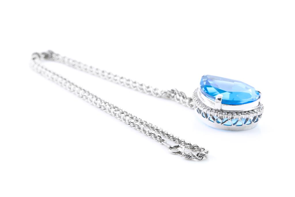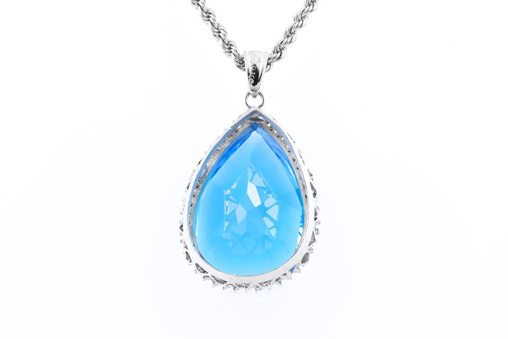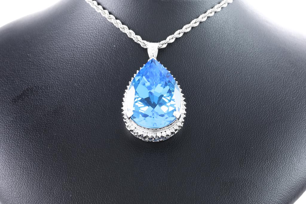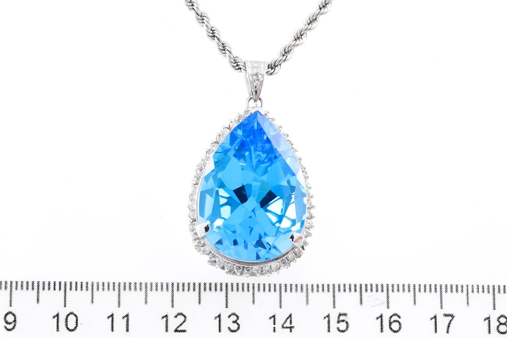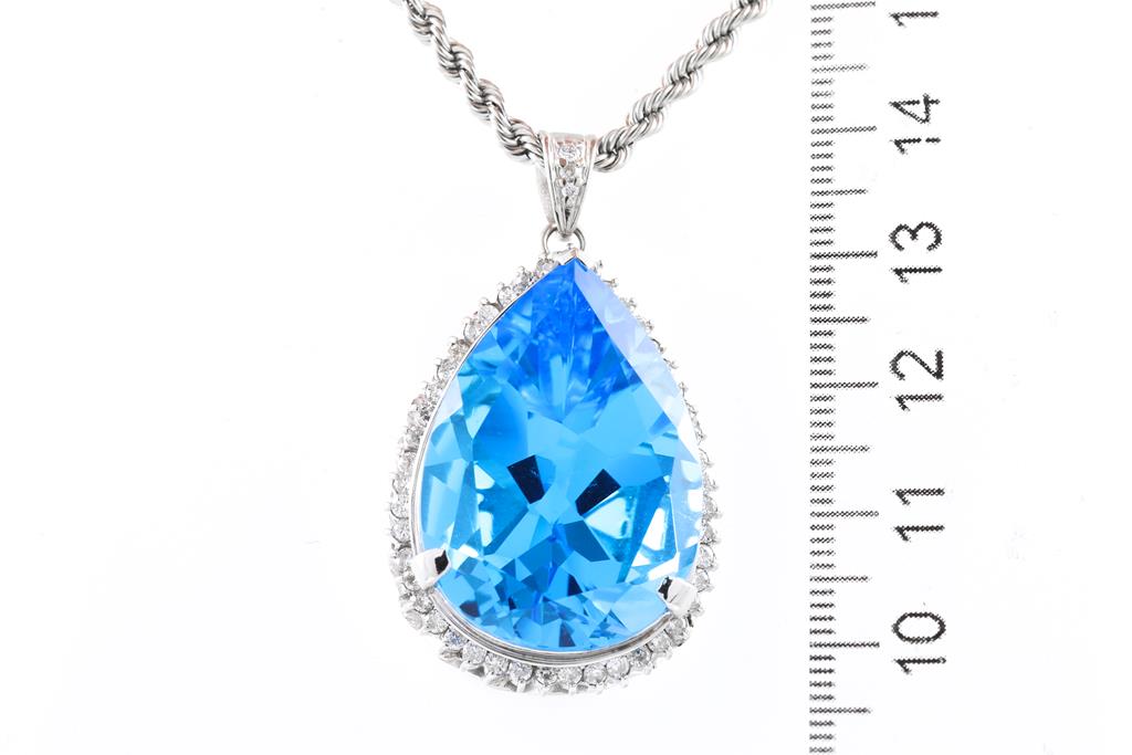 Topaz and Diamond pendant with a pear shape blue Topaz of 48.30ct and round Diamonds totalling 1.00cts (Estimated grading: H-I SI). Platinum with platinum 50cm chain. Weight: 28.1g. (Pre-owned)