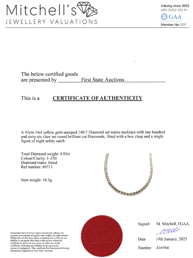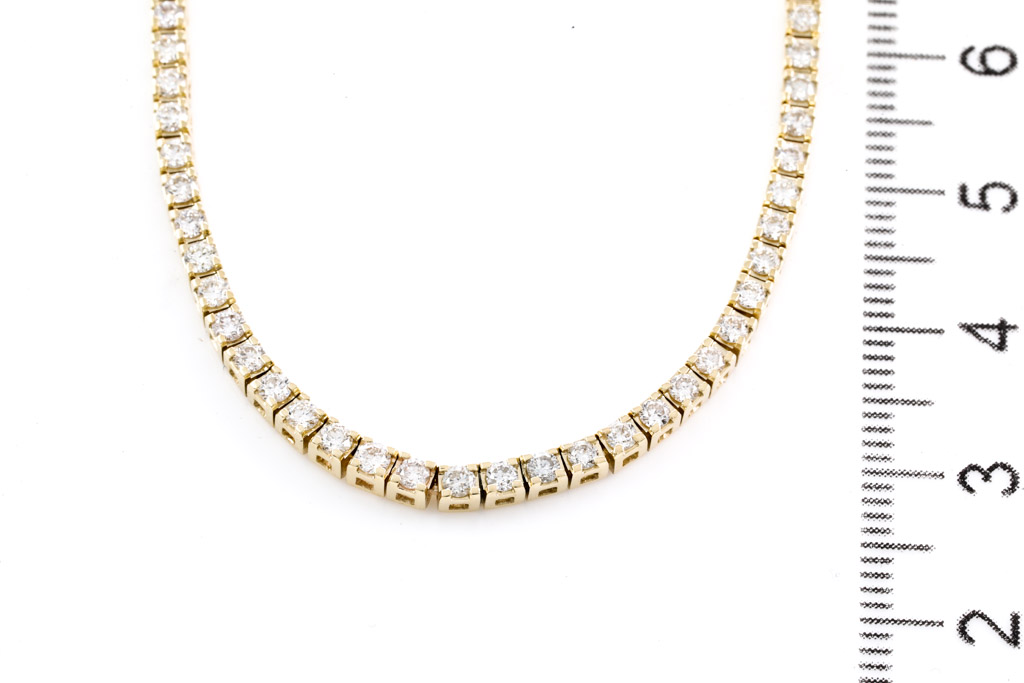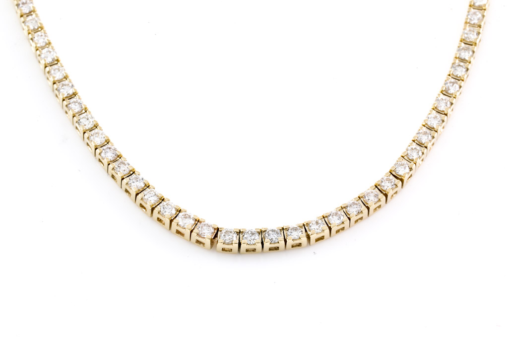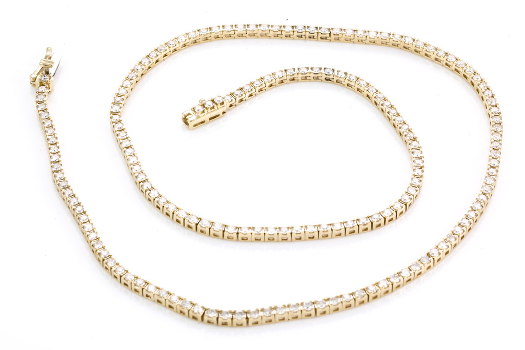 Diamond tennis necklace with 166 round Diamonds totalling 4.85cts (Estimated grading: I-J SI). 14ct yellow gold. Length: 42cm. Weight: 18.3g. With Certificate #416564. (New)