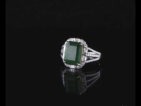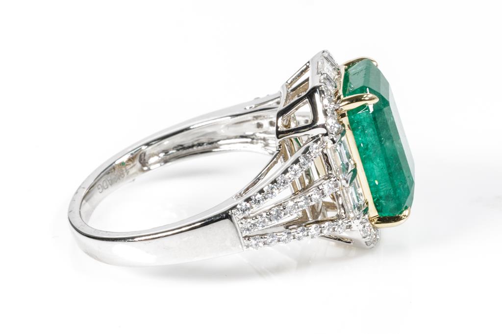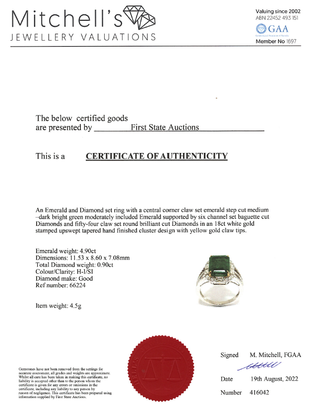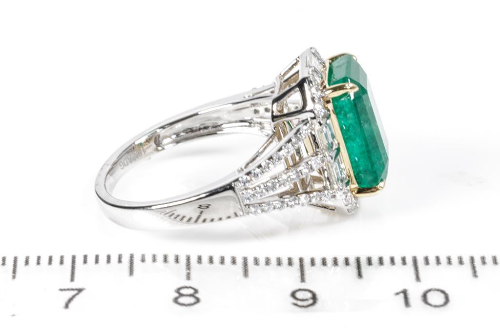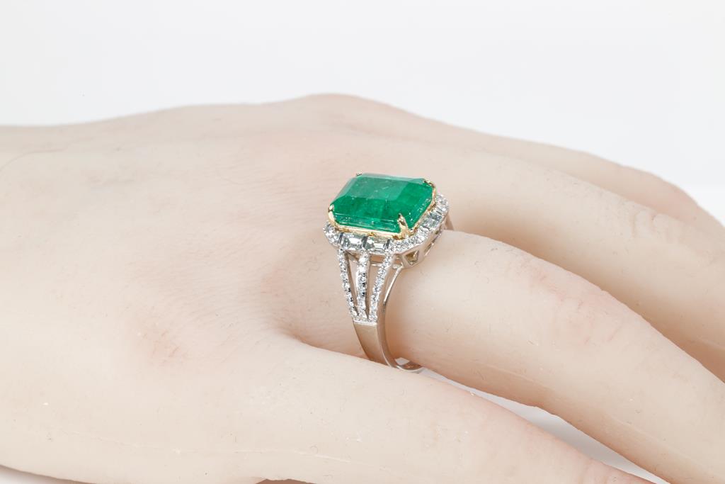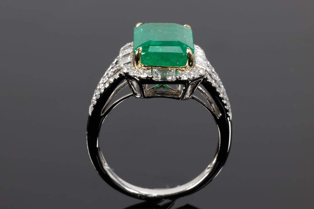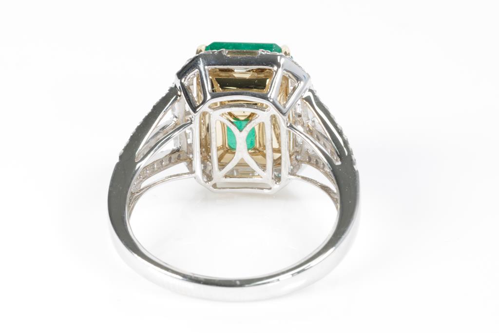 Emerald and Diamond ring with emeral cut Emerald of 4.90ct and baguett cut and round Diamonds totalling 0.90cts (Estimated grading: H-I SI). 18ct yellow gold and white gold. Ring size N1/2 - ring resizing is recommended. Weight: 4.5g. With Certificate #416042. (As new)
