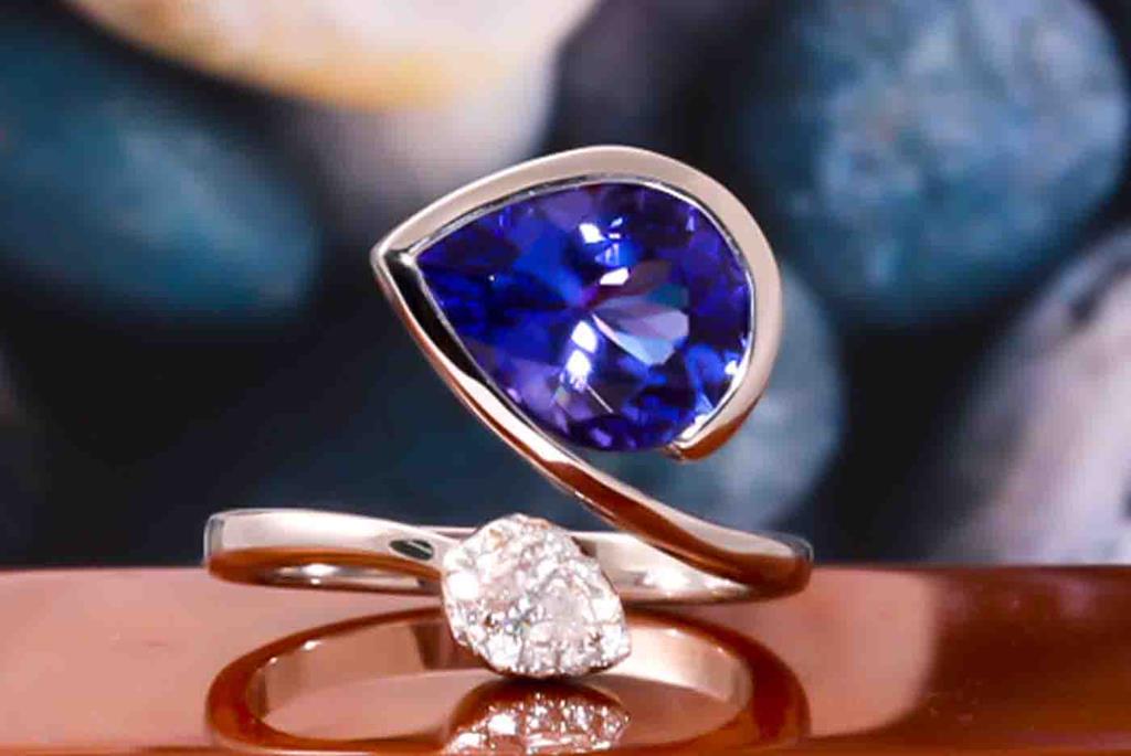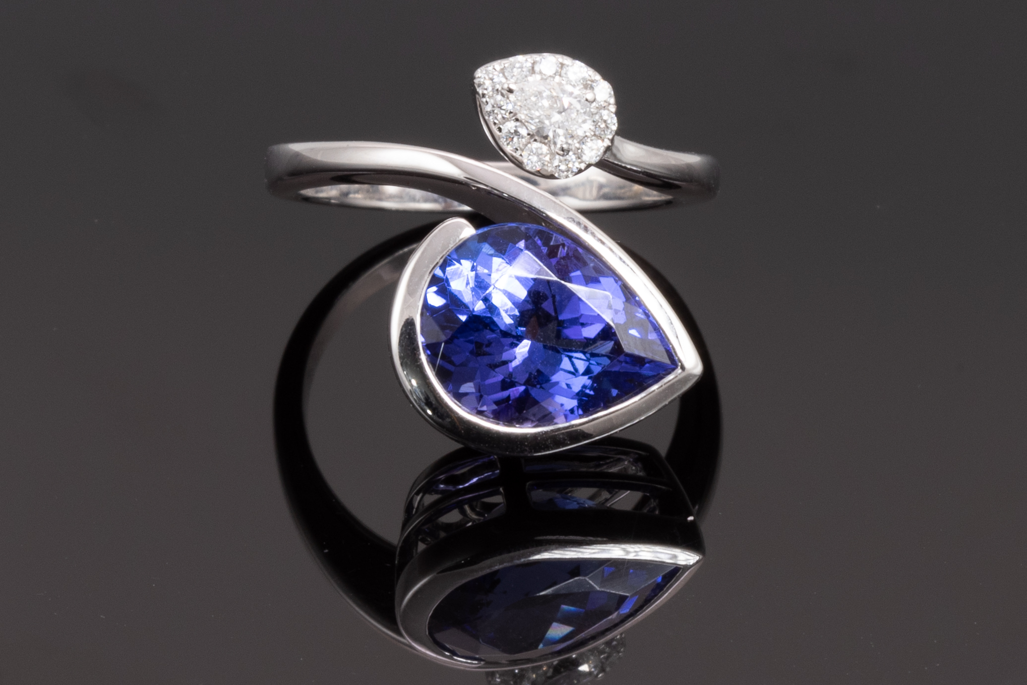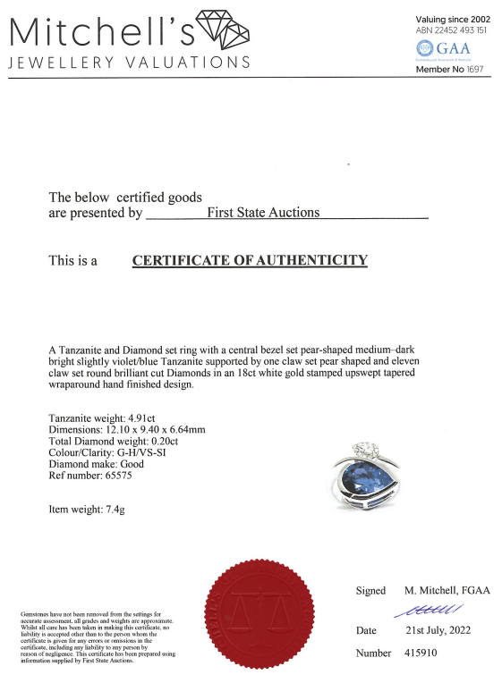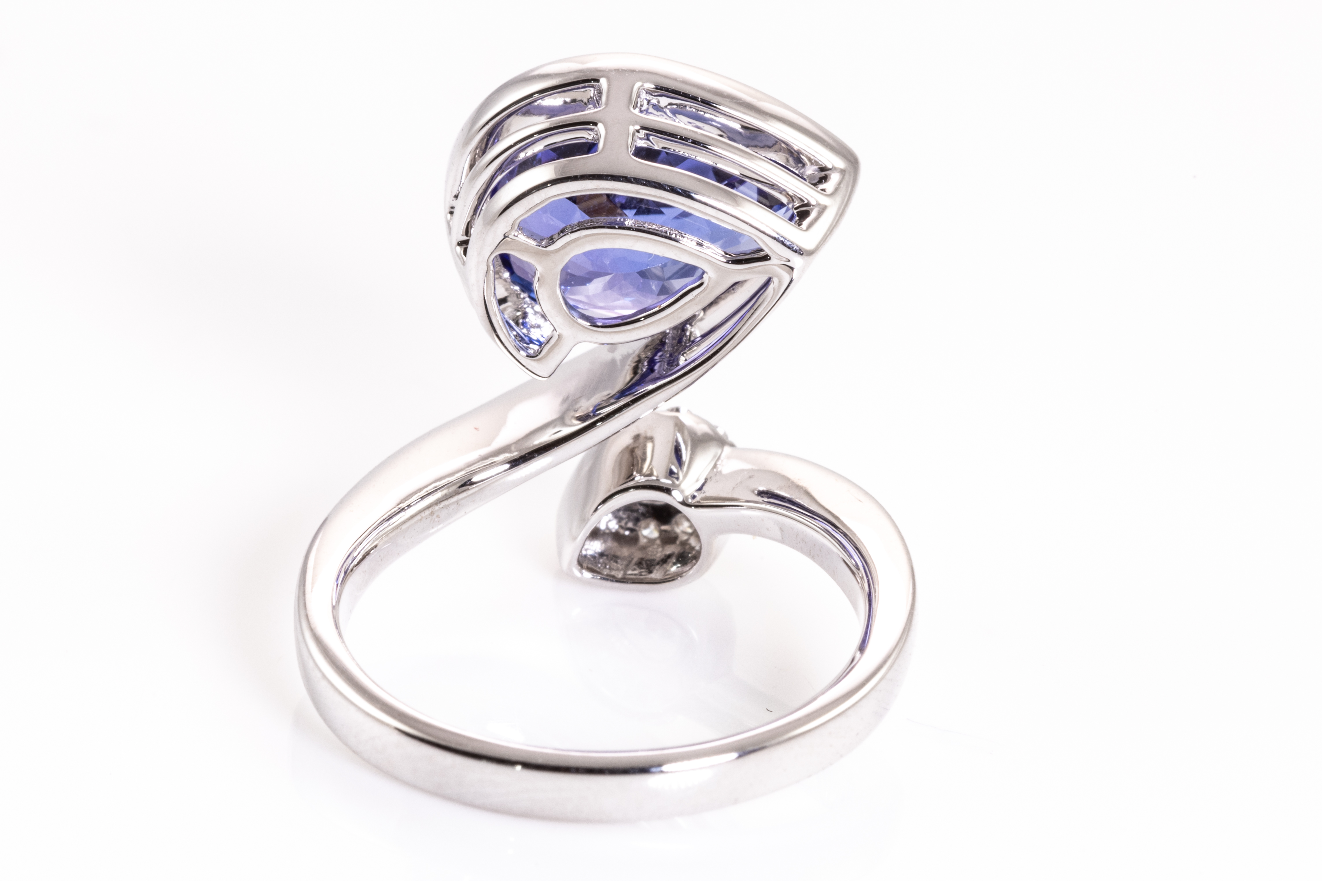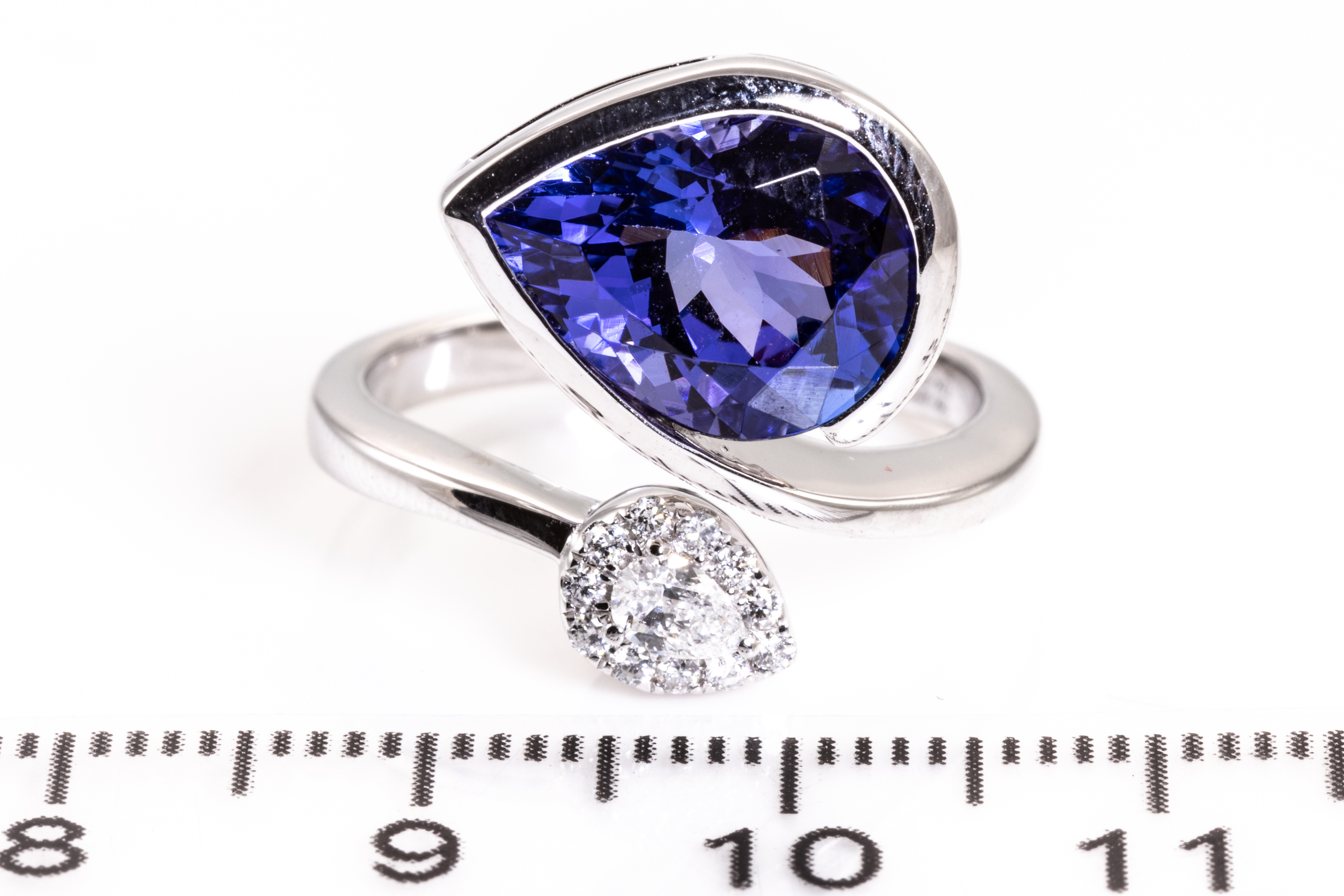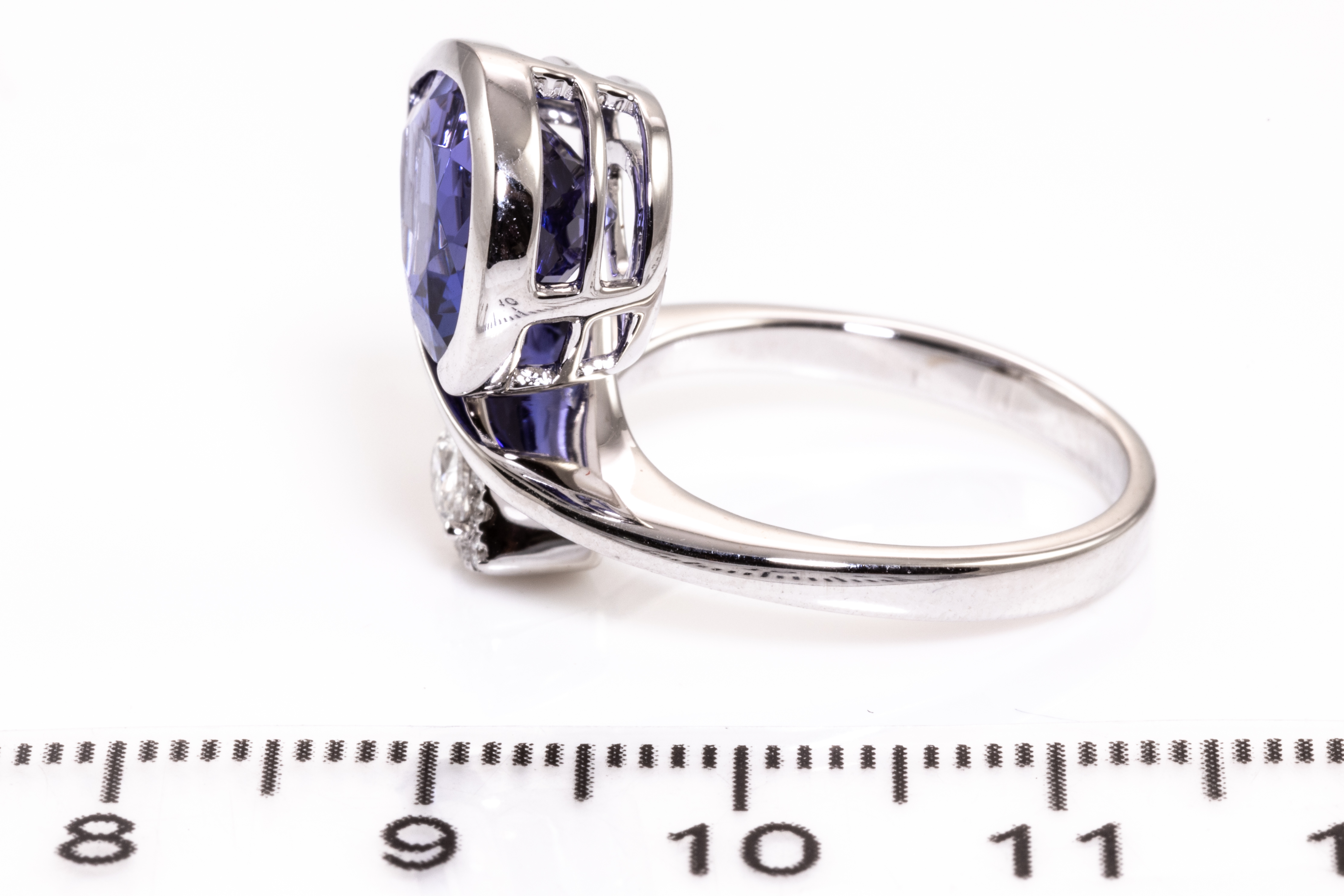 Tanzanite and Diamond ring with pear shape Tanzanite of 4.91ct and round and pear shape Diamonds totalling 0.20cts. 18ct white gold. Ring size N1/2 - ring resizing is not recommended. Weight: 7.4g. With Certificate #415910. (As new)