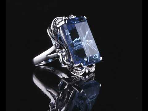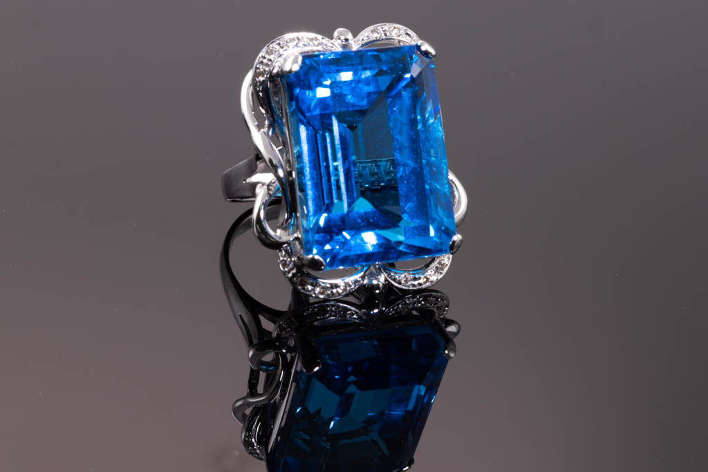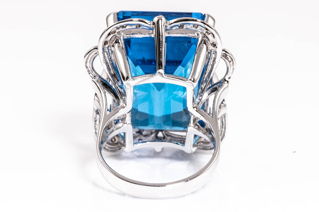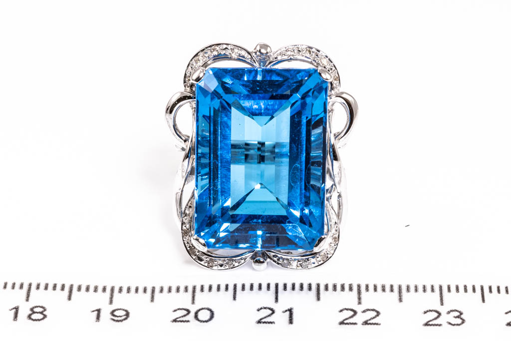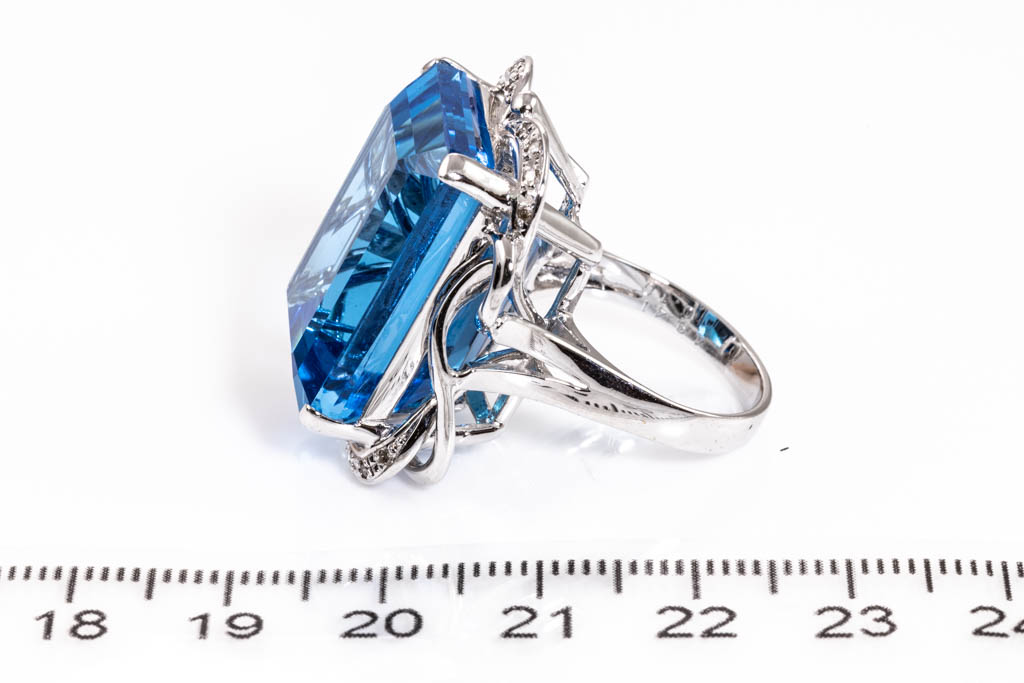 Topaz and Diamond ring with emerald cut blue Topaz of 49.41ct and round Diamonds totalling 0.16cts. 18ct white gold. Ring size N. Weight: 23g. (Pre-owned)
