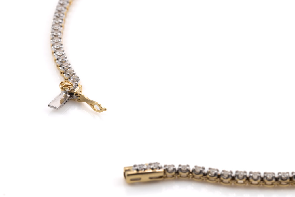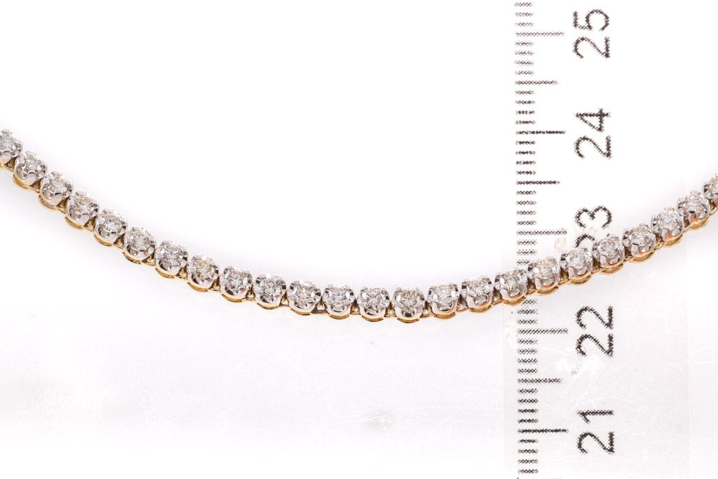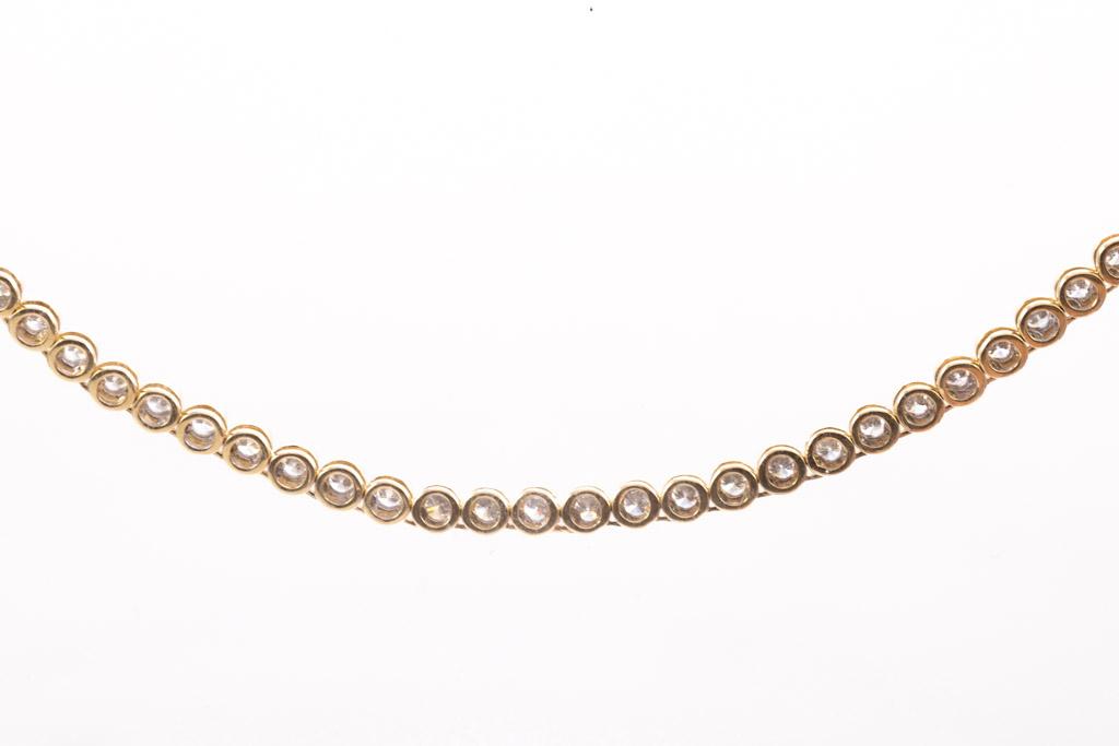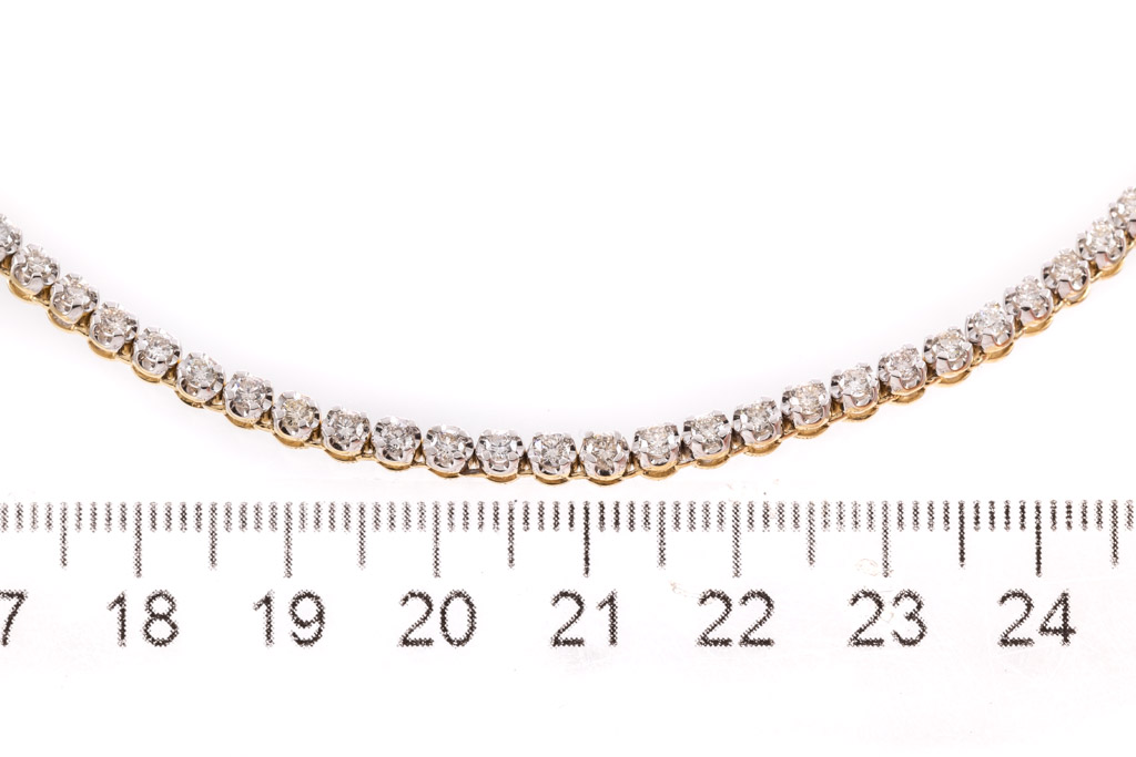 Diamond tennis necklace with 115 round Diamonds totalling 4.97cts (Estimated grading: H-I P1). 14ct yellow gold with white gold claw tips. Length: 40cm. Weight: 19.6g. With Certificate #416523. (New)
