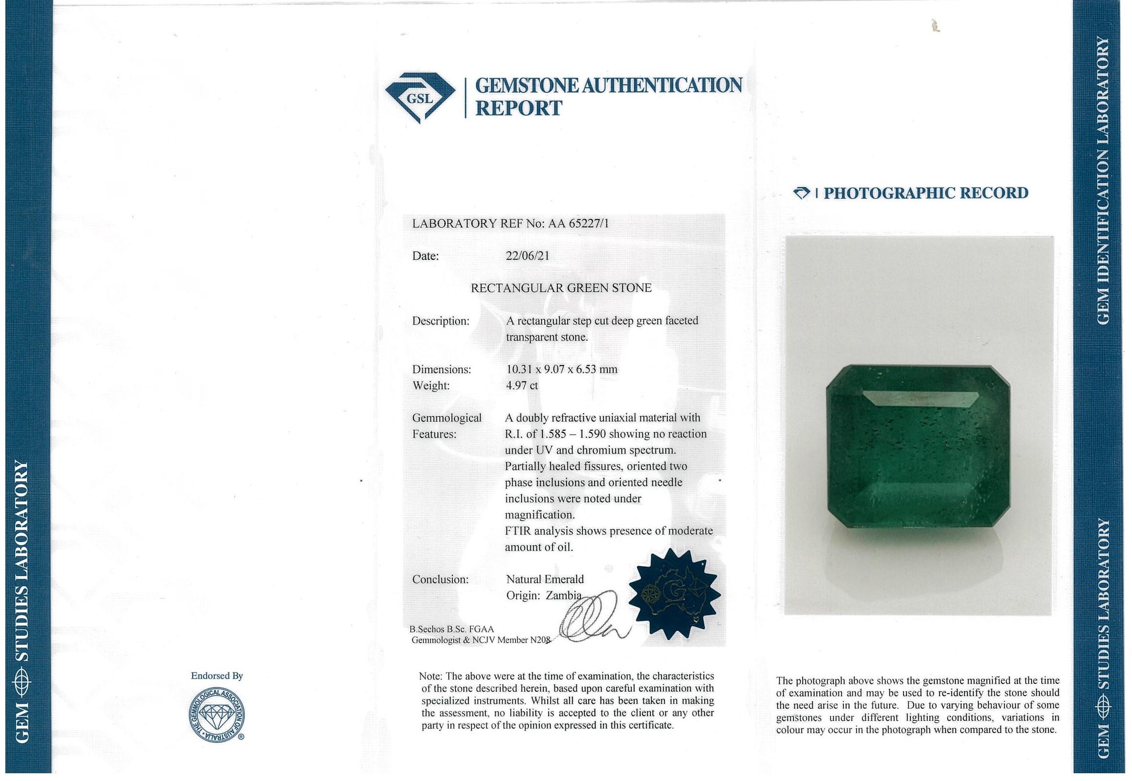 A loose rectangular step cut Zambian Emerald of 4.97ct (with GSL Gemstone report AA 65227/1). (As New)