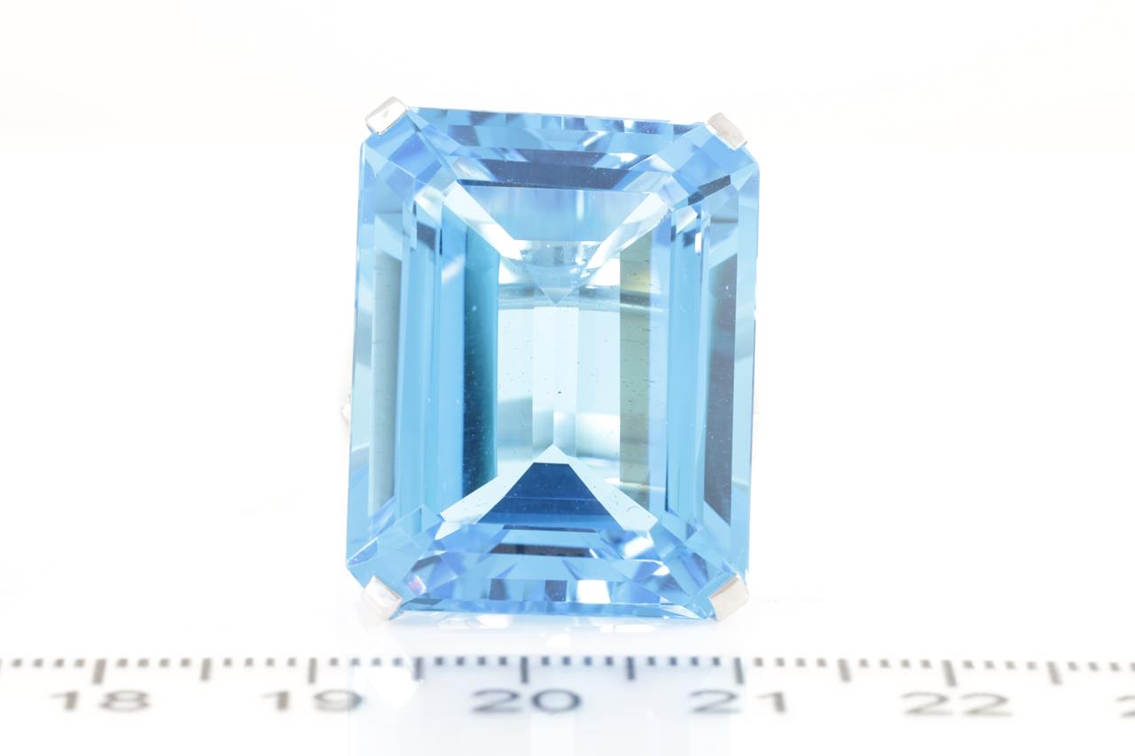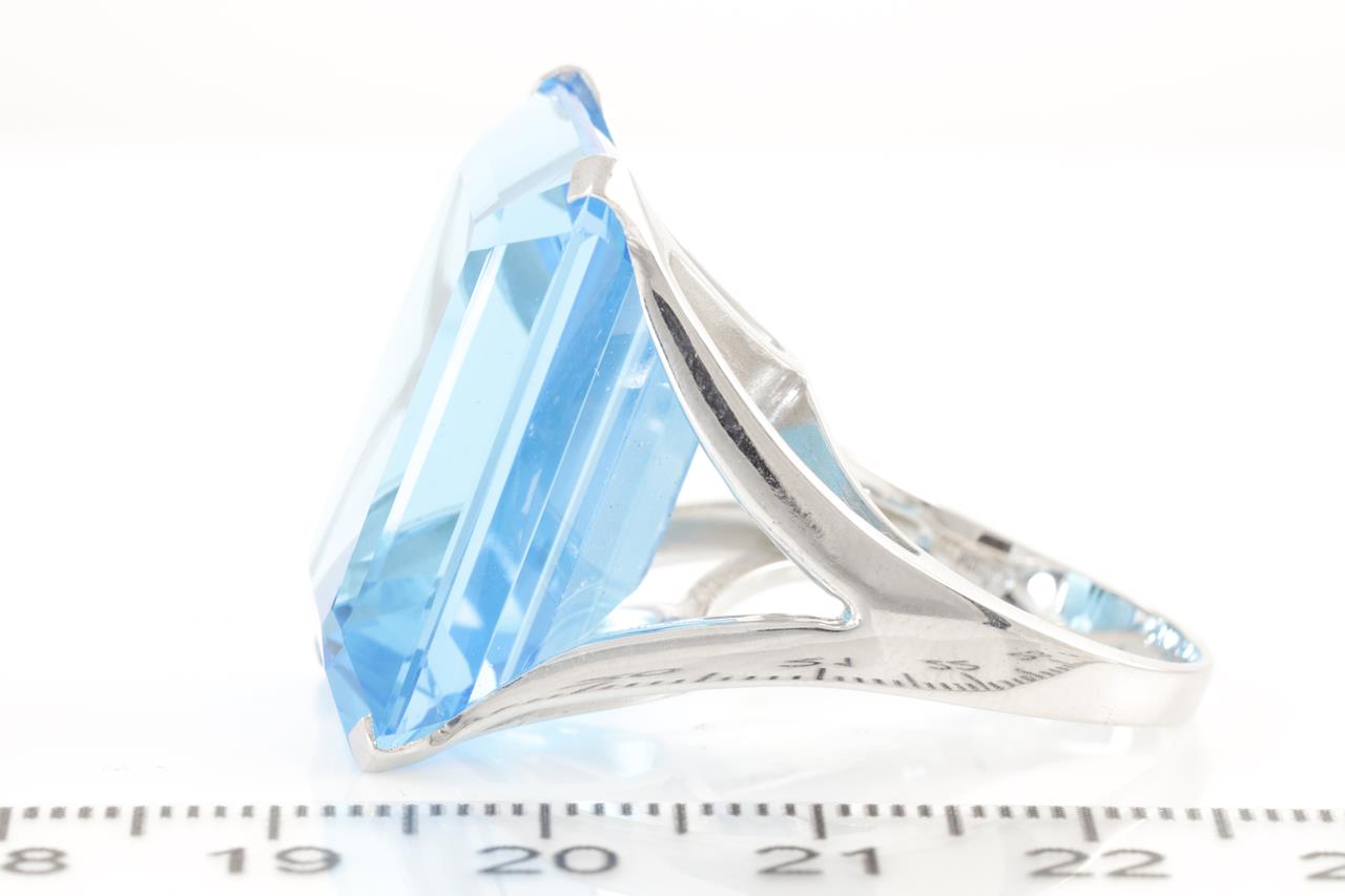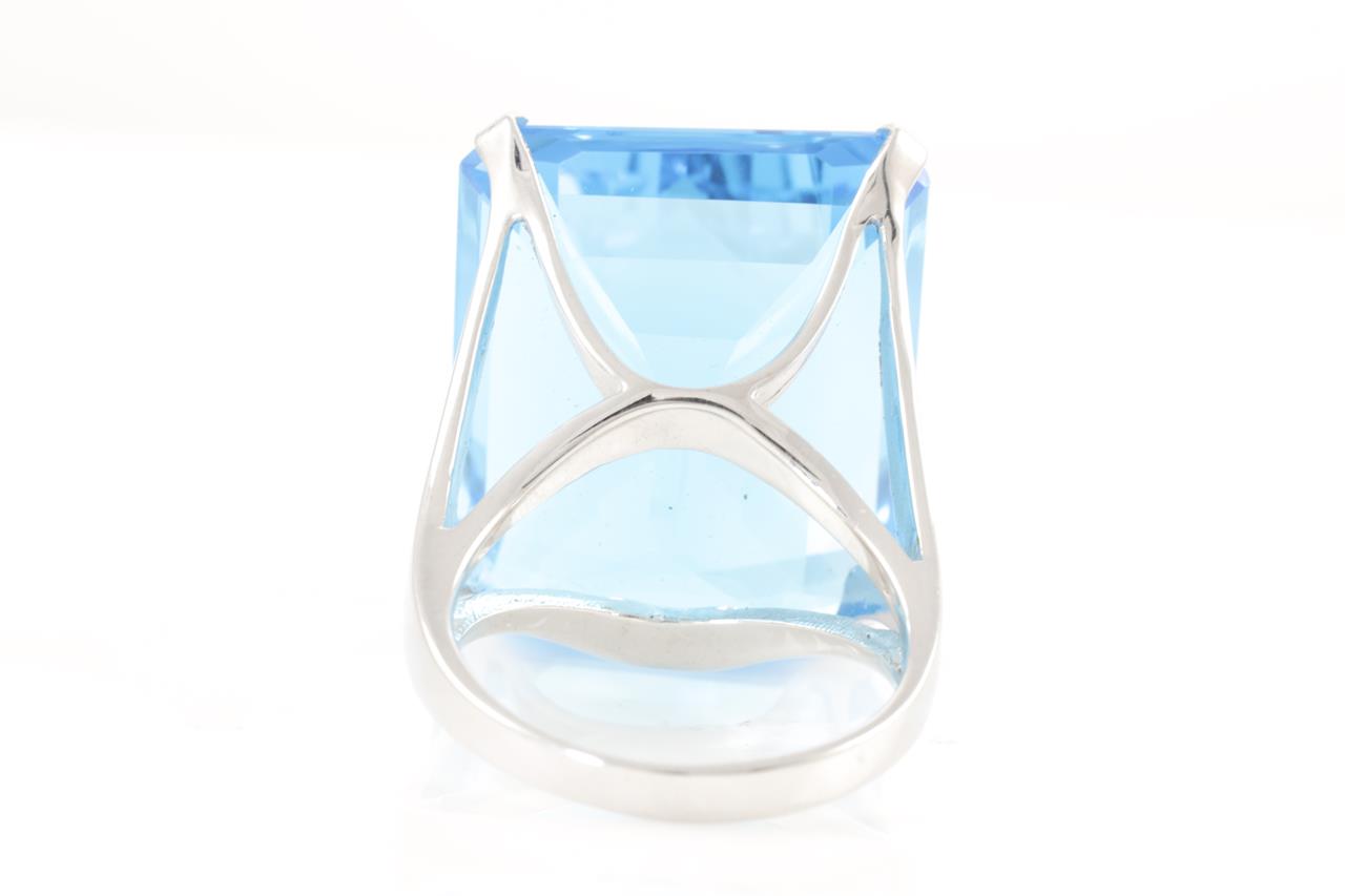 Topaz ring with an emerald cut Blue Topaz of 50.00ct. 18ct white gold. Ring size P - ring resizing is not recommended. Weight: 18.2g (Pre-owned)